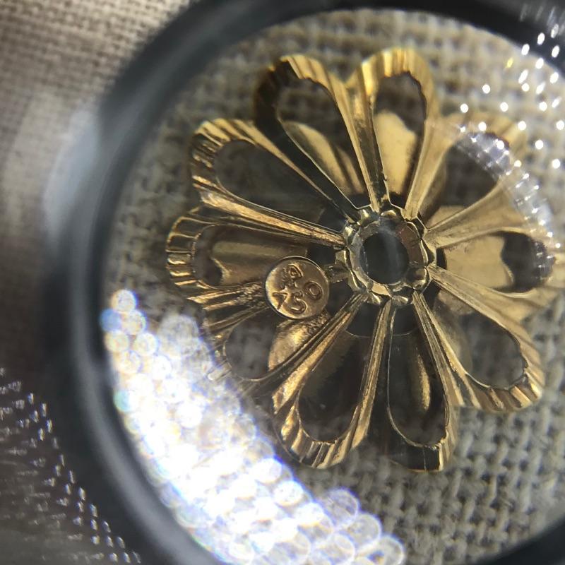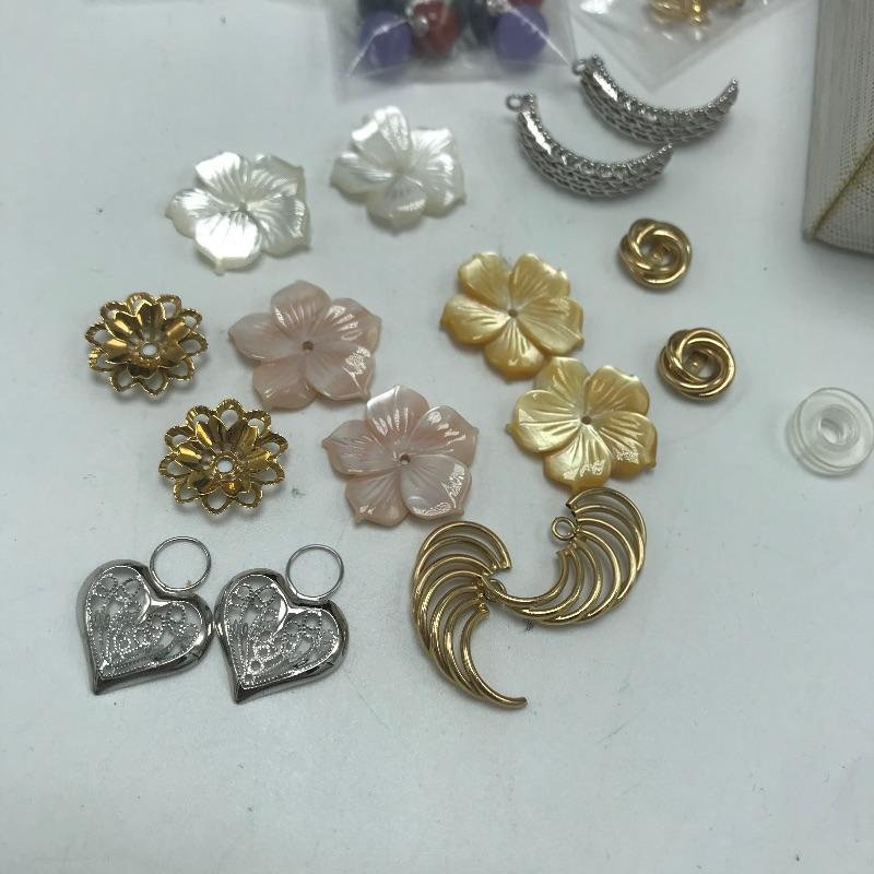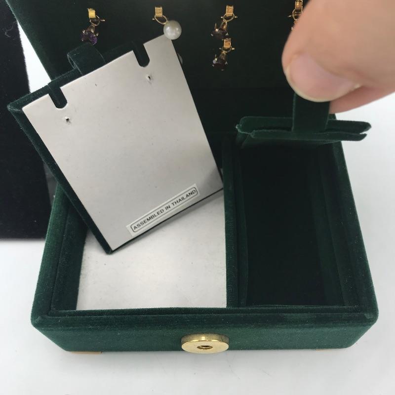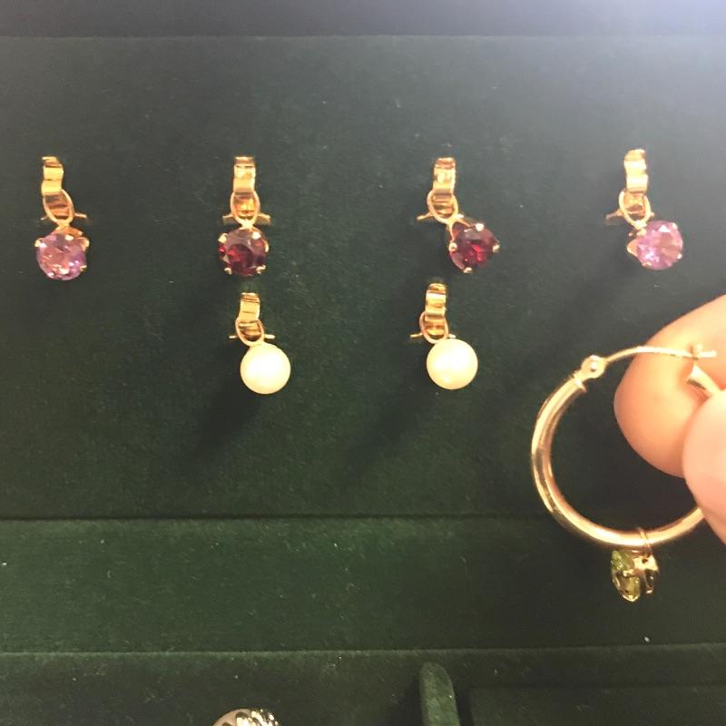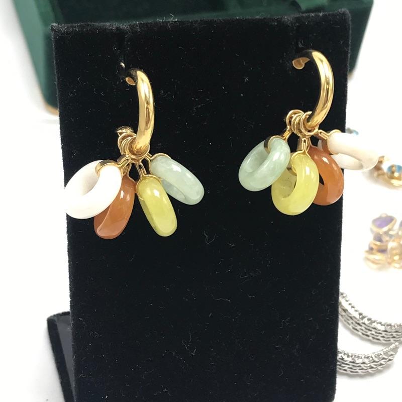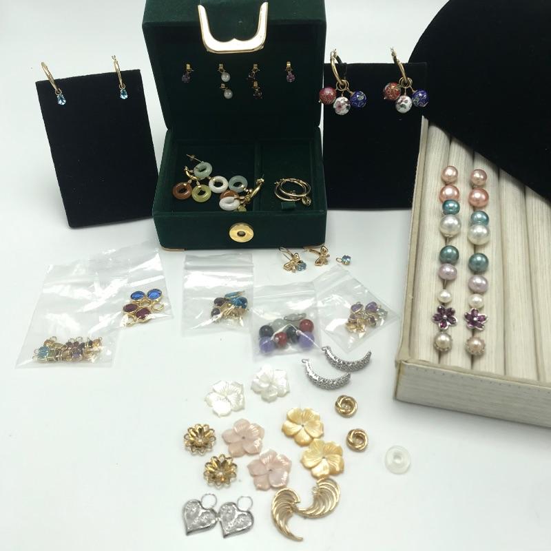 Large selection of pieces to mix and match. Lot includes a green felt box with stones to dangle from gold loops. Pick the color of your choosing. You'll also find several interchangeable hoops, flowers, to get creative with your homemade earrings. Many earrings appear marked as 585 or 14K, 18K or 750 and 925. Only a few earring backs are marked 14K, the others appear unmarked. The metal accessories like wings, flower and hearts all appear to be marked precious, see photo with markings labels. Some gem charms will only fit the bow earrings. Please come to preview and see all the possibilities! Small forest green felt box measures approximately 3.75” x 3.25” x 2.25”. Starting bid based on melt values.