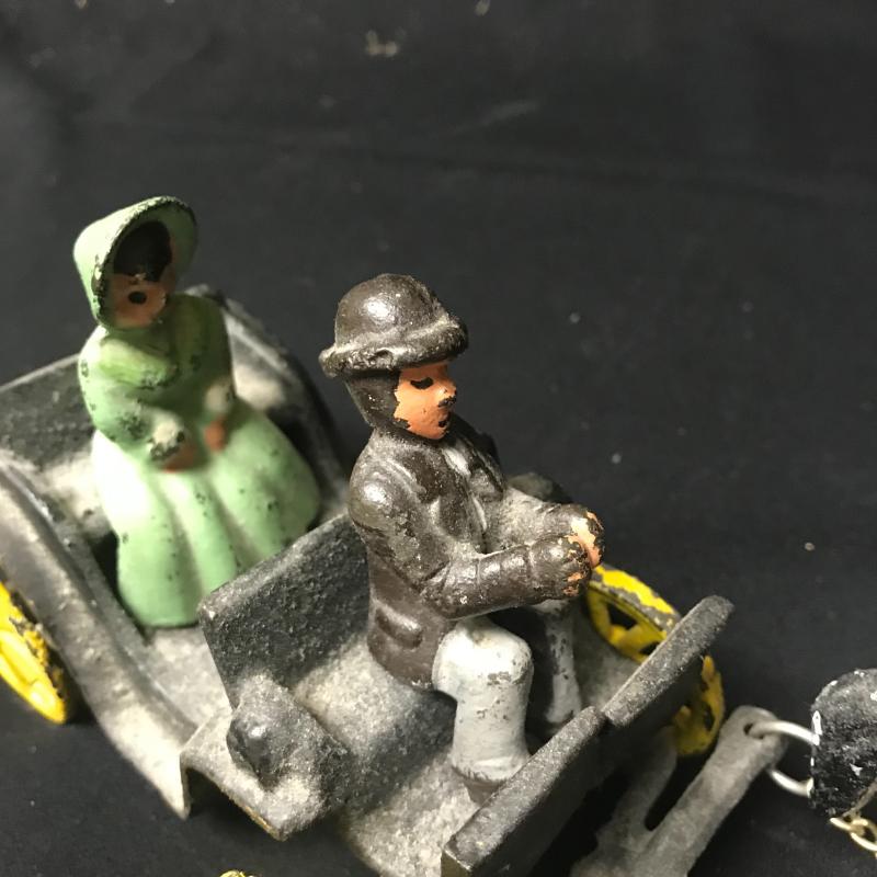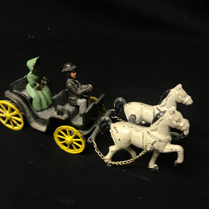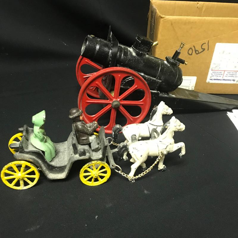 Horse and Carriage comes in four pieces and is missing the reins and some chipped paint. Is good condition otherwise. Canon was a working toy and has pieces and directions but can not verify it still fires. Local pick up only.