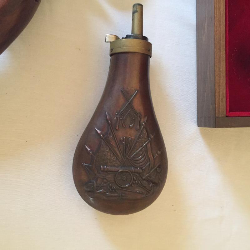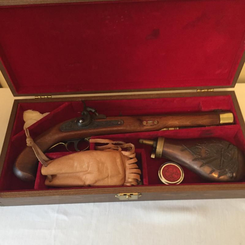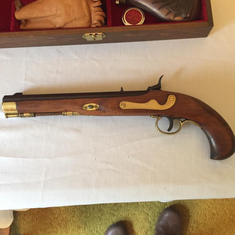 45 Caliber Black Powder Only Percussion Pistol With Reproduction Powder Flask in Case with Accoutrements