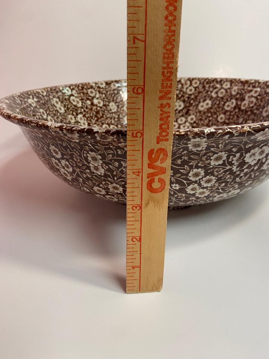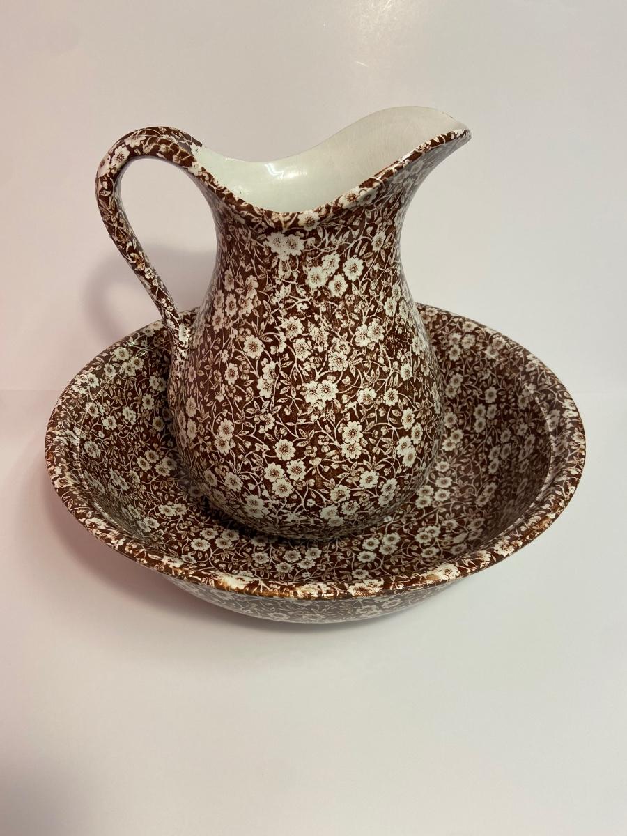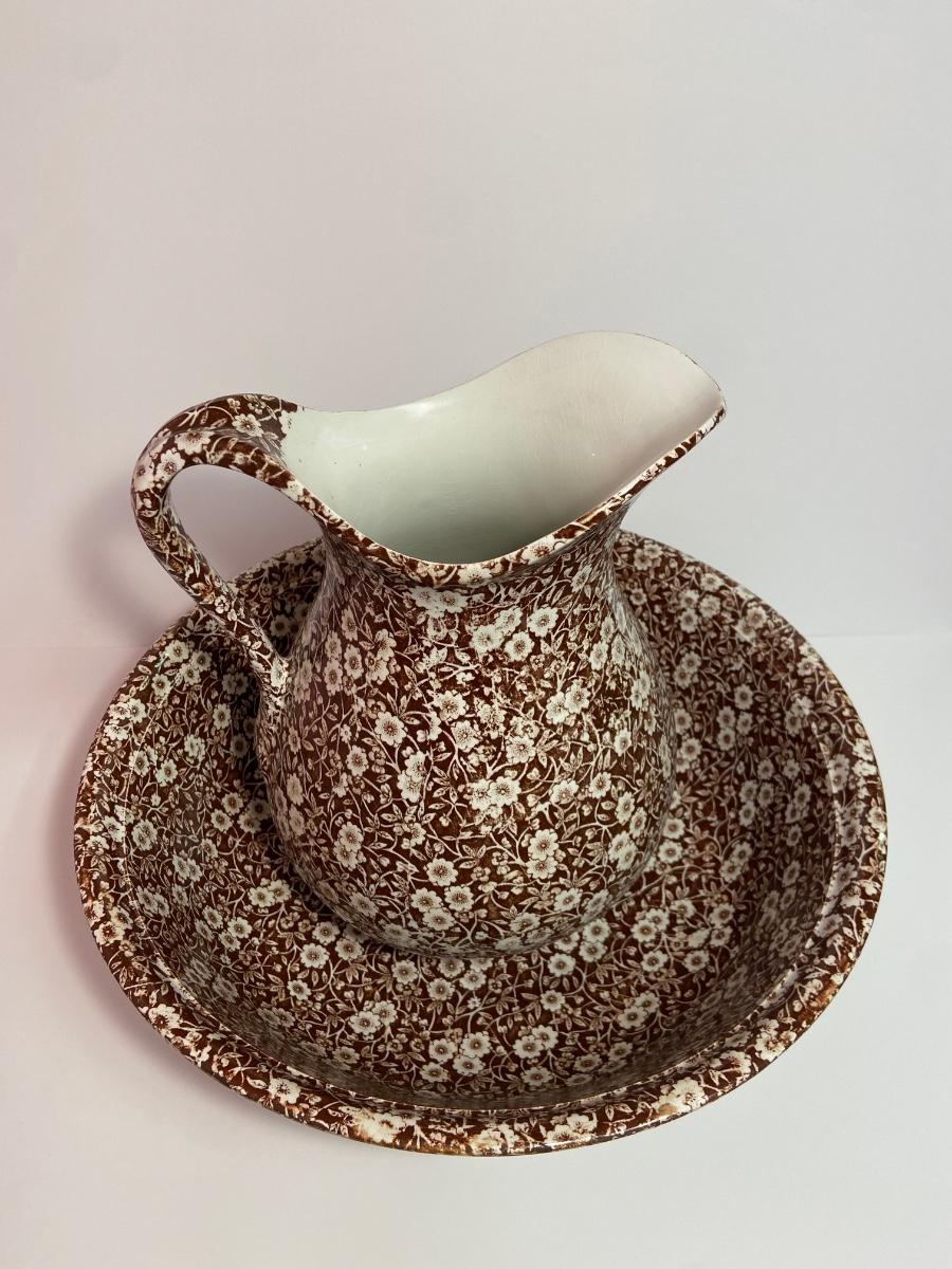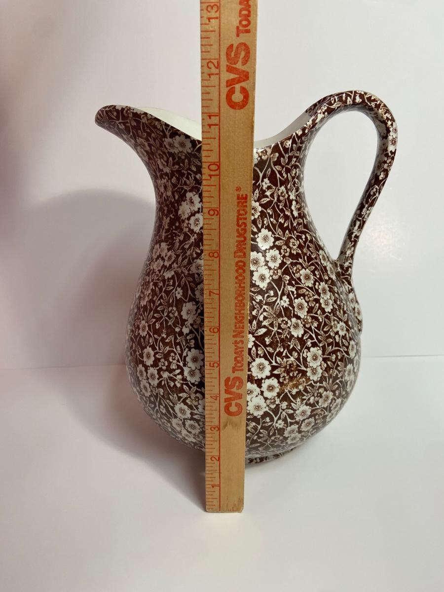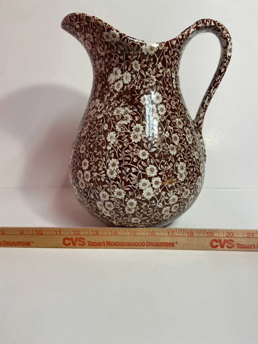 BROWN CALICO by Staffordshire, 128 oz OVERSIZED Pitcher & Wash Basin, Royal Crownford Ironstone, This is an EXTREMELY LARGE pitcher and wash basin. The pitcher is 11 1/2 inches tall and the wash basin is 15 inches across.
