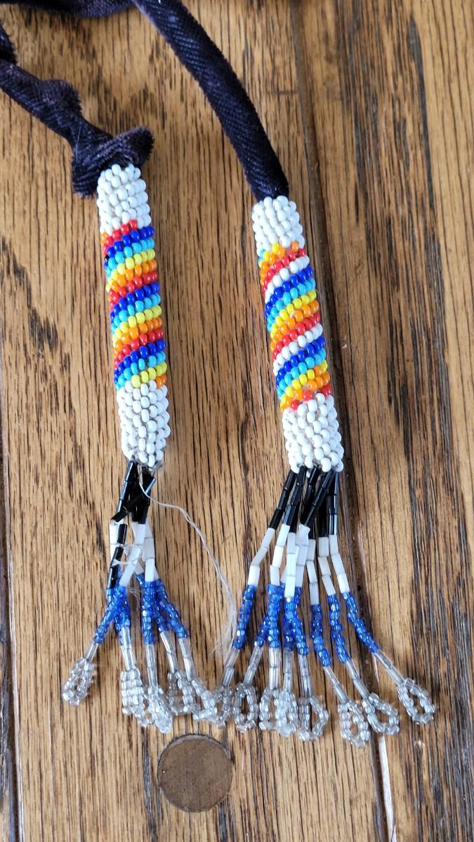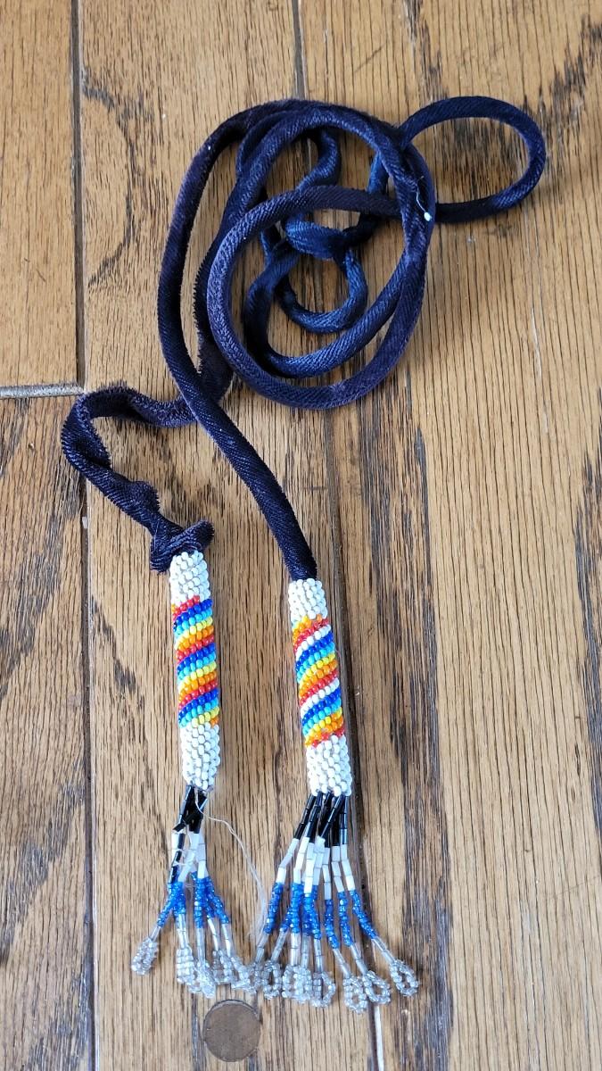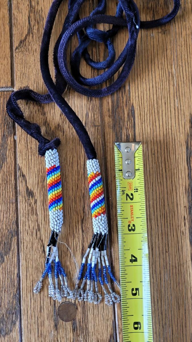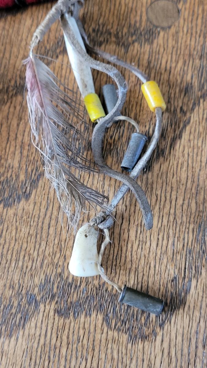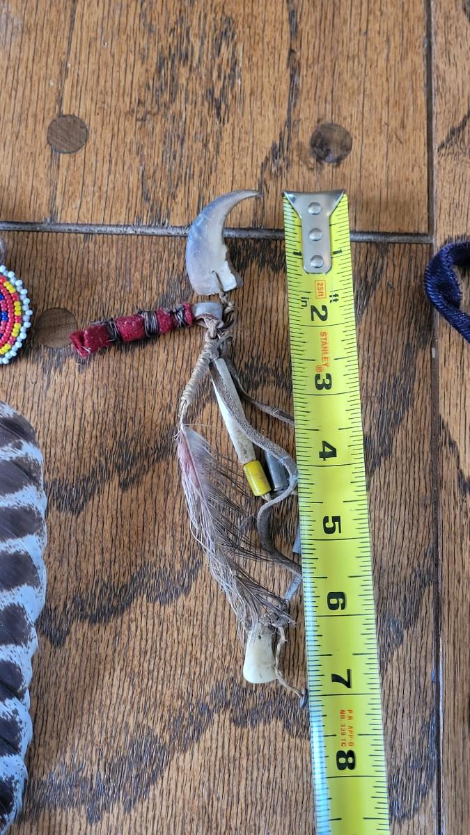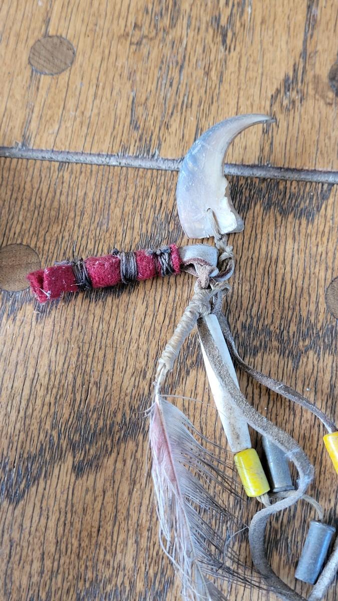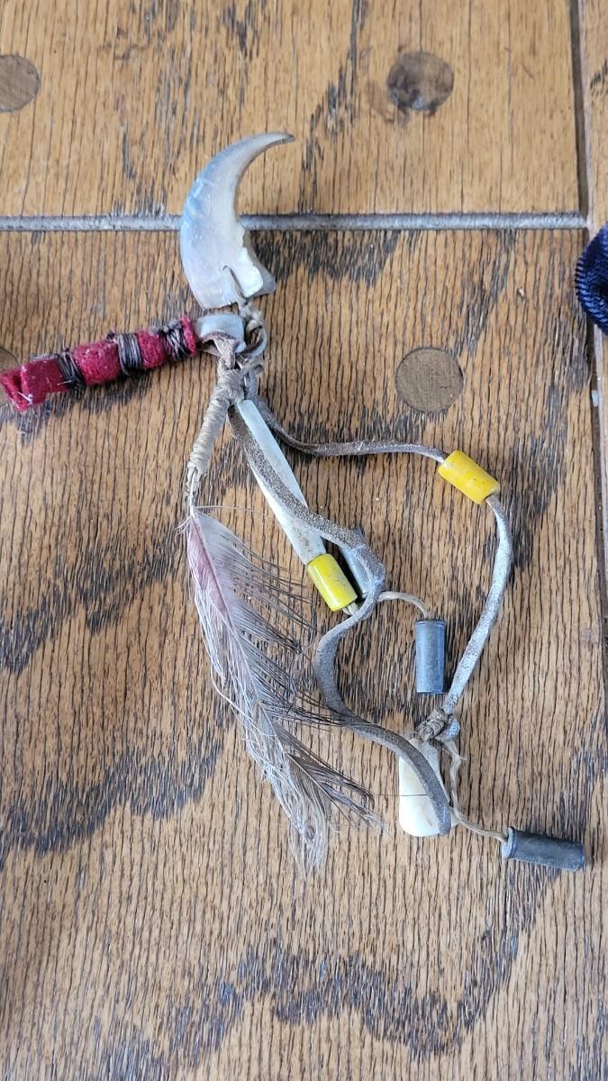 One adornment has teeth, a claw and bullet shells. One beaded Concho with dangling feathers. One velvet rope with Beaded Tassels.
