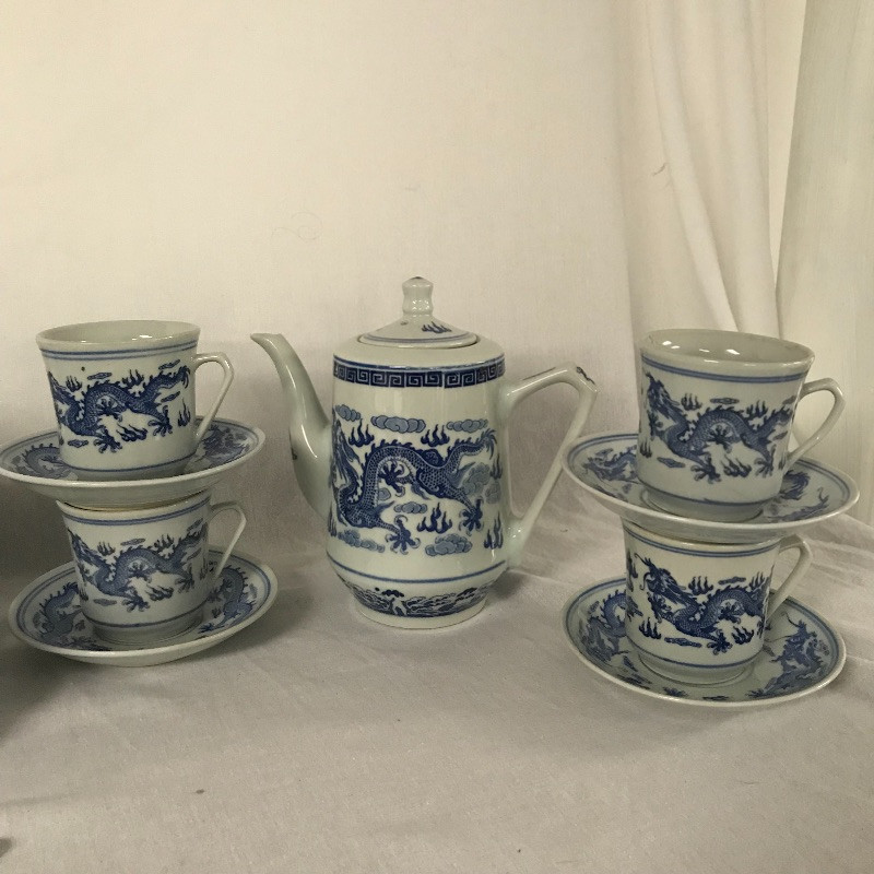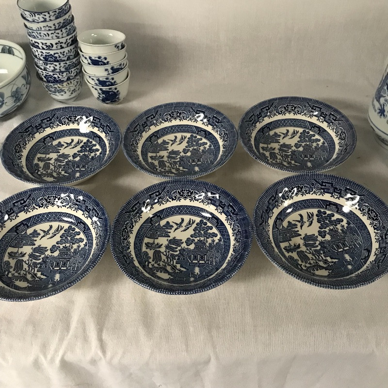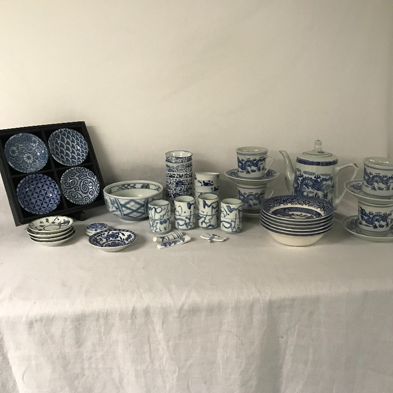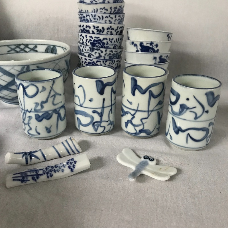 A collection of Japanes, English and Chinese made dishes in Asian style. Sweet tea set with tea pot and four cups and saucers, several chopsticks and sauce bowls and sake cups and more. Local pick up only.
