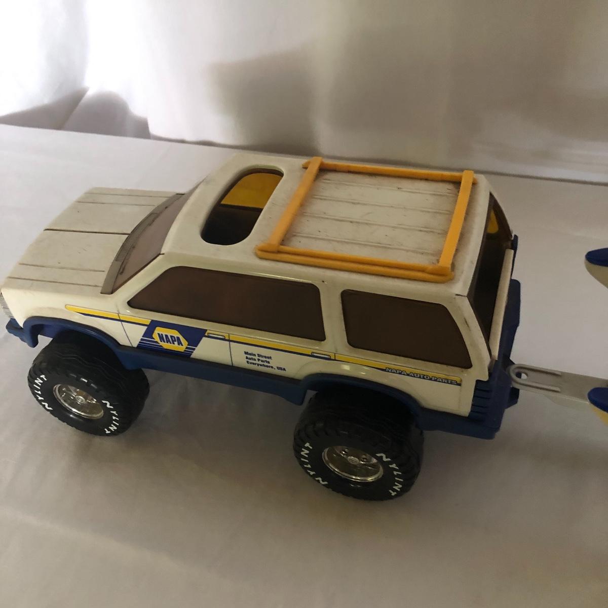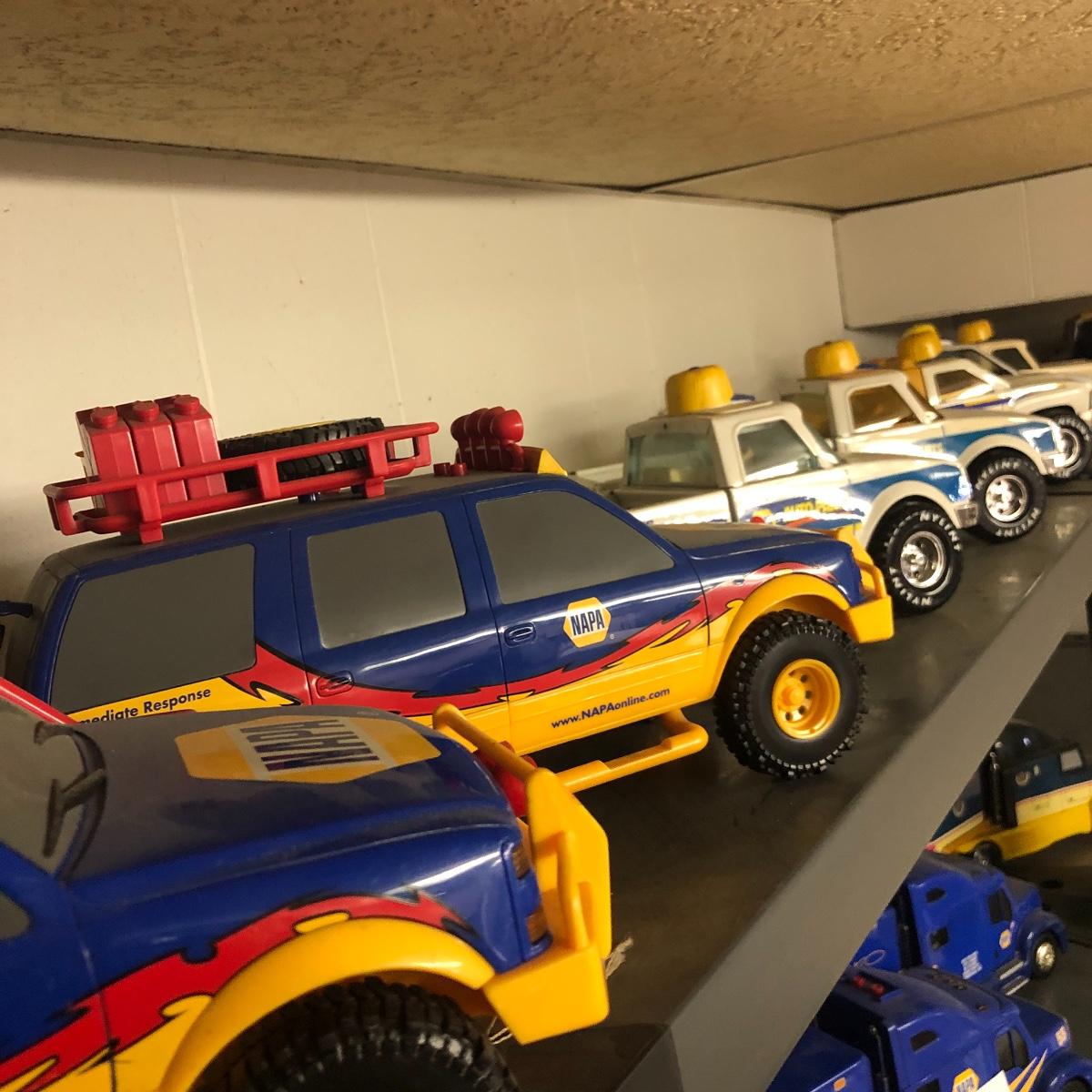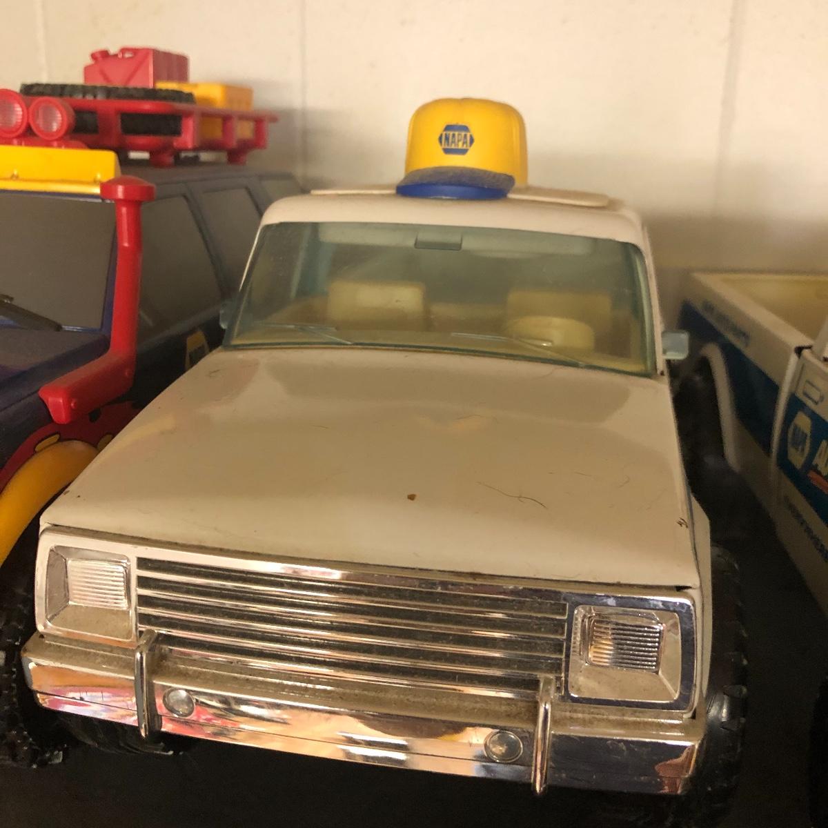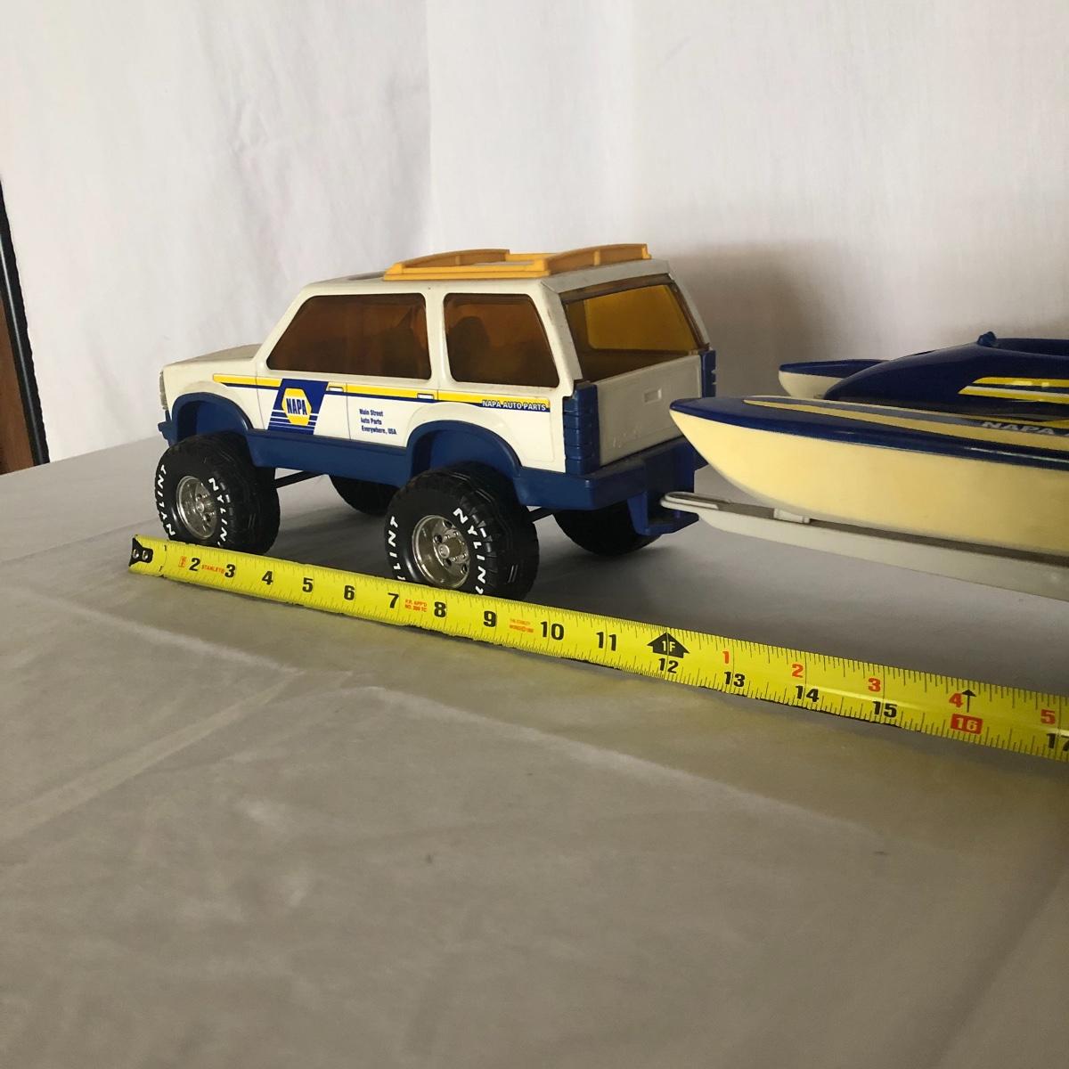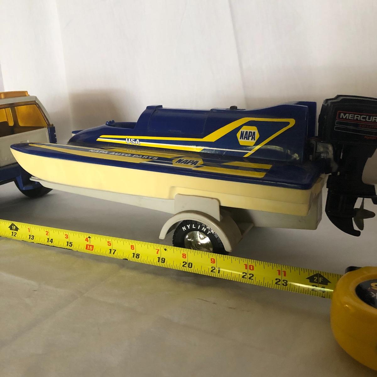 What a cool collection! This lot includes eight trucks and one boat. Of the eight trucks, five are pick-up trucks and three are a SUV style. One SUV does not have the bike on the back of the vehicle. Four of the trucks are made of metal (note the bottom of trucks.) The Nylint truck, two NAPA SUVs and boat take batteries. One metal pick up has a small crack in the window. Some dust and sun bleaching noted. Shipping Available.