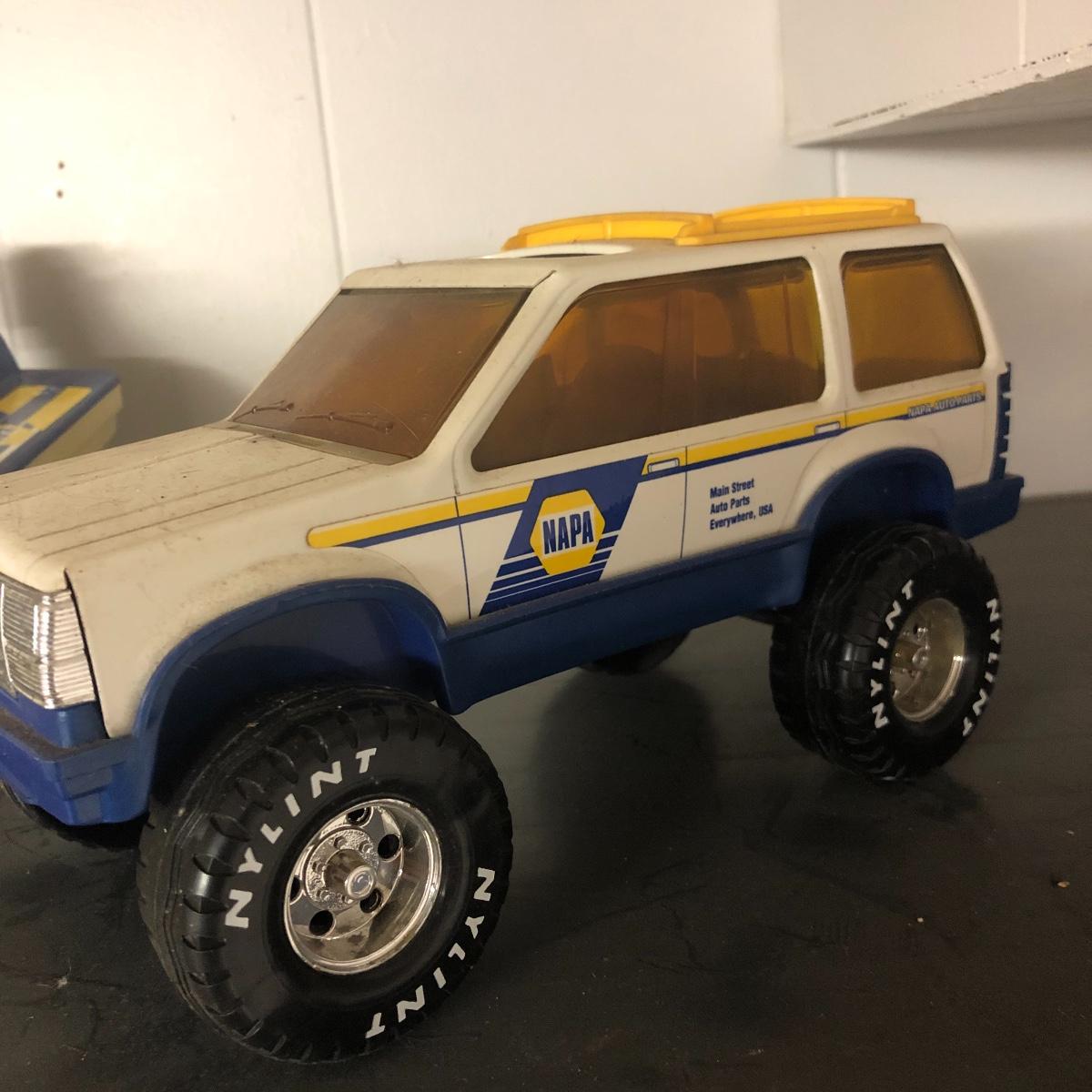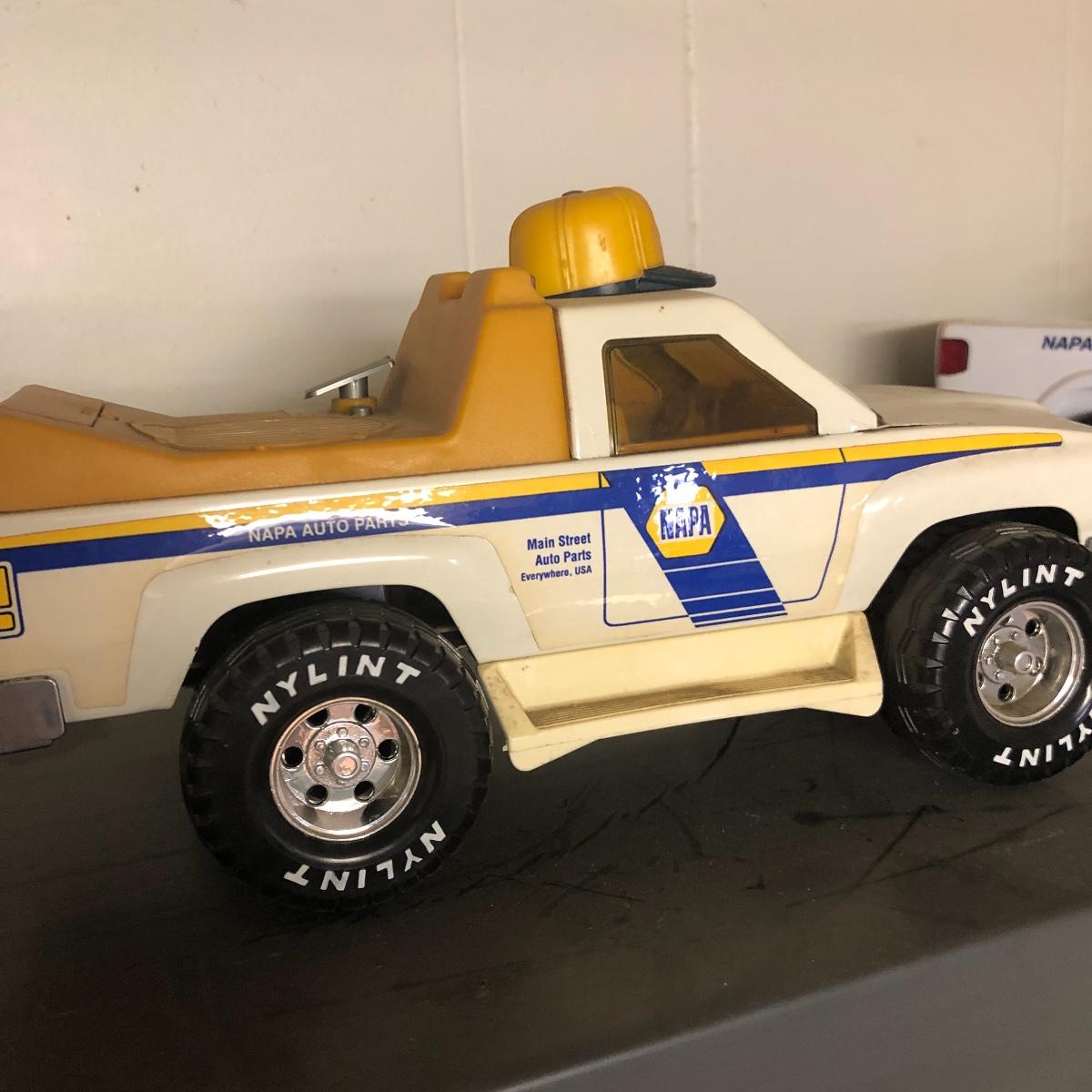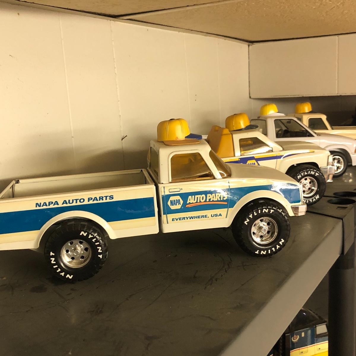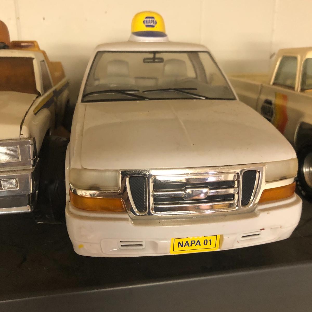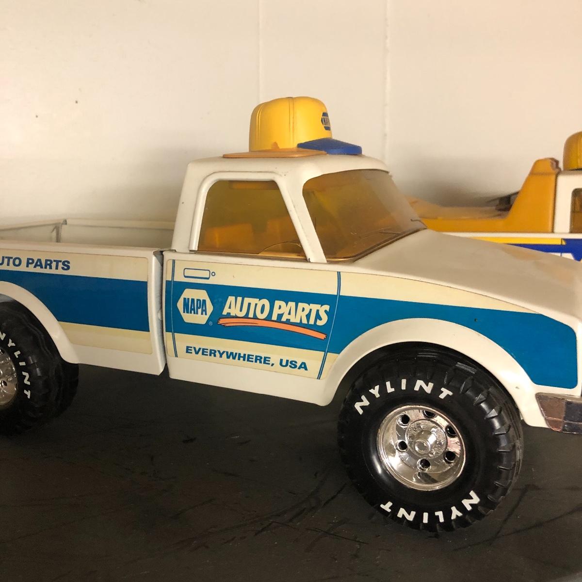 What a cool collection! This lot includes eight trucks and one boat. Of the eight trucks, five are pick-up trucks and three are a SUV style. One SUV does not have the bike on the back of the vehicle. Four of the trucks are made of metal (note the bottom of trucks.) The Nylint truck, two NAPA SUVs and boat take batteries. One metal pick up has a small crack in the window. Some dust and sun bleaching noted. Shipping Available.