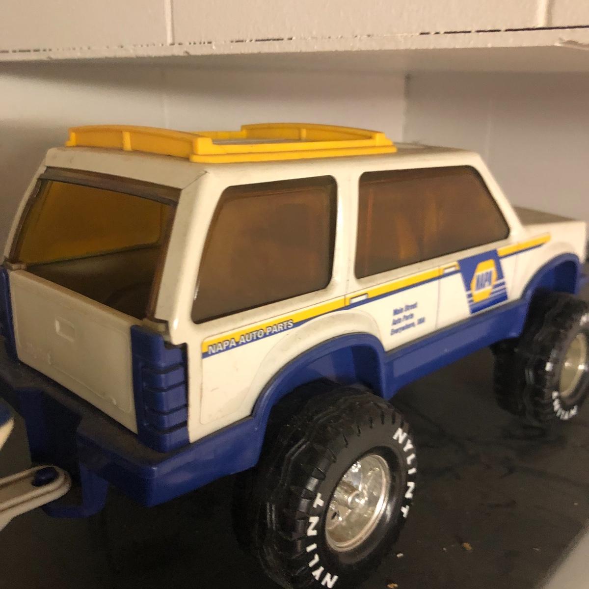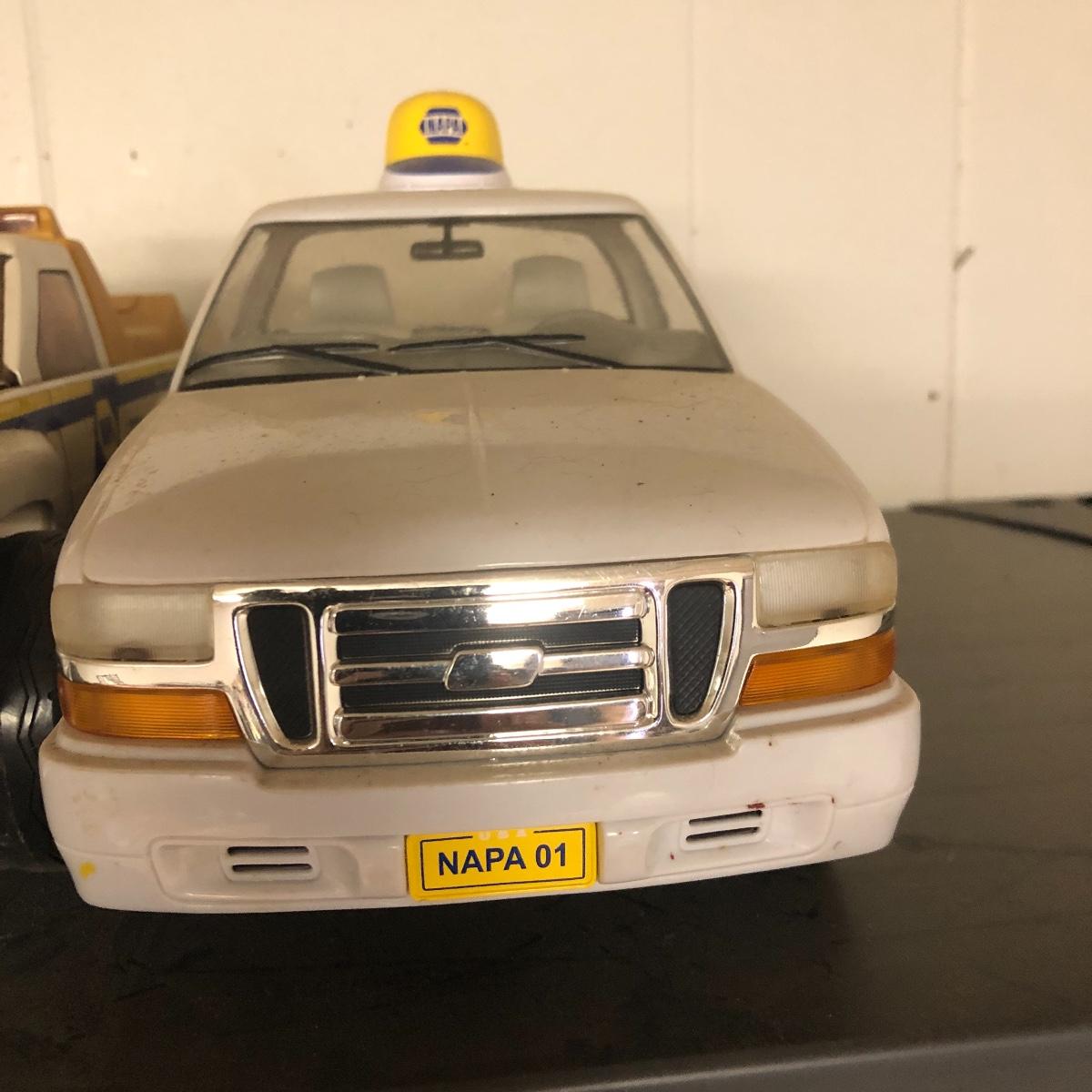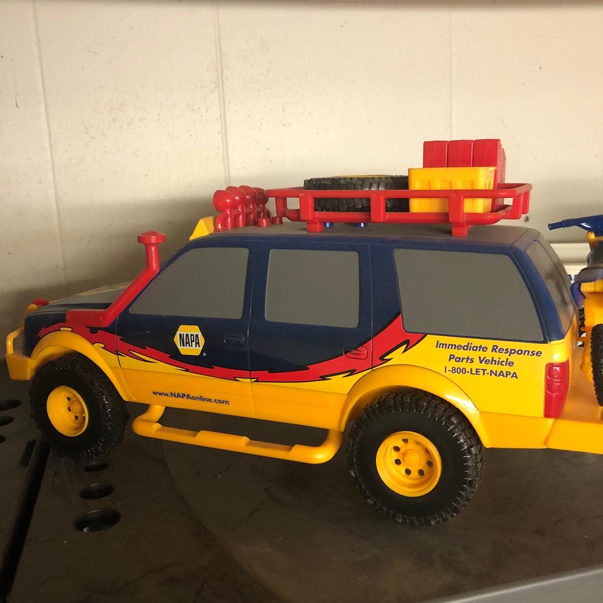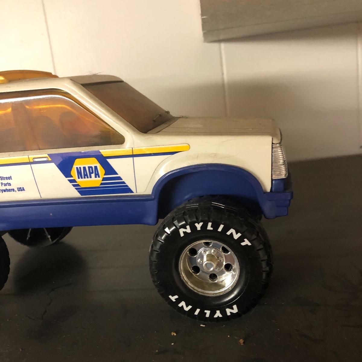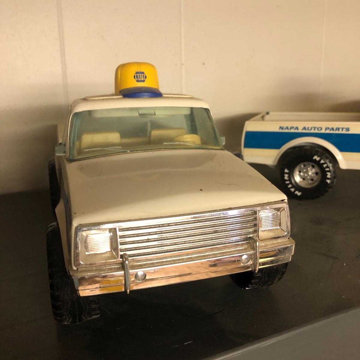 What a cool collection! This lot includes eight trucks and one boat. Of the eight trucks, five are pick-up trucks and three are a SUV style. One SUV does not have the bike on the back of the vehicle. Four of the trucks are made of metal (note the bottom of trucks.) The Nylint truck, two NAPA SUVs and boat take batteries. One metal pick up has a small crack in the window. Some dust and sun bleaching noted. Shipping Available.