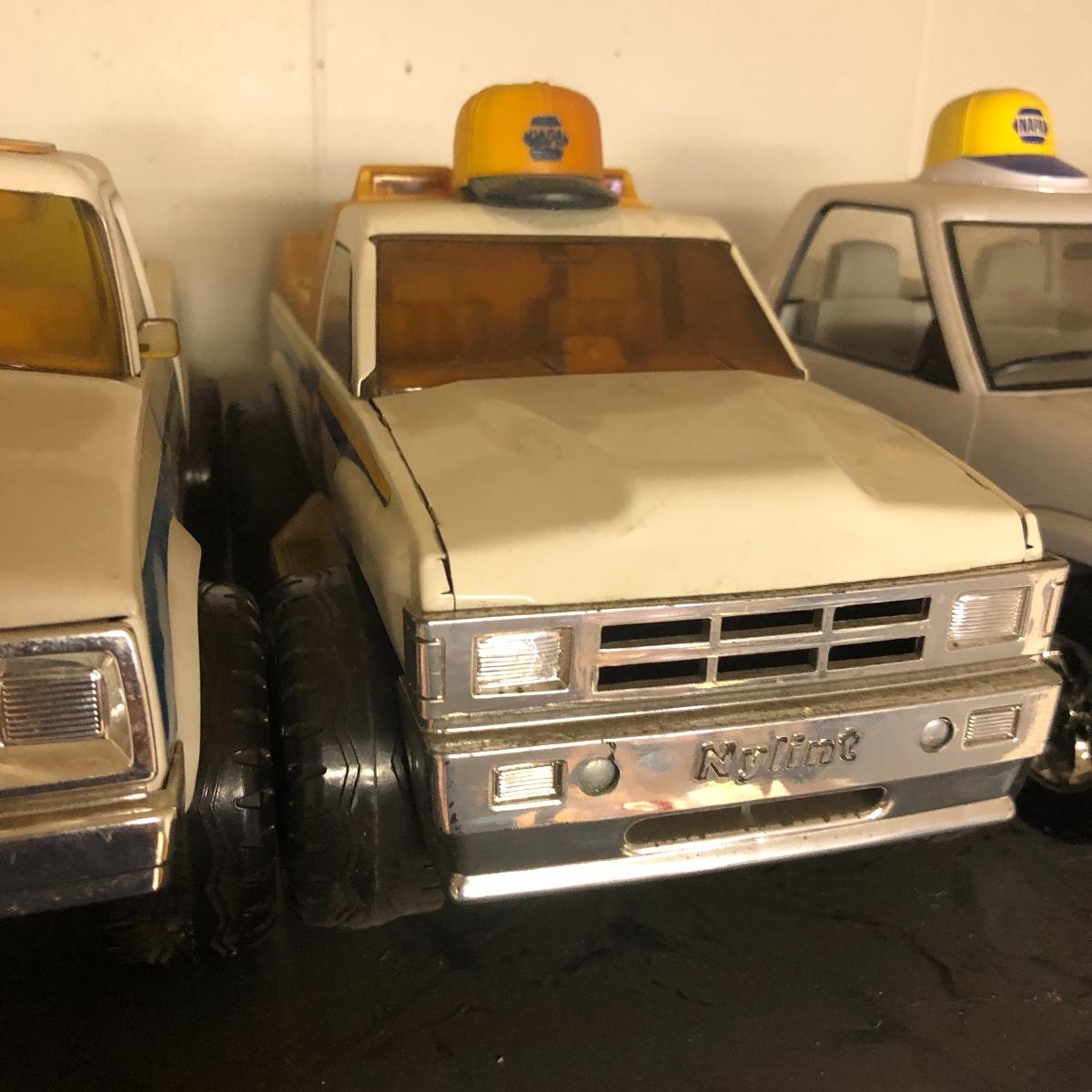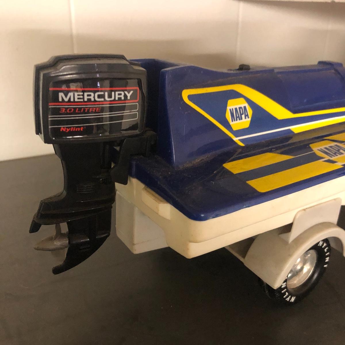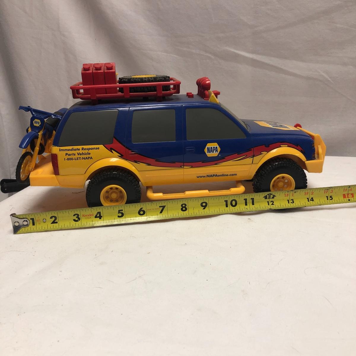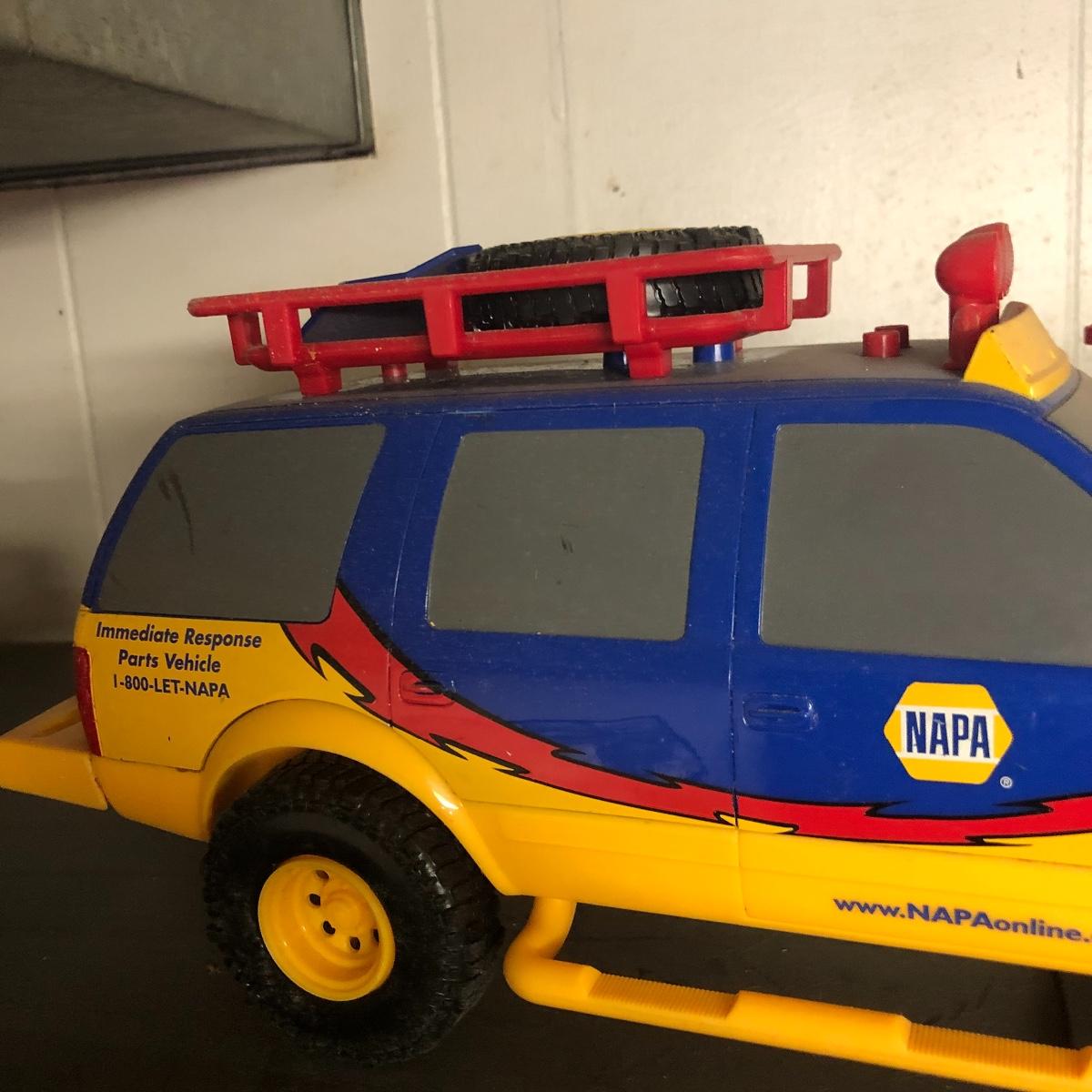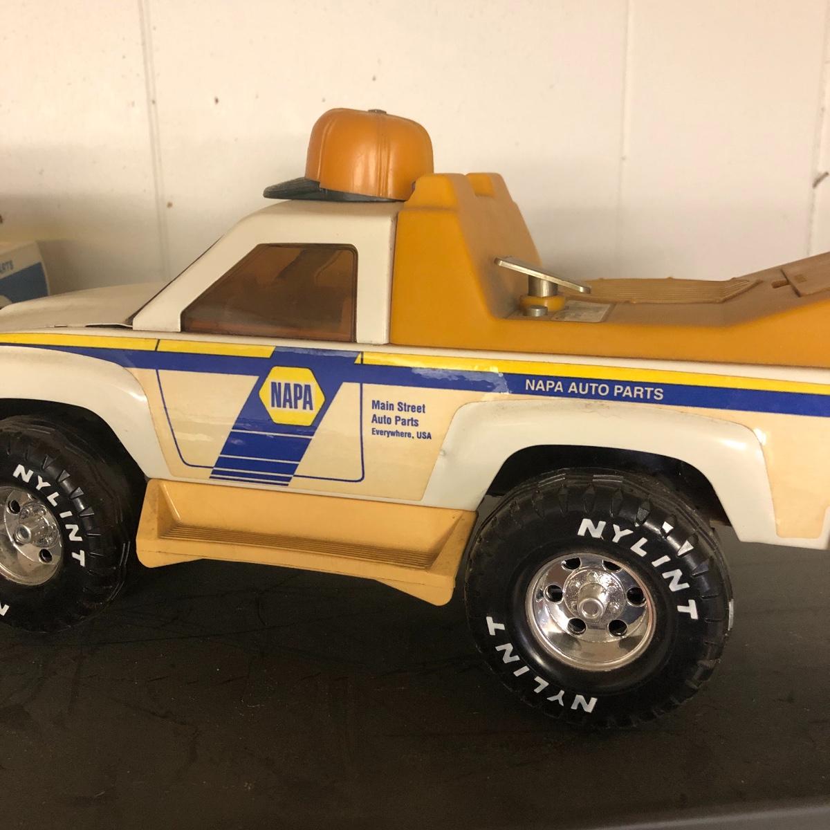 What a cool collection! This lot includes eight trucks and one boat. Of the eight trucks, five are pick-up trucks and three are a SUV style. One SUV does not have the bike on the back of the vehicle. Four of the trucks are made of metal (note the bottom of trucks.) The Nylint truck, two NAPA SUVs and boat take batteries. One metal pick up has a small crack in the window. Some dust and sun bleaching noted. Shipping Available.