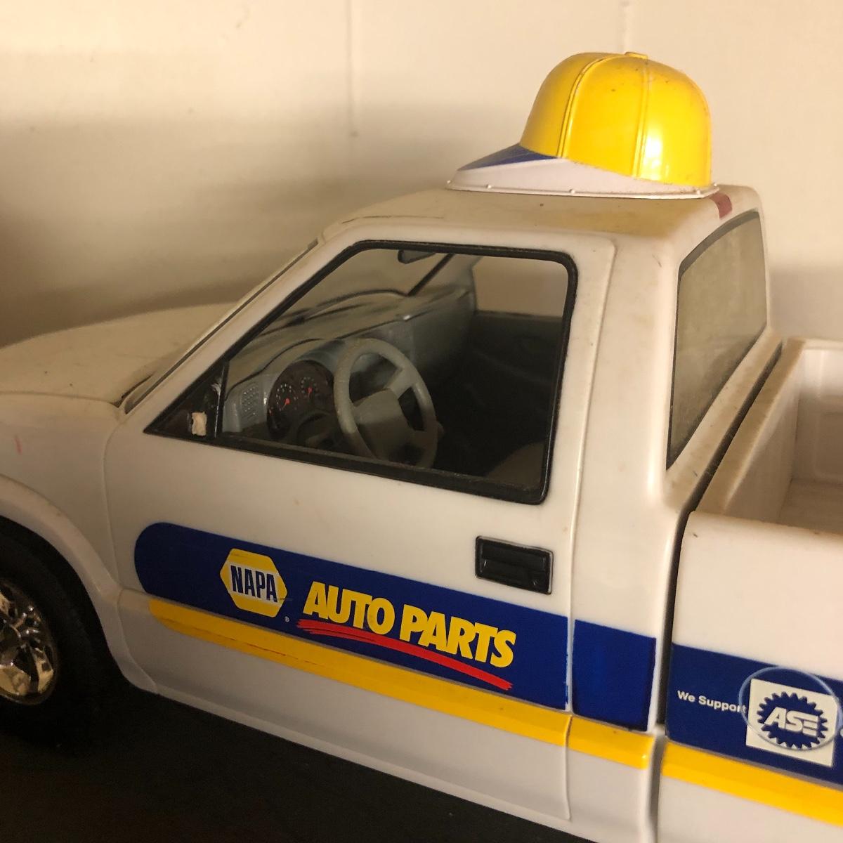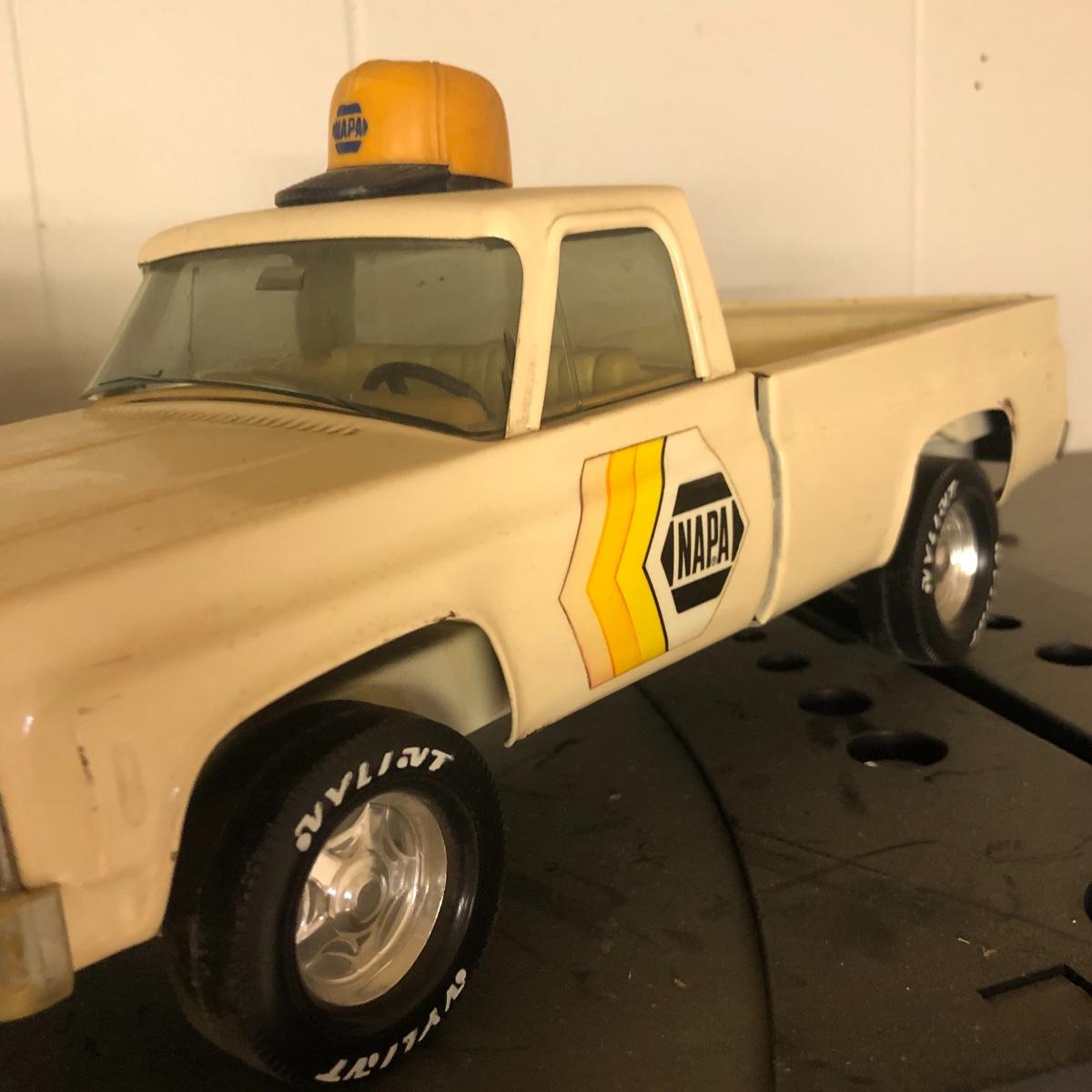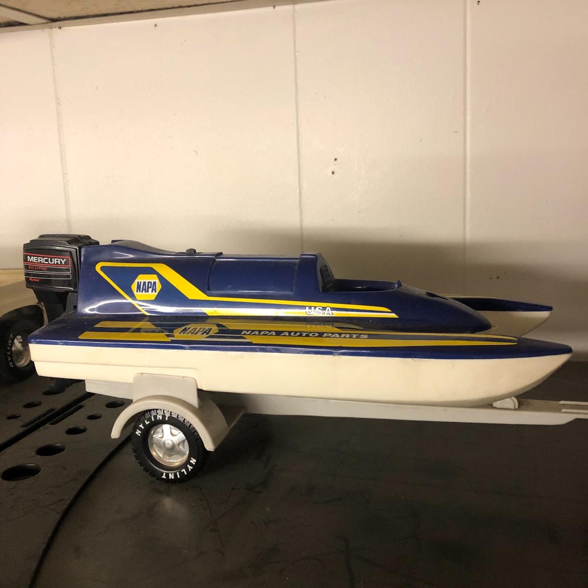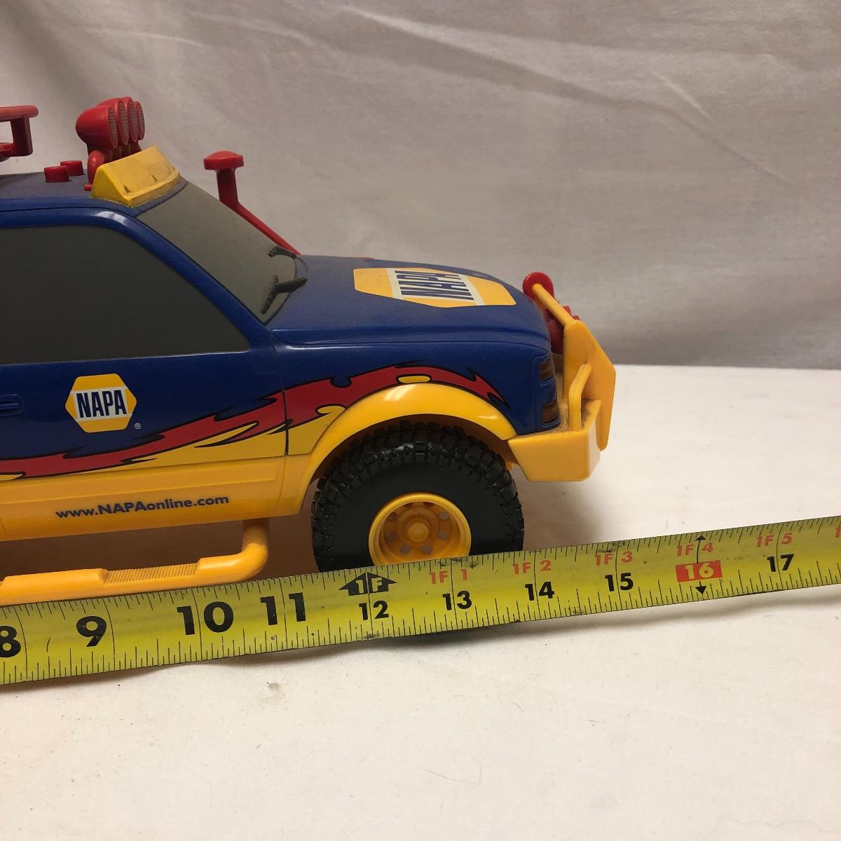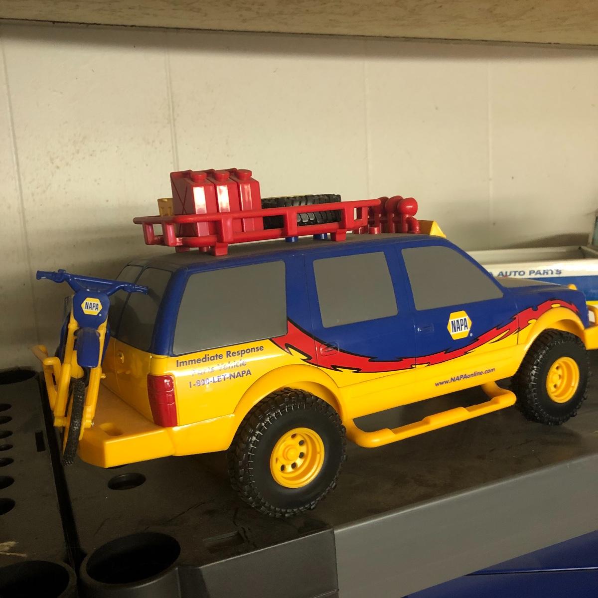 What a cool collection! This lot includes eight trucks and one boat. Of the eight trucks, five are pick-up trucks and three are a SUV style. One SUV does not have the bike on the back of the vehicle. Four of the trucks are made of metal (note the bottom of trucks.) The Nylint truck, two NAPA SUVs and boat take batteries. One metal pick up has a small crack in the window. Some dust and sun bleaching noted. Shipping Available.