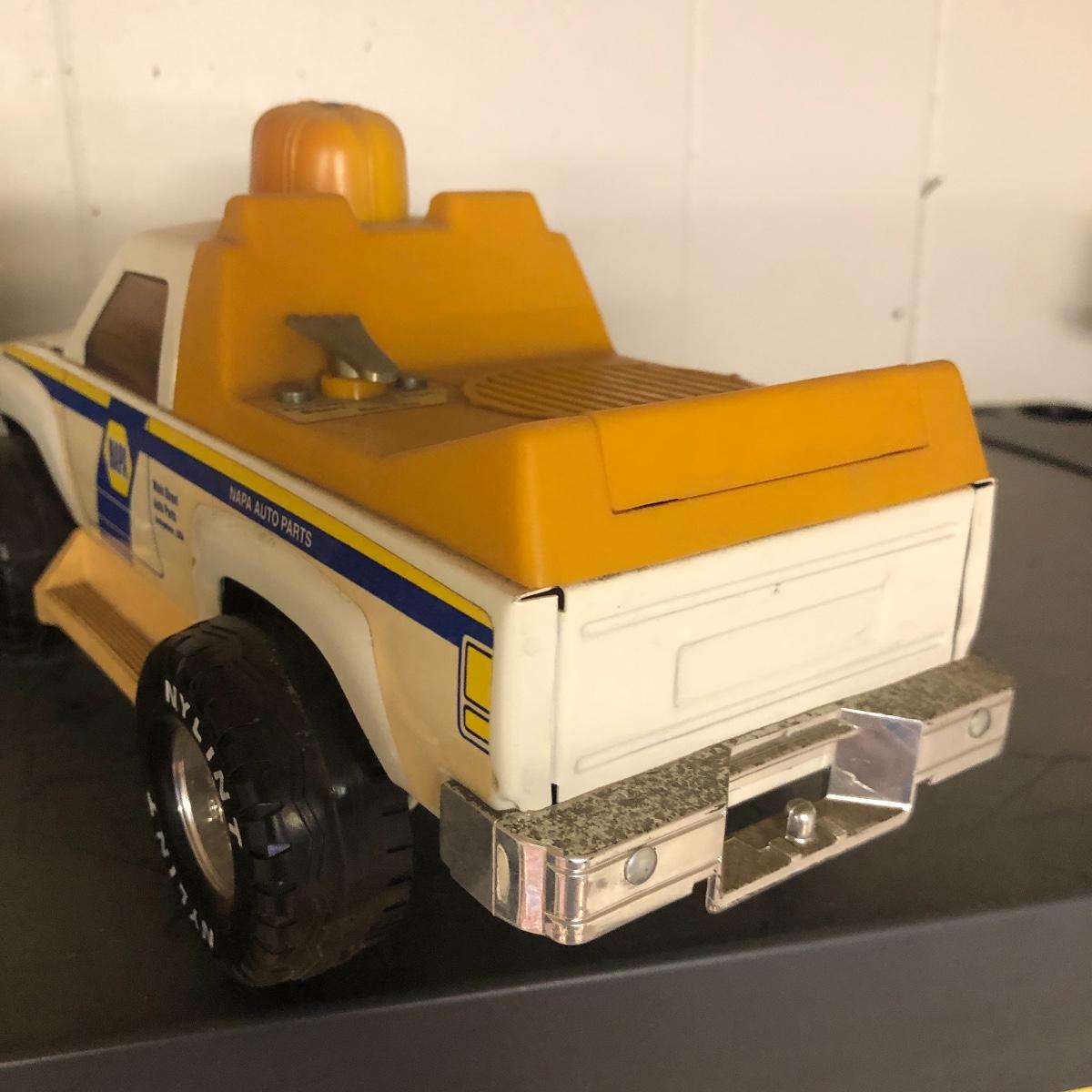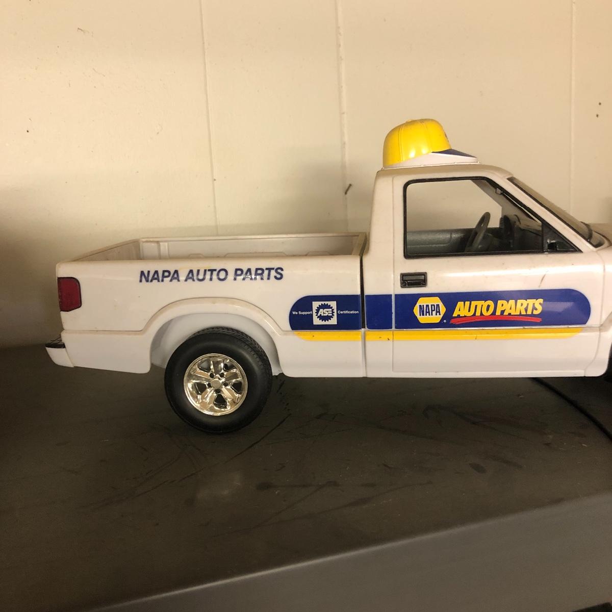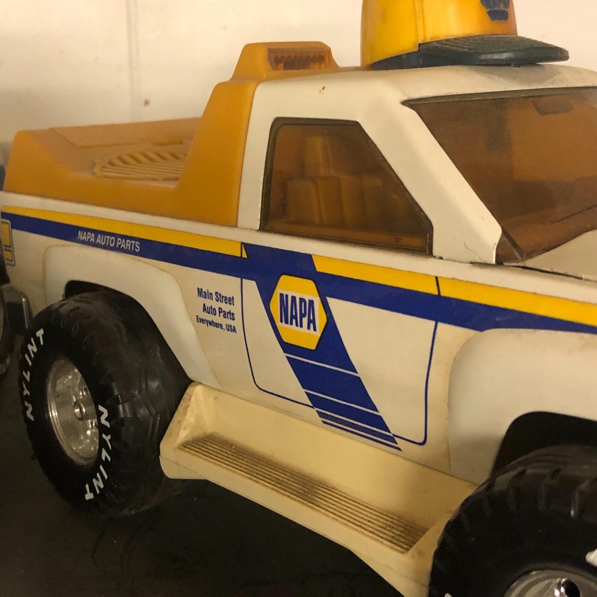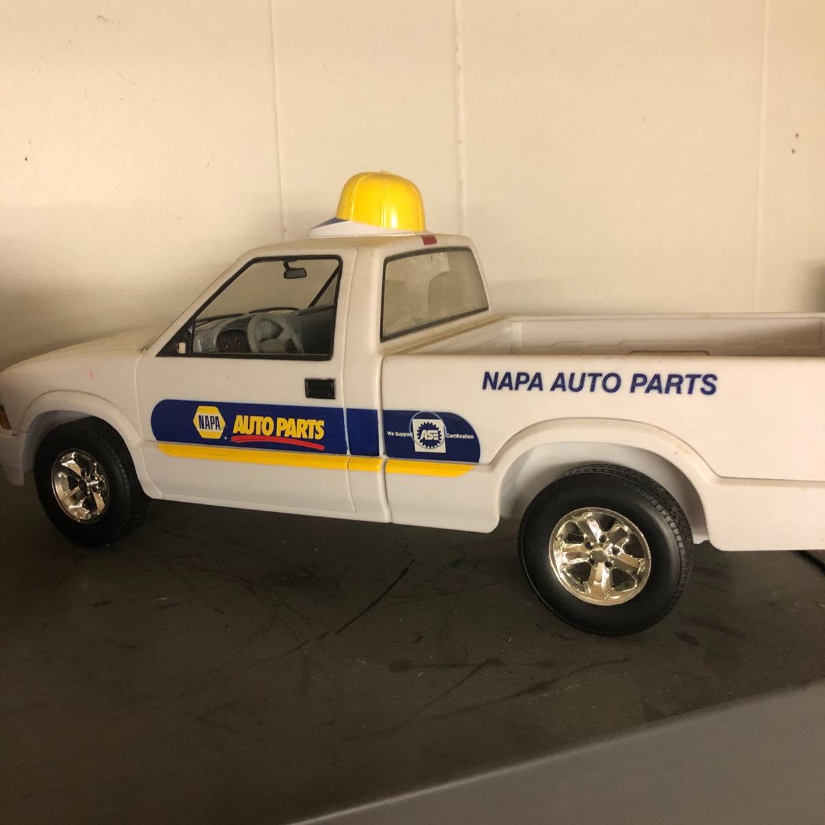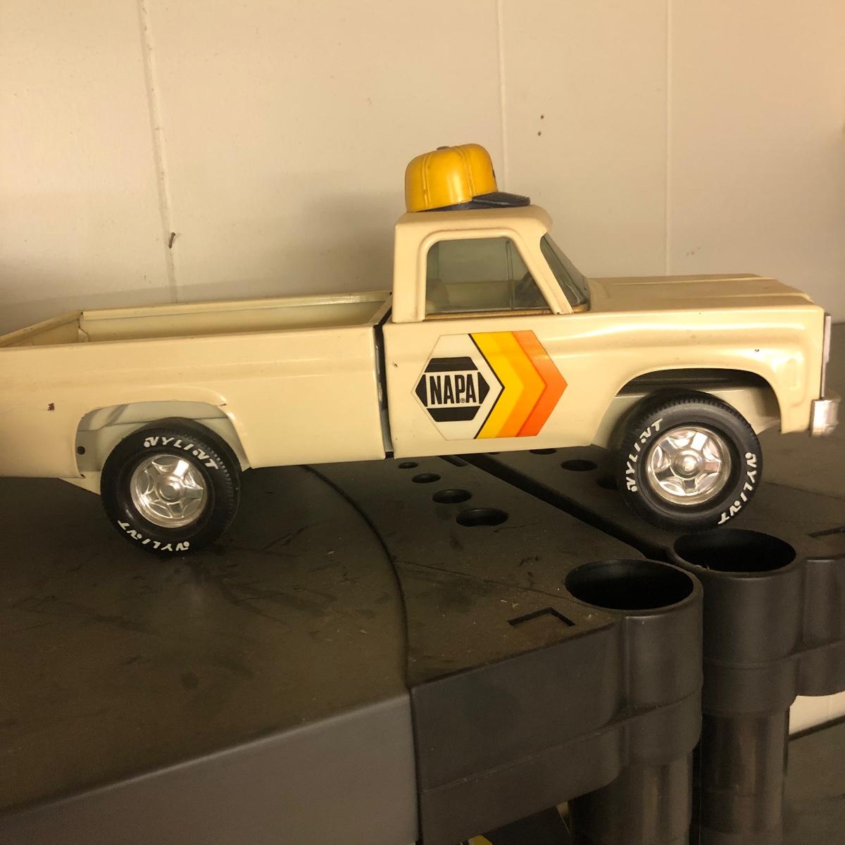 What a cool collection! This lot includes eight trucks and one boat. Of the eight trucks, five are pick-up trucks and three are a SUV style. One SUV does not have the bike on the back of the vehicle. Four of the trucks are made of metal (note the bottom of trucks.) The Nylint truck, two NAPA SUVs and boat take batteries. One metal pick up has a small crack in the window. Some dust and sun bleaching noted. Shipping Available.