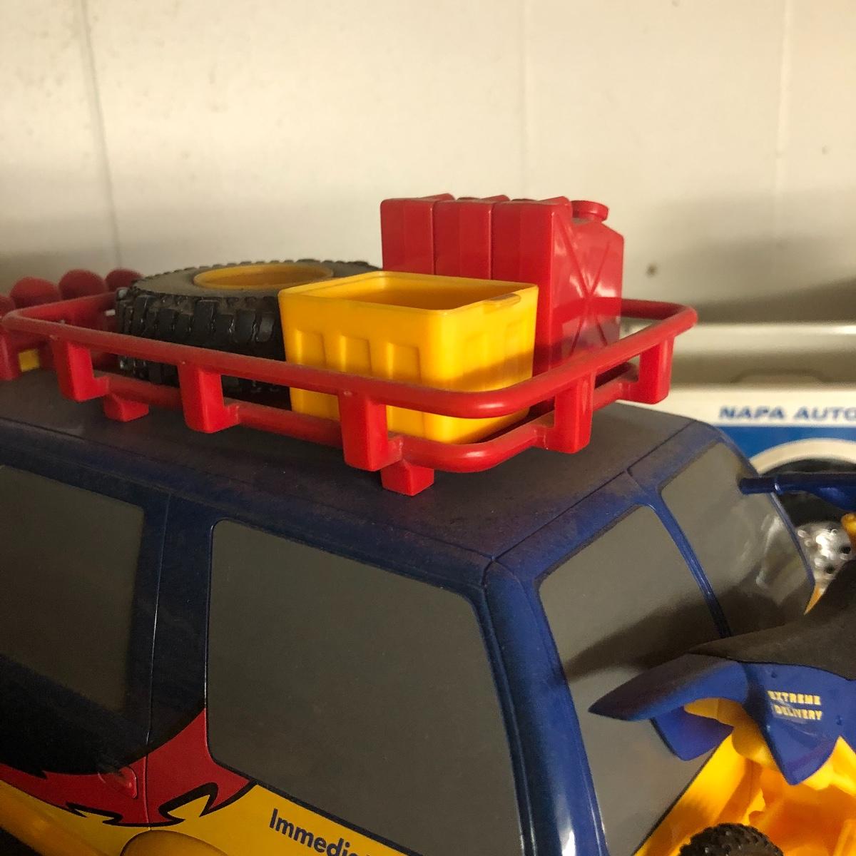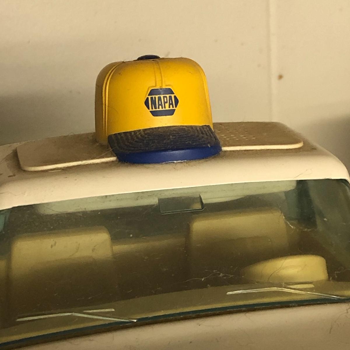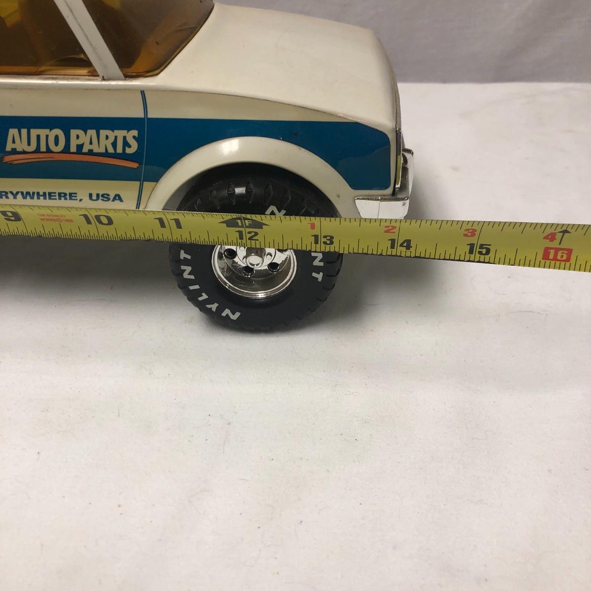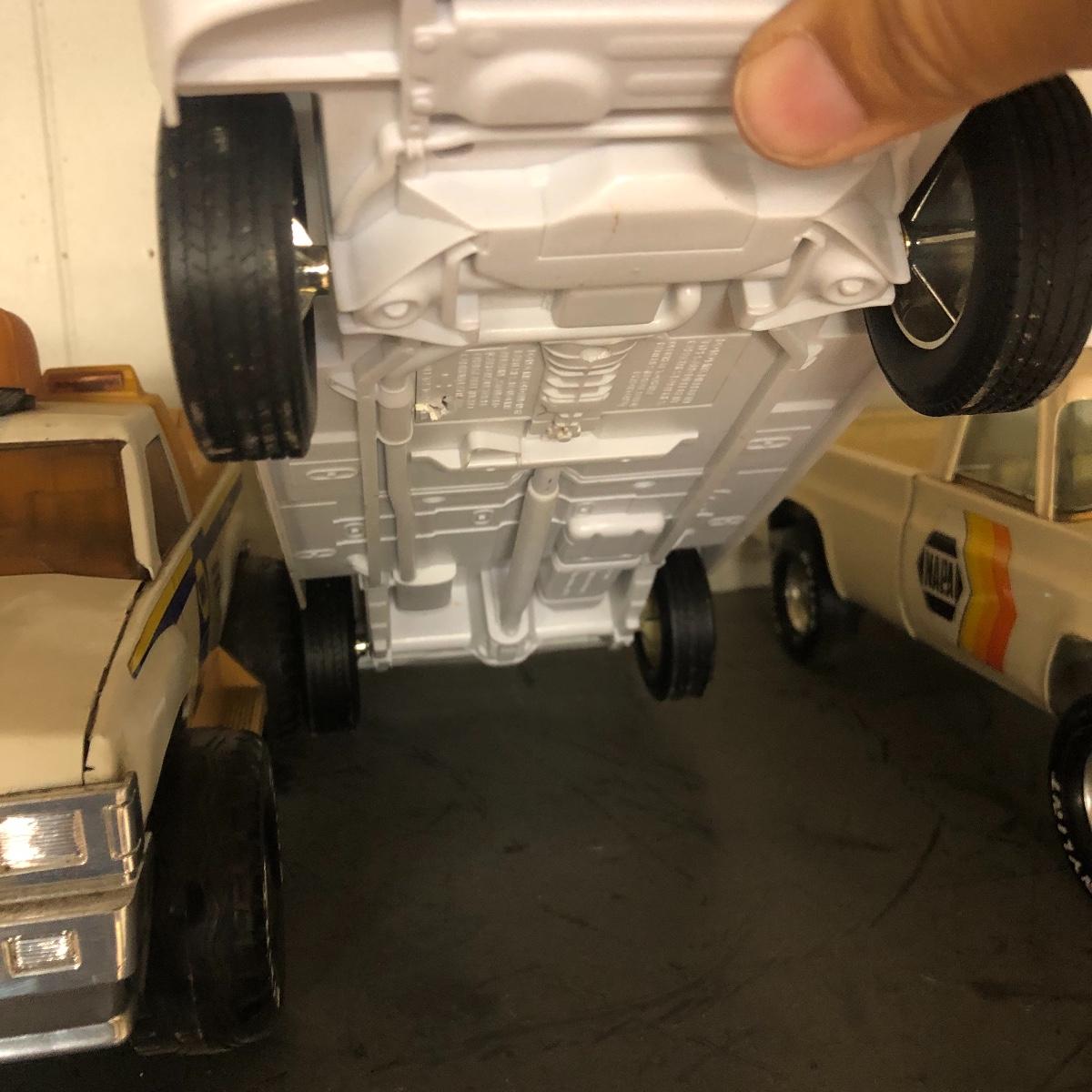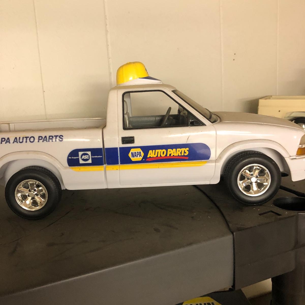 What a cool collection! This lot includes eight trucks and one boat. Of the eight trucks, five are pick-up trucks and three are a SUV style. One SUV does not have the bike on the back of the vehicle. Four of the trucks are made of metal (note the bottom of trucks.) The Nylint truck, two NAPA SUVs and boat take batteries. One metal pick up has a small crack in the window. Some dust and sun bleaching noted. Shipping Available.