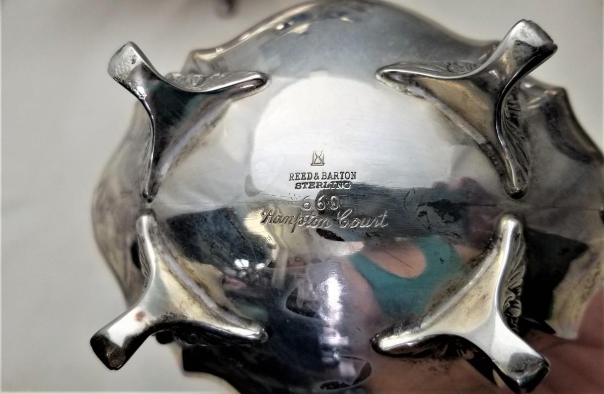 This five piece Sterling Silver tea set is a real stunner. The opening bid is right about scrap value. You get all you see here - two pots, creamer, sugar, and waste bowl. Excellent condition. Good, solid weight to this set. The creamer is 4.75" tall, the waste bowl is about 3.75" tall and 6" across, 8" across handle to handle, 6" across, small pot is 10,5 across handle to handle, 7.5" tall, large pot is about 11" across handle to handle, 9" tall. All are in very nice condition - no dimples, etc - but do have some light scratching consistent with handling and gentle use. This set was made by Reed and Barton in the "Hampton Court" pattern. A real beauty