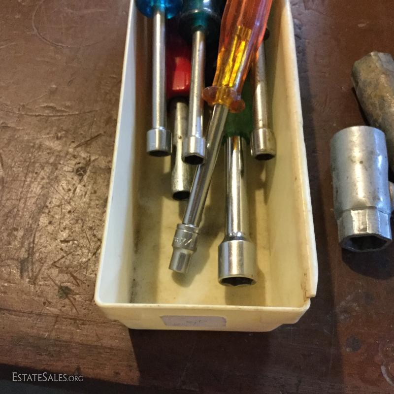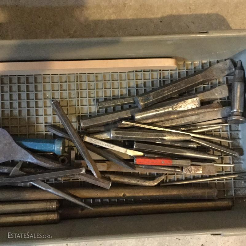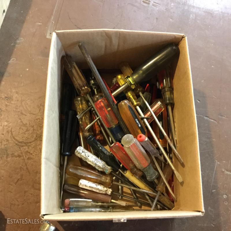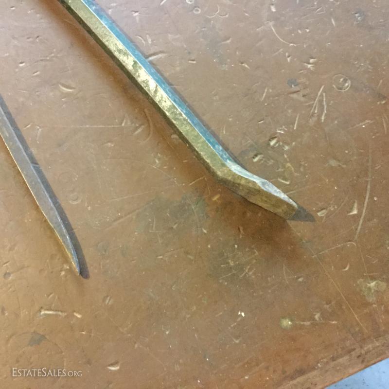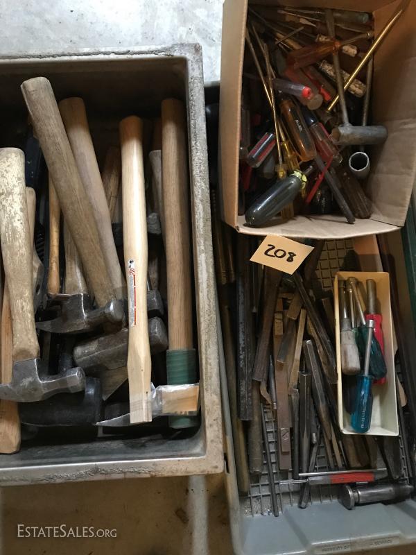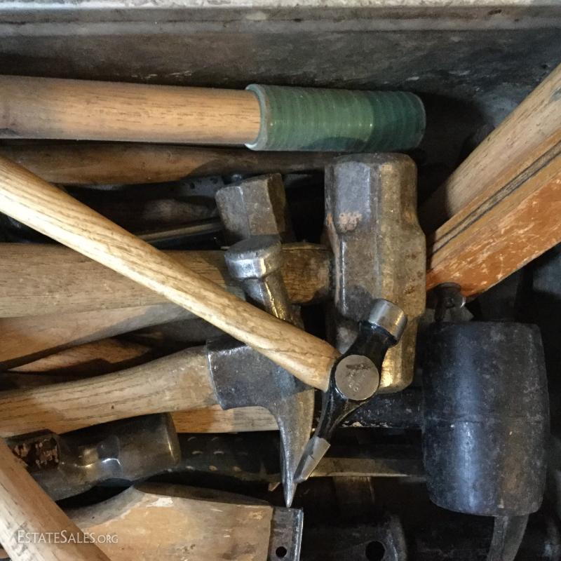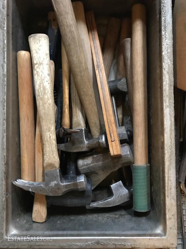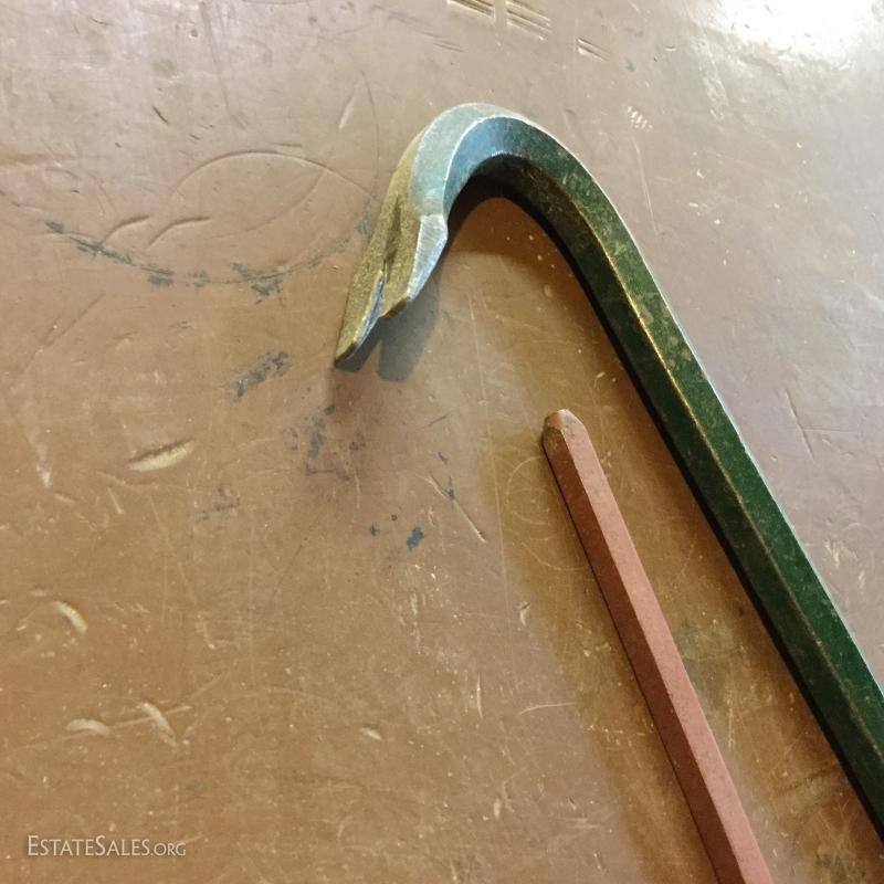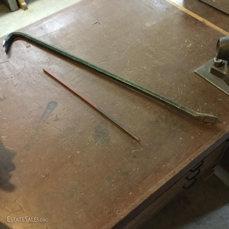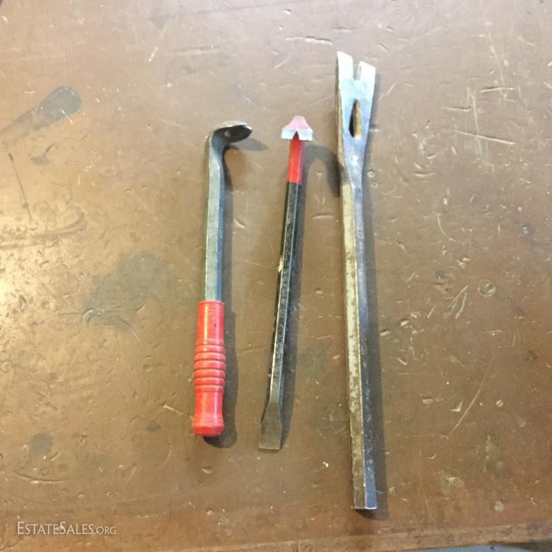 Crowbars, hammers, vintage cast iron nail puller, and screwdrivers. Lots of heavy duty tools in this lot. Largest crowbar is 34"long.
