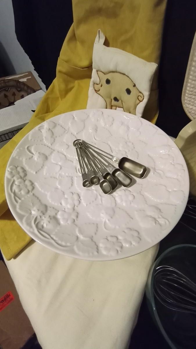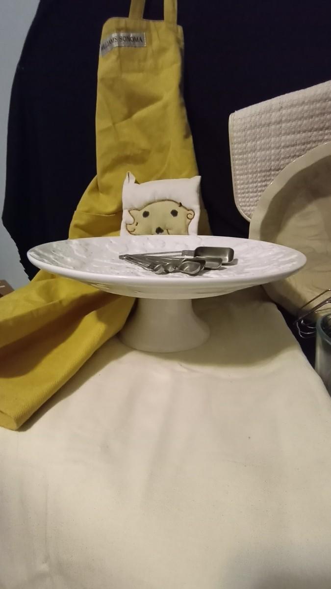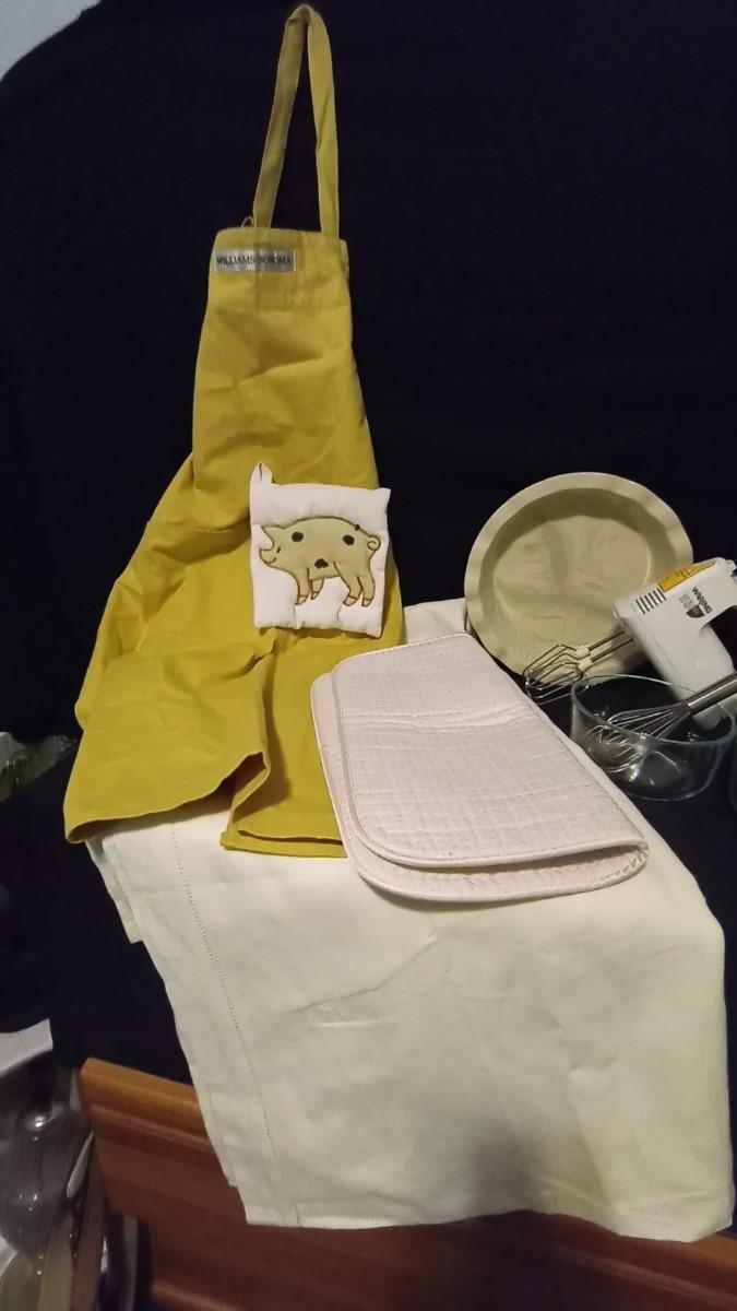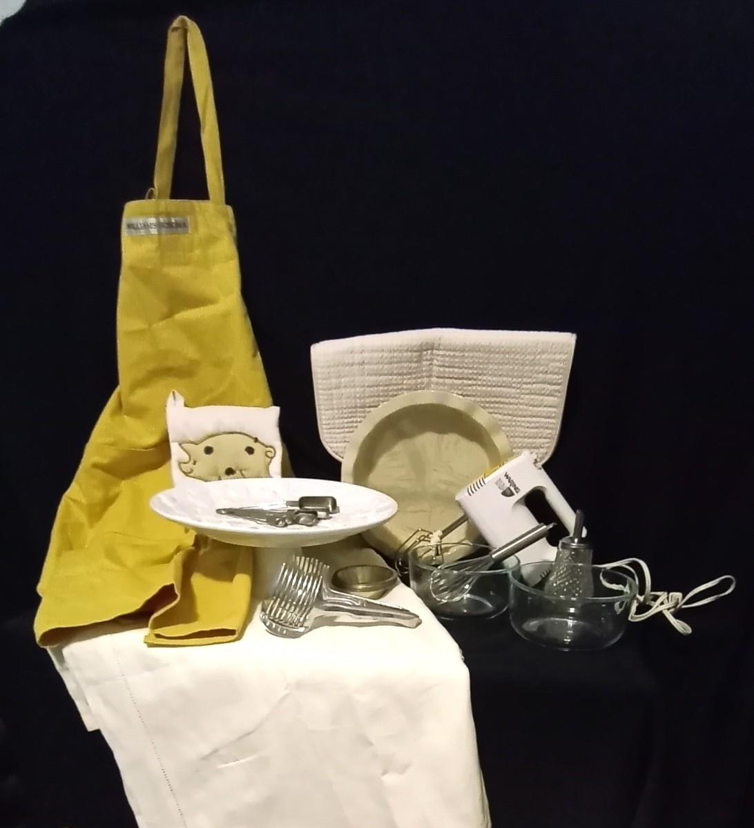 HAND MIXER-MIXING BOWLS-CAKE STAND-NEW WILLIAM SONNOMA APRIN-STAINLESS STEEL MEASURING SPOONS-DRYING DISH MAT-TABLE RUNNER AND MORE