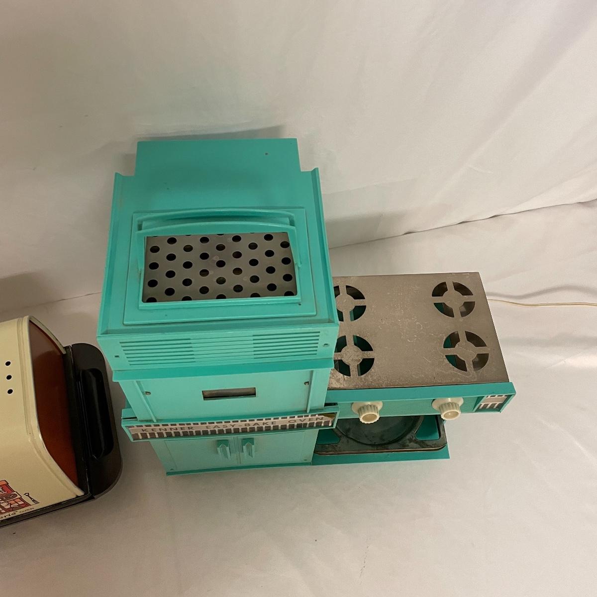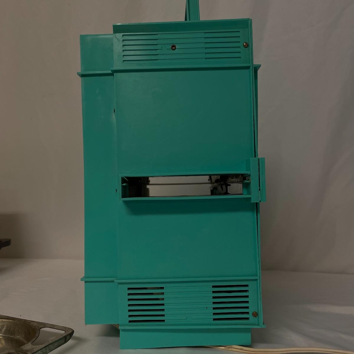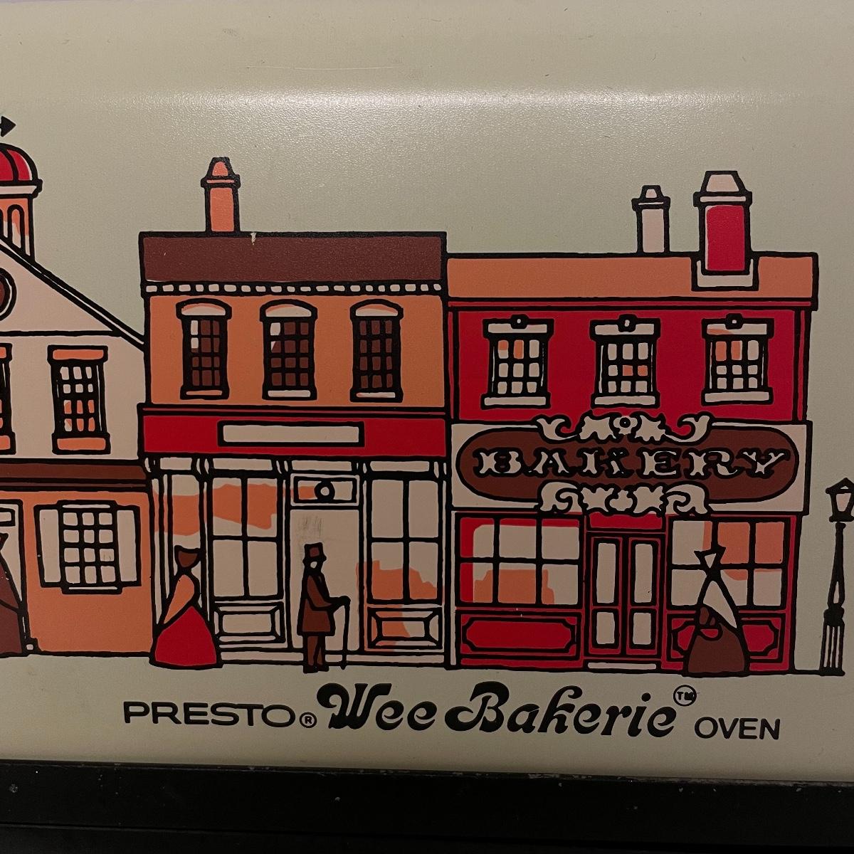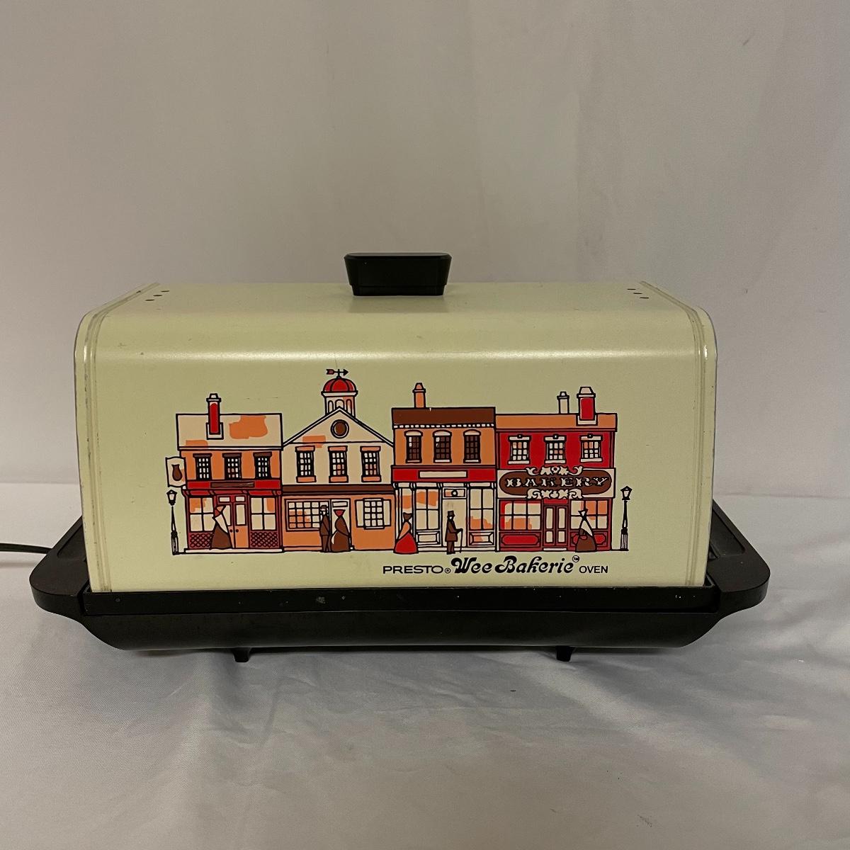 Two vintage items to bring a blast from the past. Due to new and improved safety guidelines, these items should be used for decor and with adult supervision. A lighted Kenner Easy Bake Oven with three trays. This item turned on as soon as it was plugged in. The light bulbs became fairly hot in a short time. It has a plastic teal outer cover and measures 12.5” x 7” x 14”. Next, an adorably designed Presto Wee Bakerie oven. This piece also started to heat up when tested. It has a lovely old fashioned scene on its metal cover and sits on top of a griddle. See images. Shipping available.