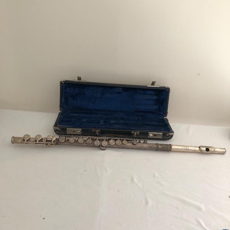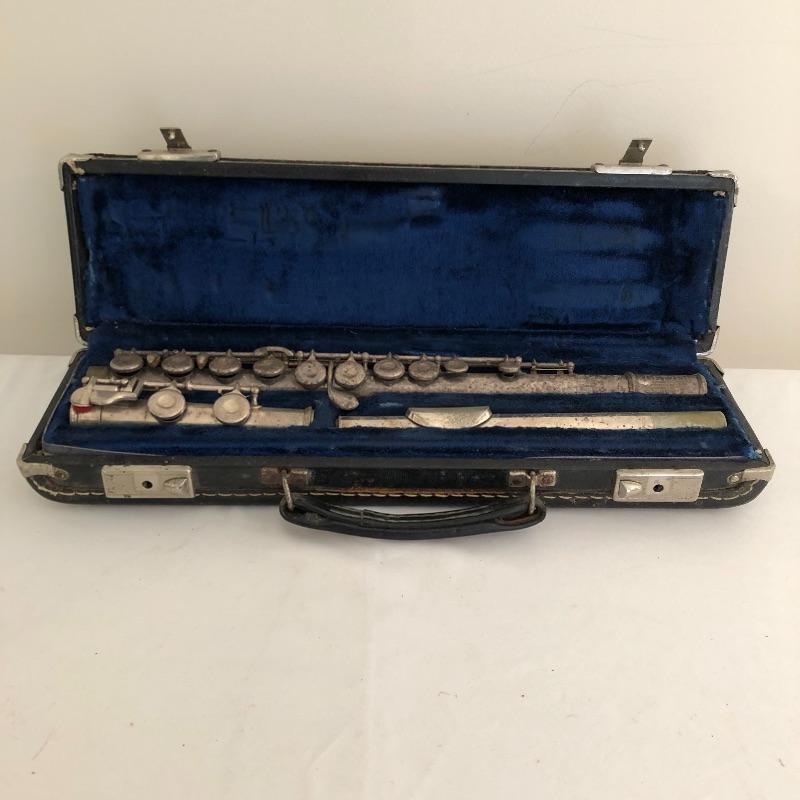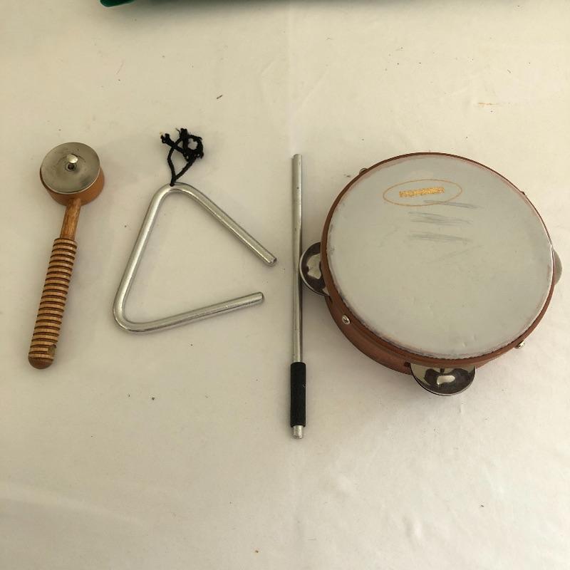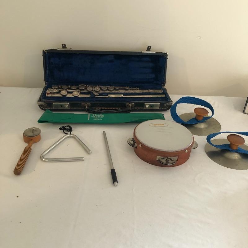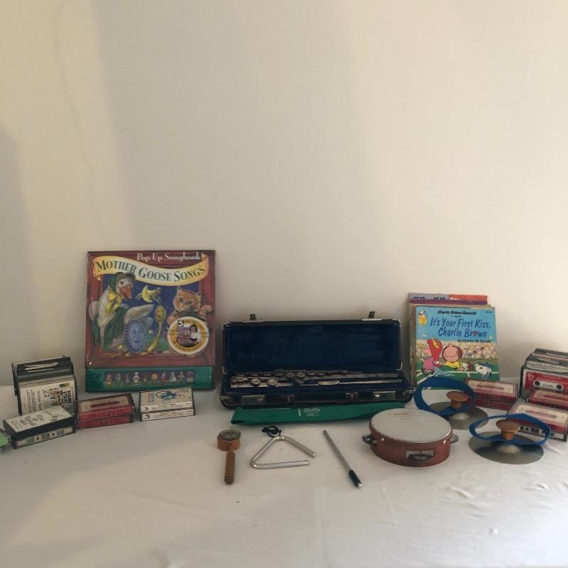 Get your child interested in music with this array of instruments and children’s books. Lot includes Getzen flute with case, Hohner tambourine and recorder, triangle and small cymbals. Also includes a collection of Walt Disney books and tapes. Flute appears oxidized, see pictures.