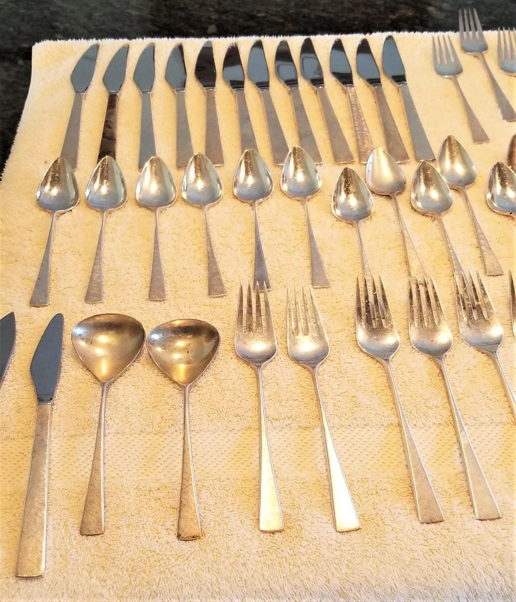 This set in the DIMENSION pattern was first made in 1961 by Reed & Barton and it has a distinctive Mid-century Modern look (long retired now, of course - can only be found on the secondary market). Set consists of all you see here: 12 knives, 10 dinner forks, 6 salad forks, 12 teaspoons, 6 table spoons, 2 serving spoons, 1 meat fork, 1 pierced serving spoon, cake server, 2 sugar spoons, and 2 spreaders 55 pieces in all. Good used condition - could use a polish. Scrap value on this set is $1335.00.