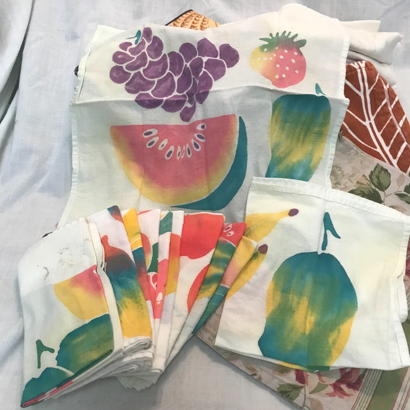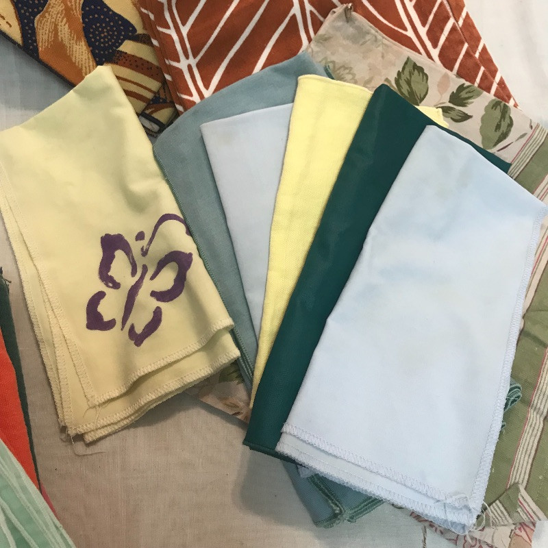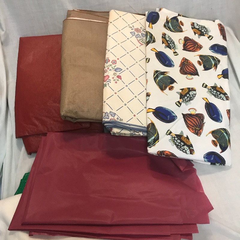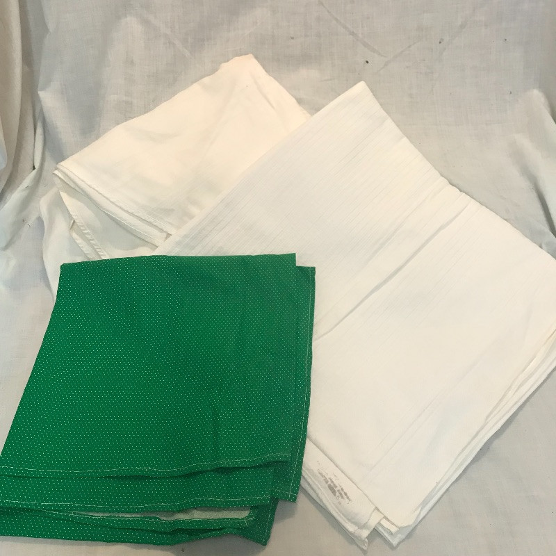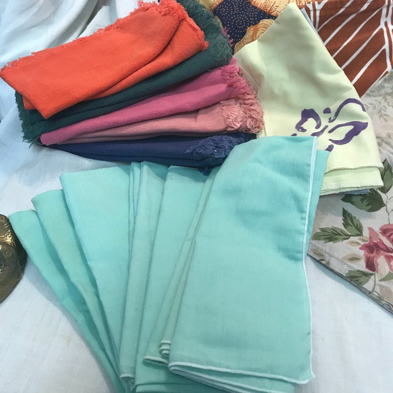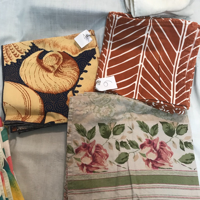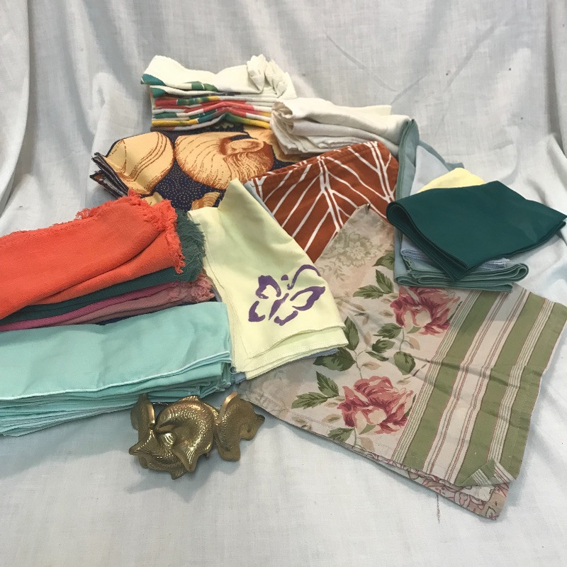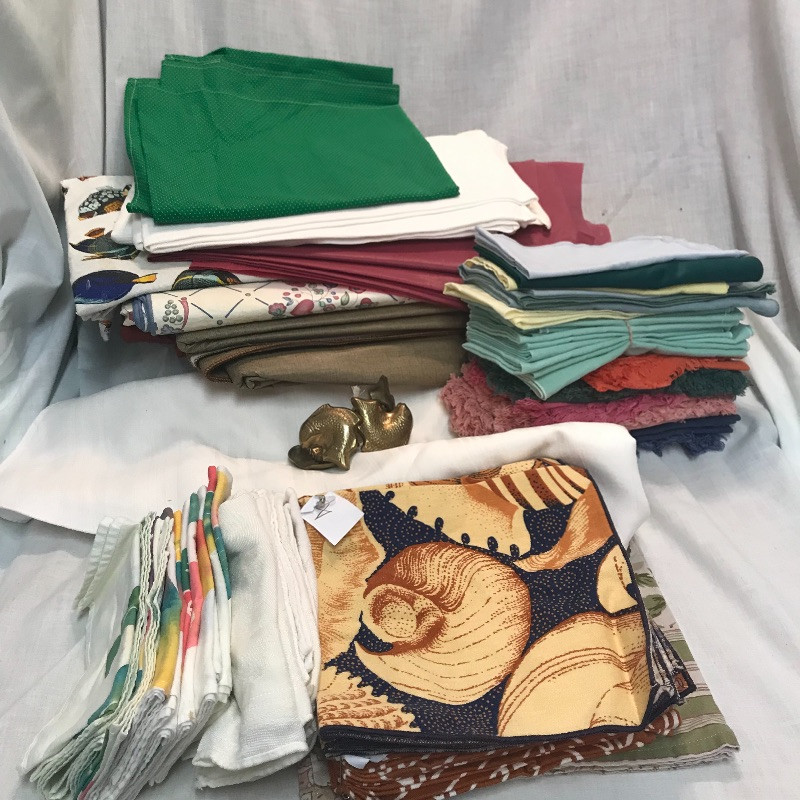 Save the planet and go cloth! Large collection of cloth napkins of various styles for your meals. Collection also includes some vinyl and linen table cloths. The vinyl and cloth varieties are each photographed together, with round, square and rectangular shapes. Local Pickup Only.