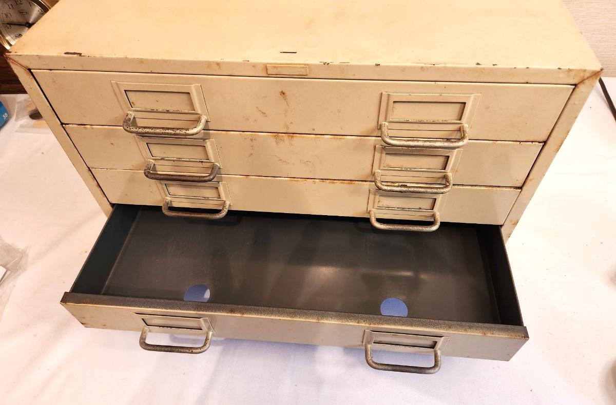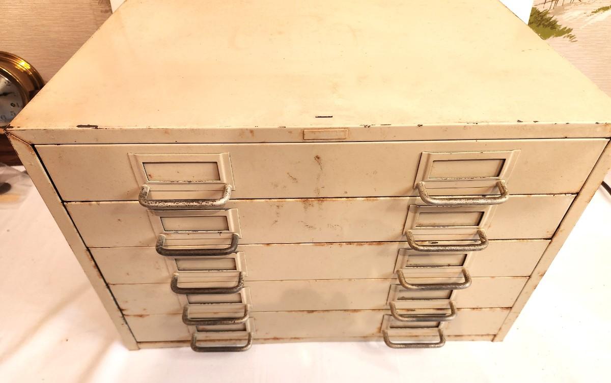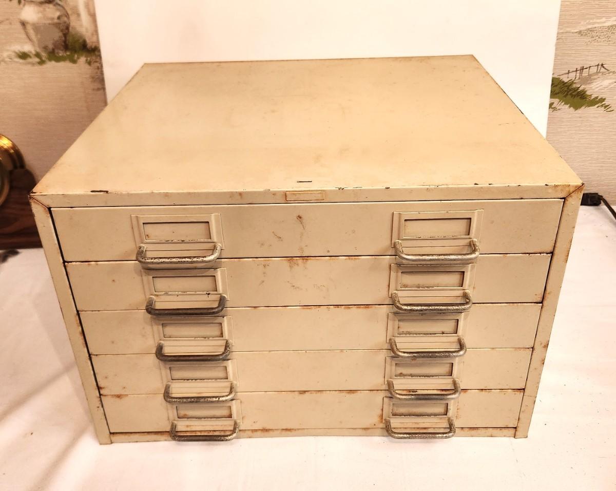 Table top metal cabinet - 5 somewhat shallow drawers. This cabinet was used to store paper and ephemera, so the inside drawers are pretty clean. 19" x 16" x 12".