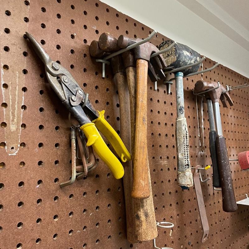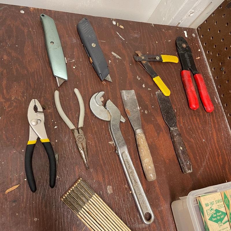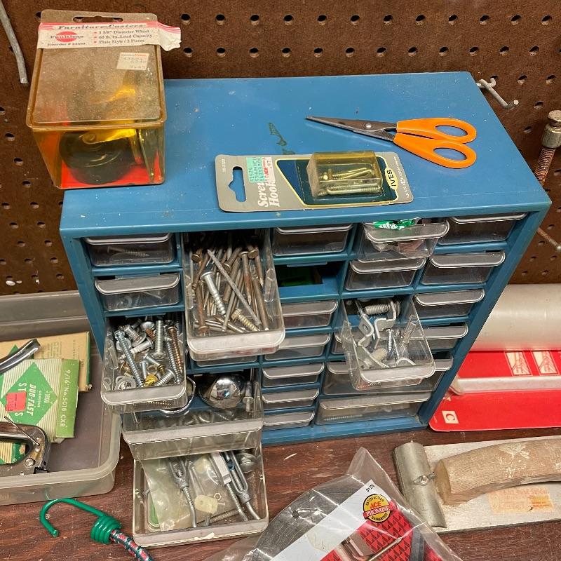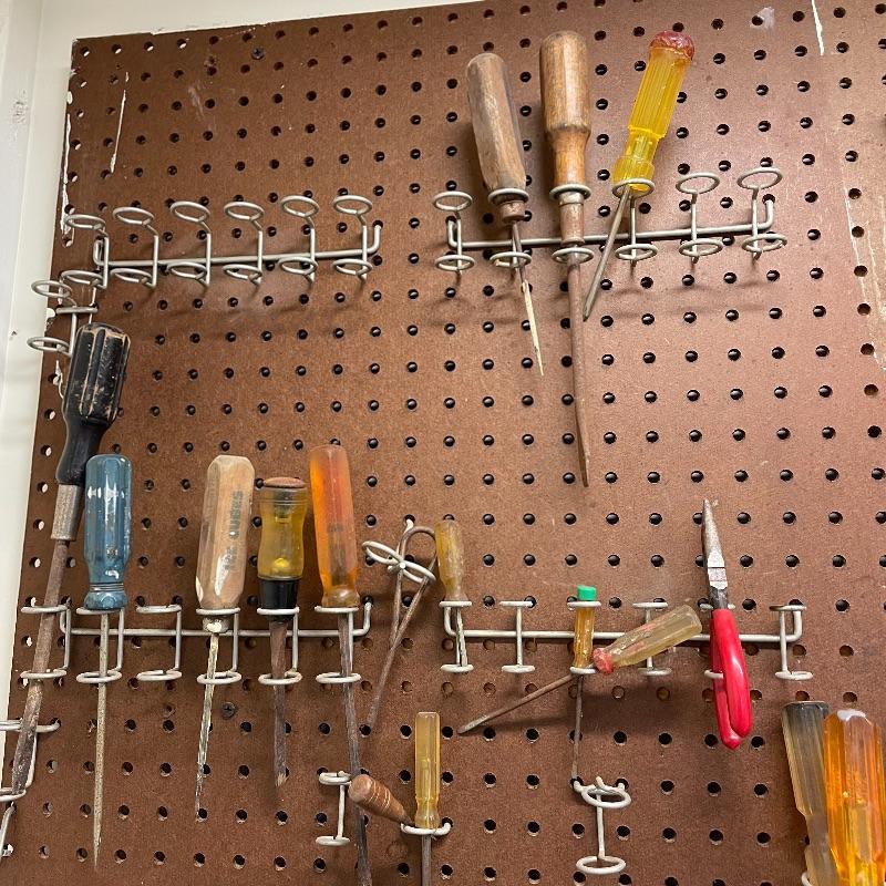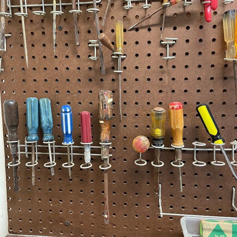 Here’s a handy lot for a handy person! A variety of vintage flathead and Phillips head screwdrivers, hammers and a mallet. Lot includes various pliers and wrenches, box cutters and more. Lot also includes some hardware and handy items for around the house in a hardware compartment box measuring 12” x 6.25” x 13”. See photos for entire lot inventory, pegs and pegboard is not included. Local pick up only.