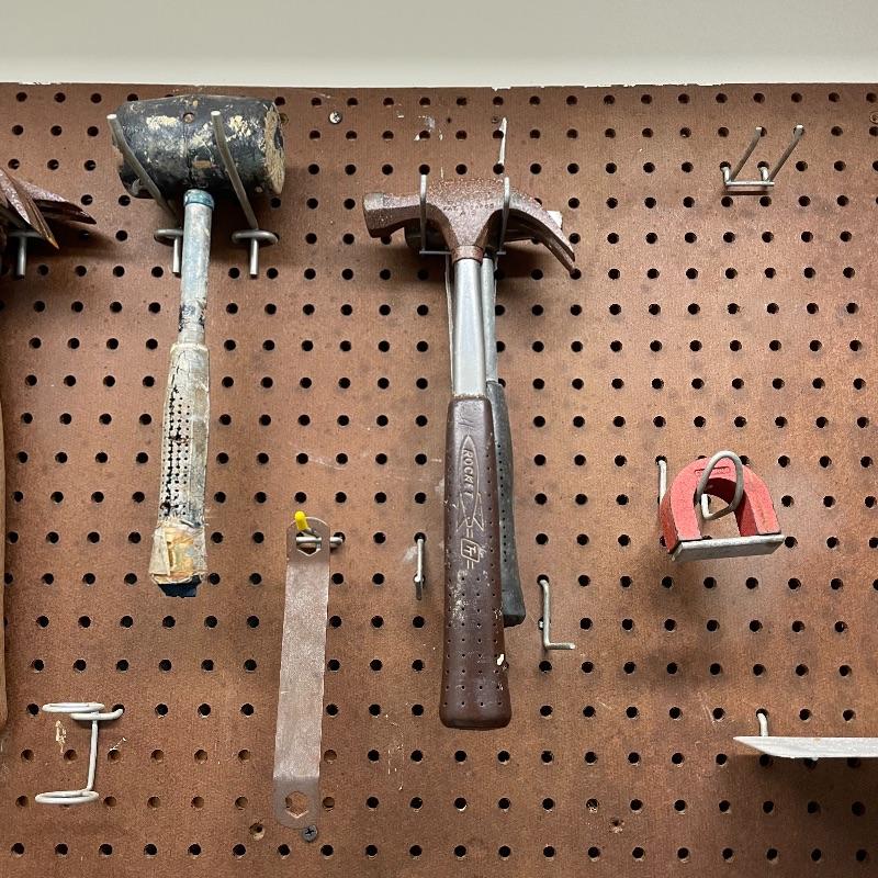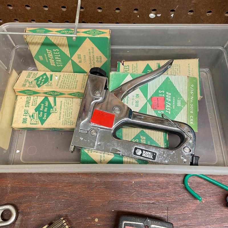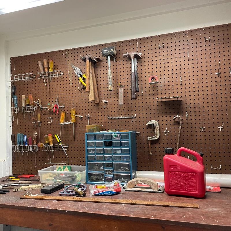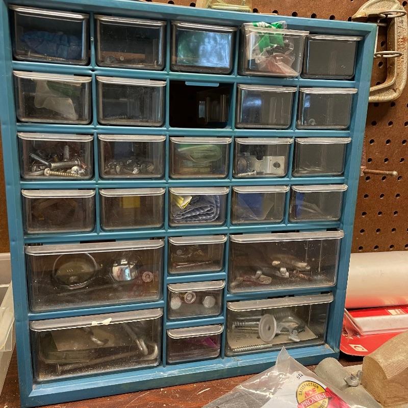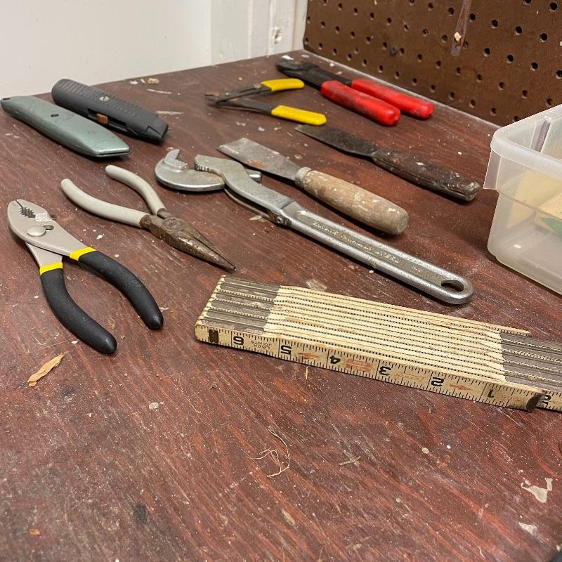 Here’s a handy lot for a handy person! A variety of vintage flathead and Phillips head screwdrivers, hammers and a mallet. Lot includes various pliers and wrenches, box cutters and more. Lot also includes some hardware and handy items for around the house in a hardware compartment box measuring 12” x 6.25” x 13”. See photos for entire lot inventory, pegs and pegboard is not included. Local pick up only.