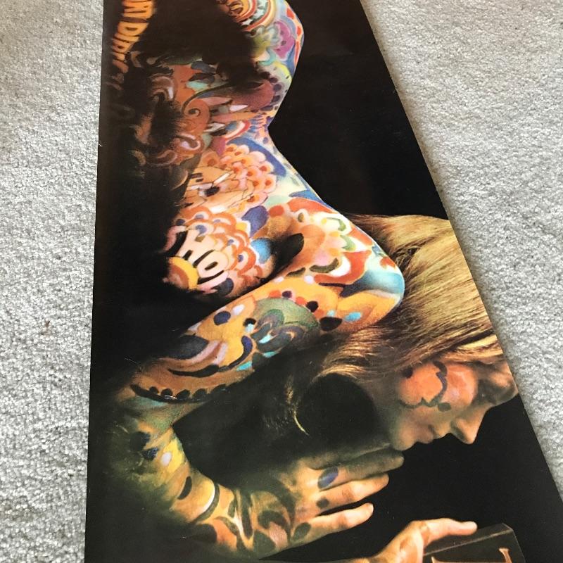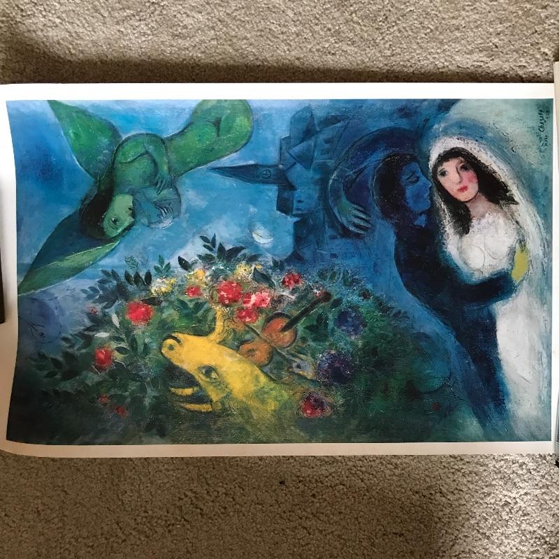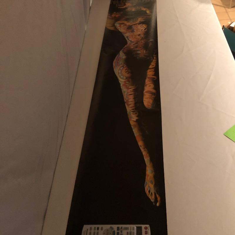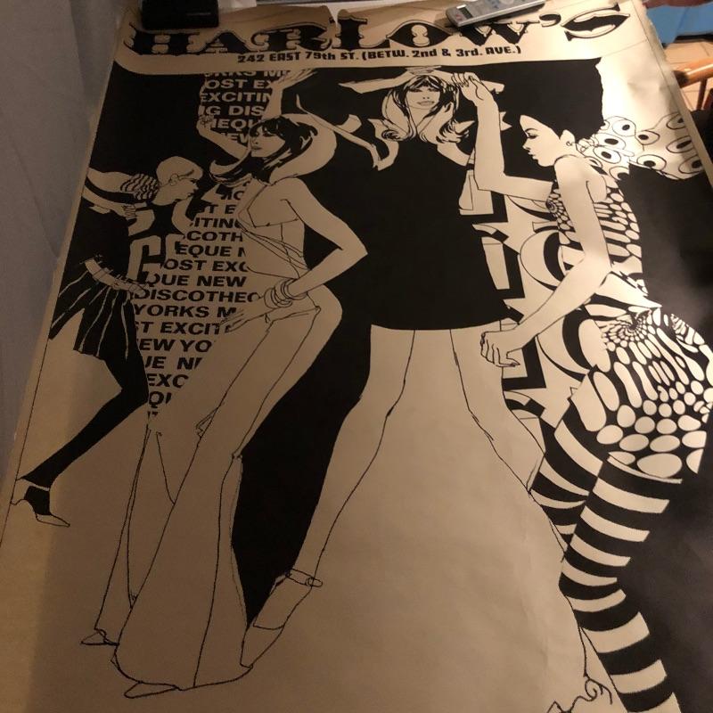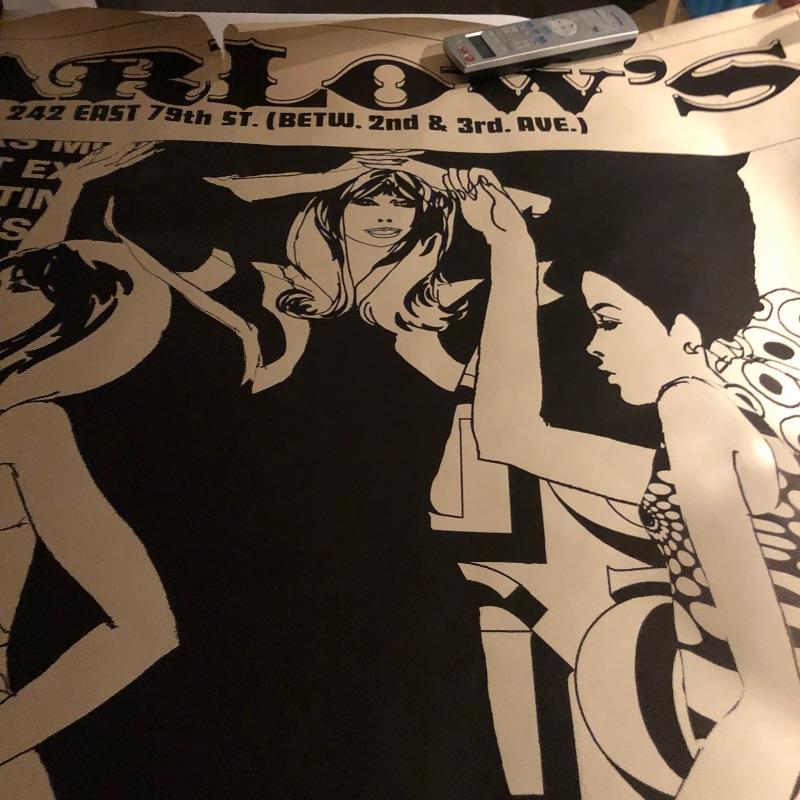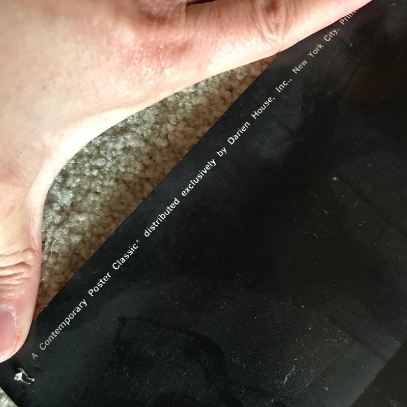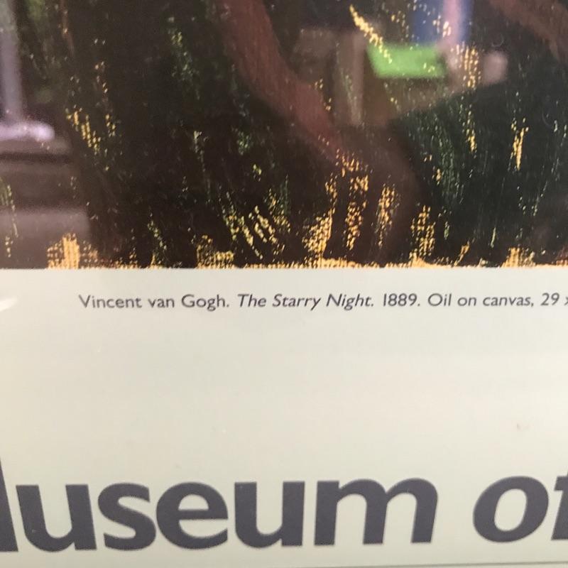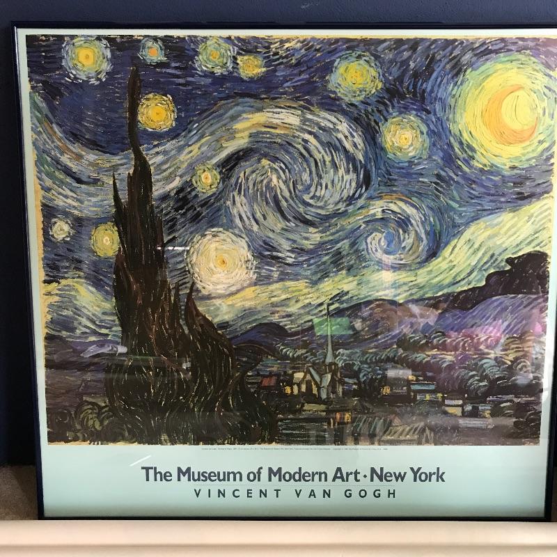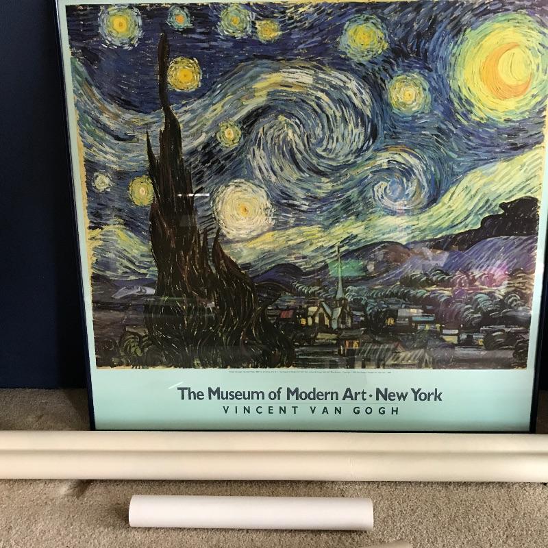 Iconic painting of The Starry Night by Vincent Van Gogh is captured here with this 29” x 31” framed poster from 1985.. Also included is a lovely poster of a reproduction of “La Nuit D’Orgeval” measuring 21.5” x 13.5”, and a very large 58” by 40” Harlow poster. Please note the Harlow poster has some tears in the very top section of the poster. Long exhibition poster of painted woman is 63” x 12”.