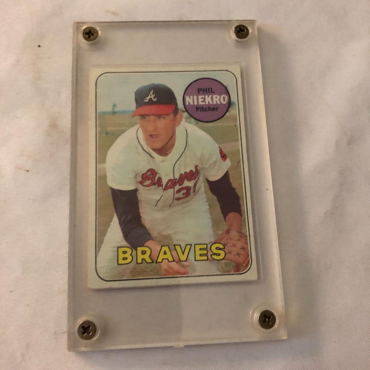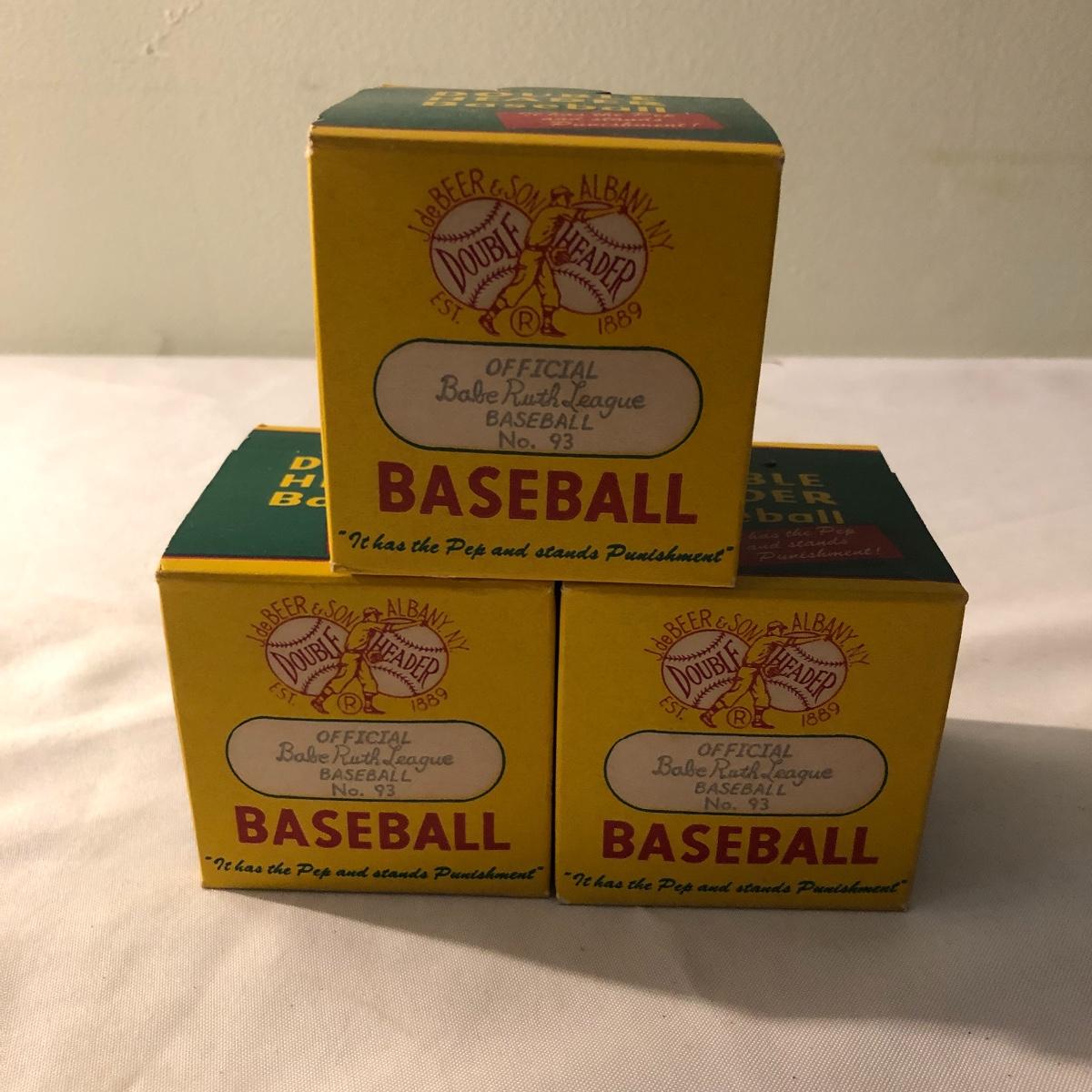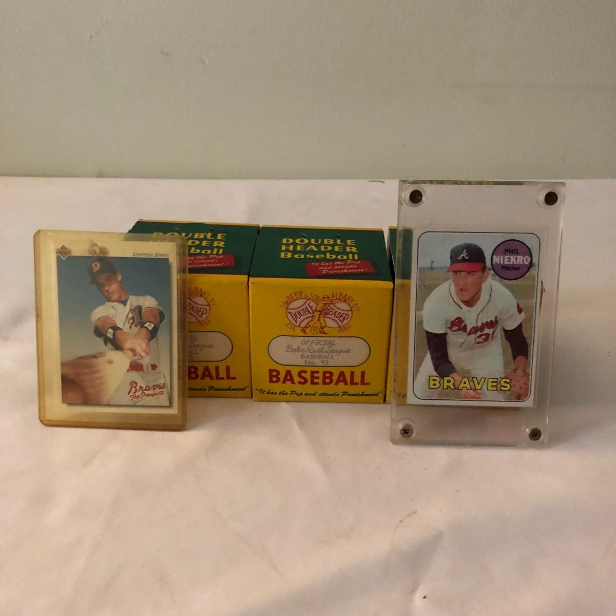 Get this trio of Double Header Babe Ruth League #93 baseballs. Two are still in sealed box. Also includes Phil Niekro 1969 Topps card and Chipper Jones Upper Deck Top Prospect card.