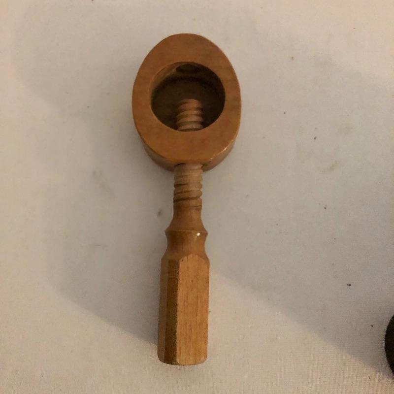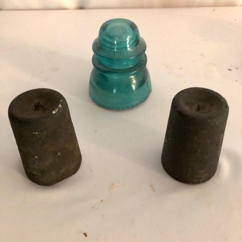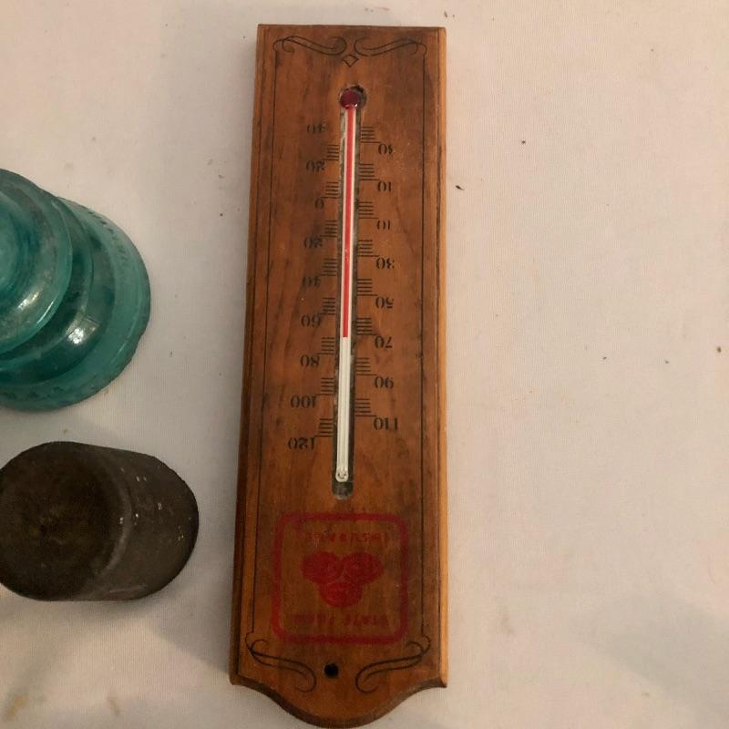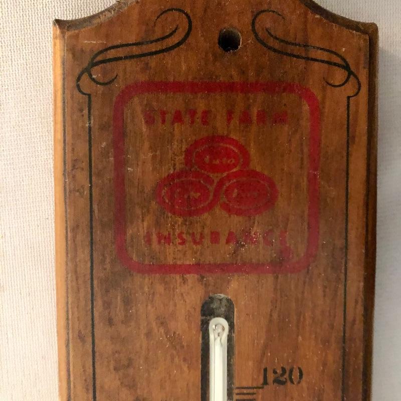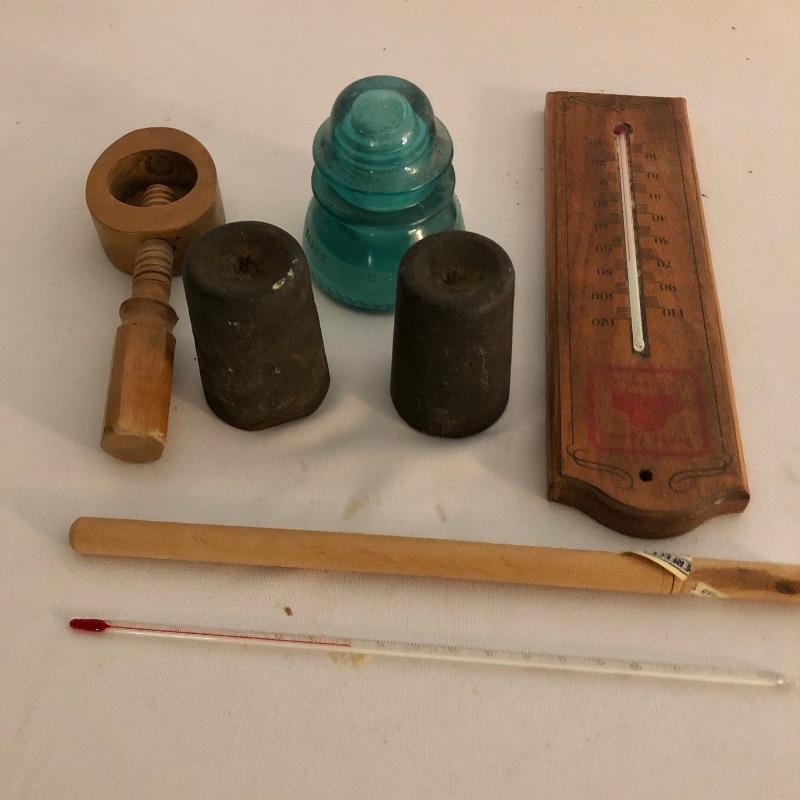 A great assortment of vintage paraphernalia here that includes a State Farm wooden wall hanging thermometer, a wooden nut cracker, weights and insulator. See photos.