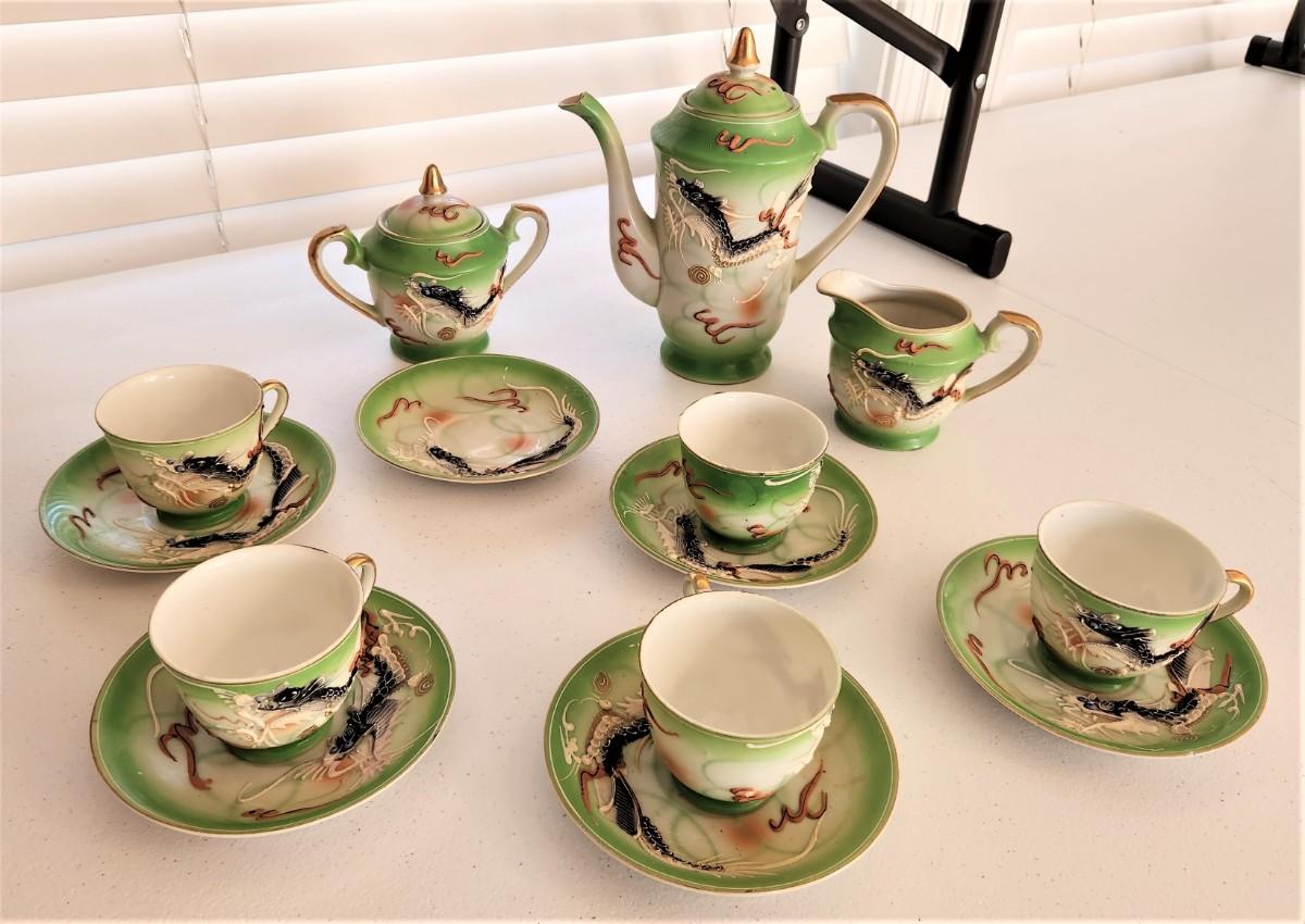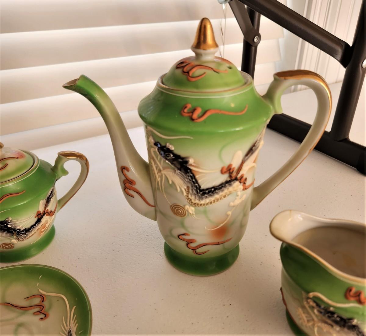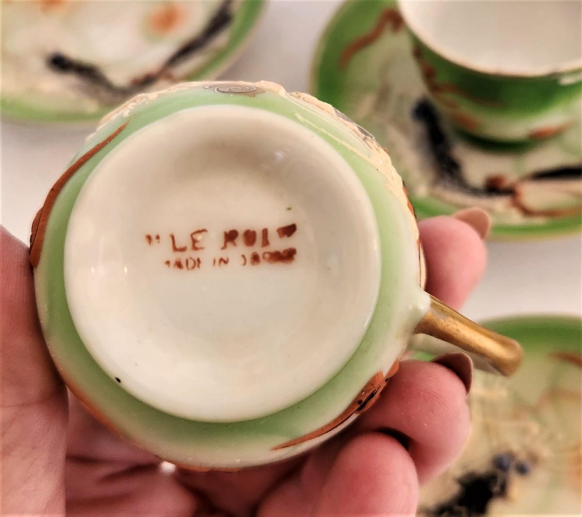 This vintage red-mark "Japan" tea set has 5 cups/saucers with one extra saucer, teapot, cream/sugar. Moriage style applied decoration - probably 1950's. Teapot is 7" tall. Vintage condition.