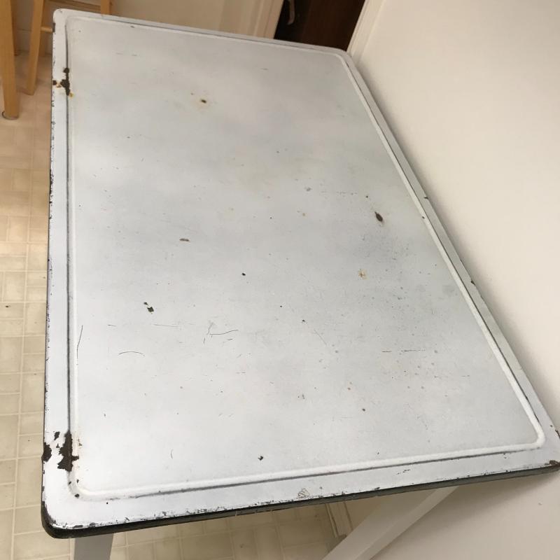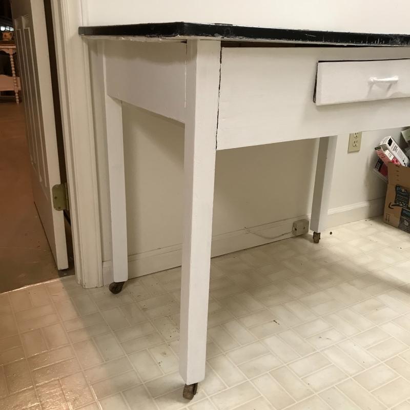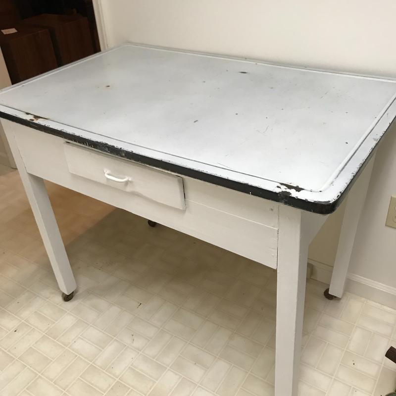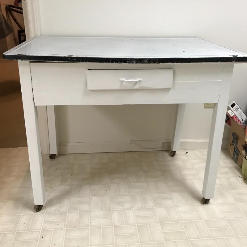 This charming wood table painted white with a metal top has on casters on all legs. Casters are a little worn and gliding isn’t smooth. Table has one small drawer and usual wear for a work table. Measures approx. 40”x25”x32”. Local pick up only.