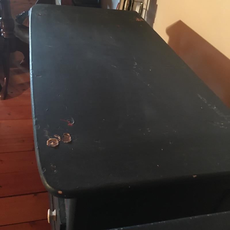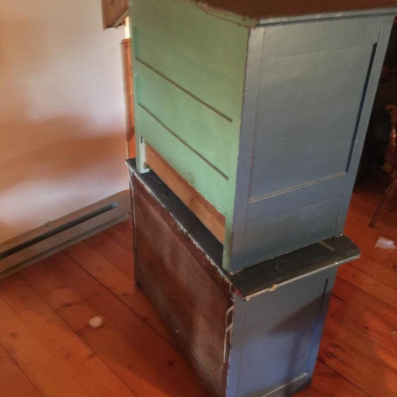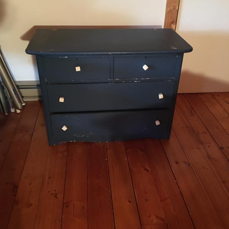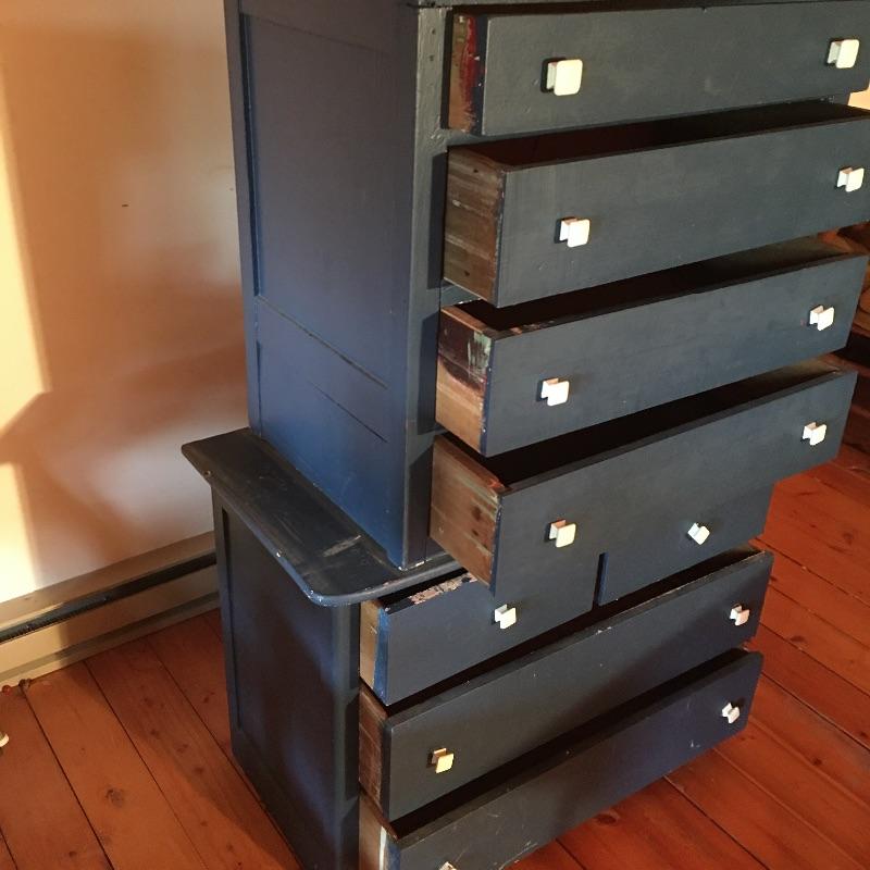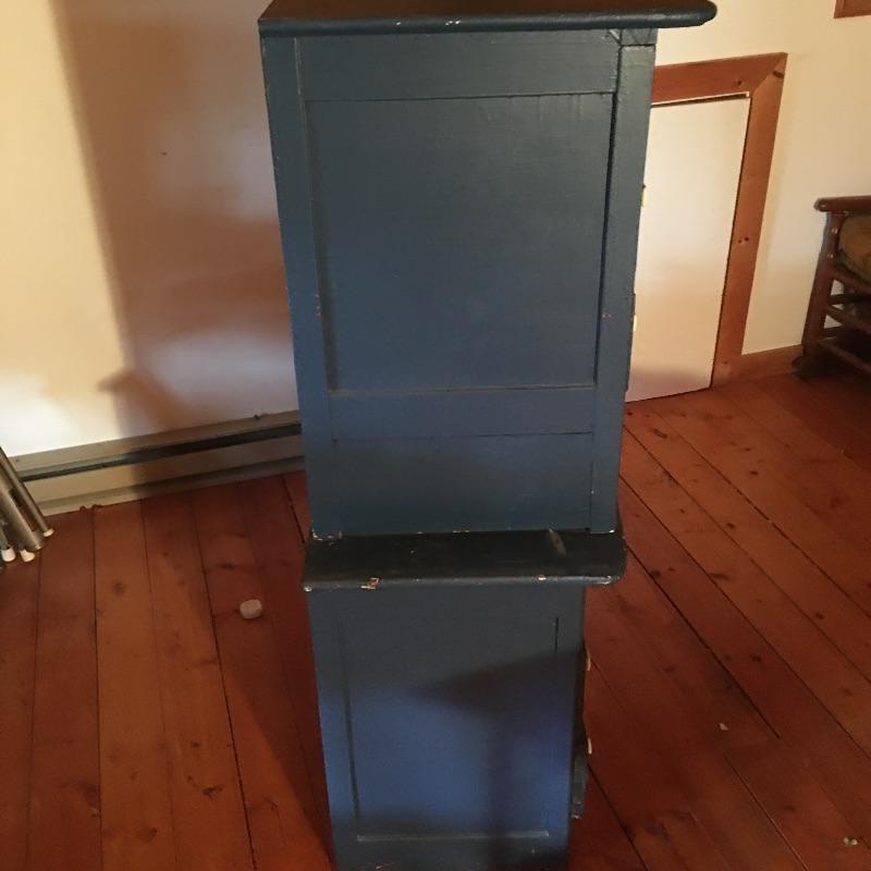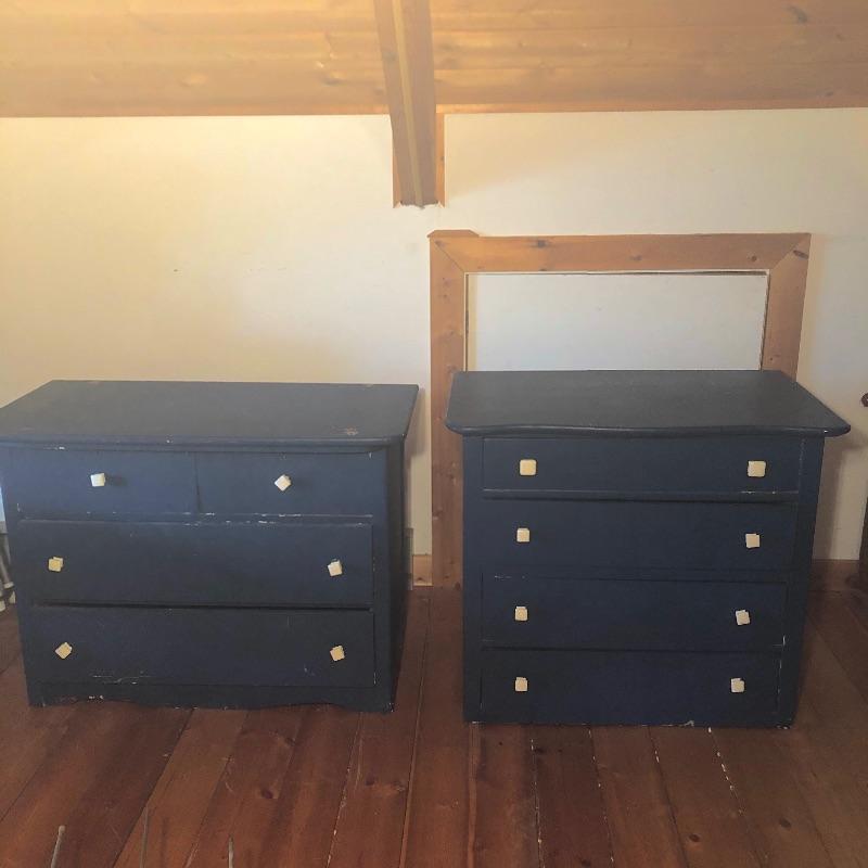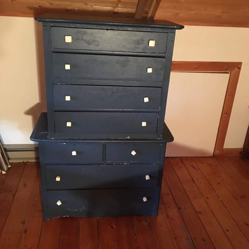 This pair of blue chest of drawers has been used stacked on top of each other, but are two separate pieces, see pictures. Get lots of storage with this pair of four drawer chest of drawers. Chests have some scratches and nicks and One chest has four places on top that are worn off, see pictures; a new paint job may be in order! Chests measure 18” x 36” x 26” and 20” x 31” x 27.5”.