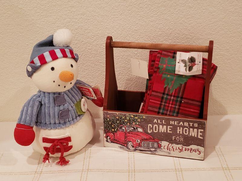 Lot 209: NEW Holiday Tool Box Deco, (8) Foleys Cloth Napkins & Snowman