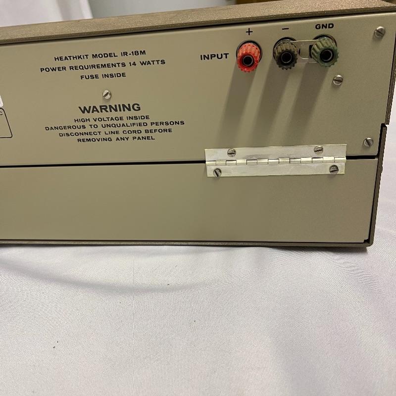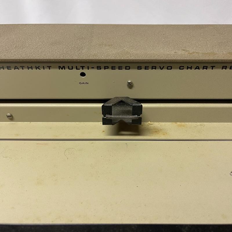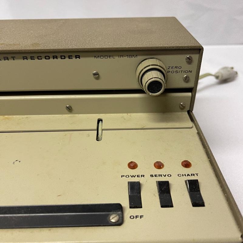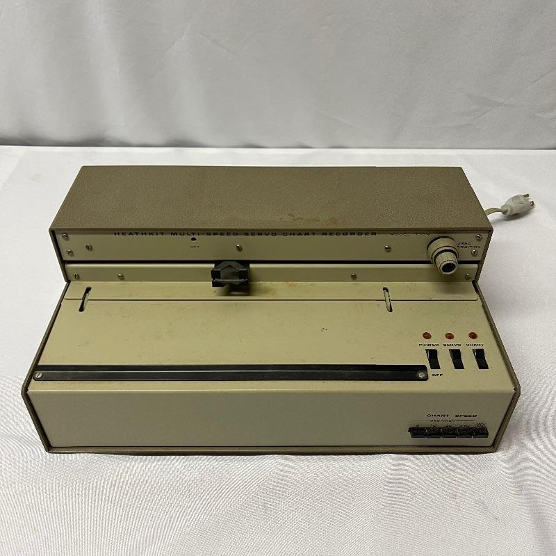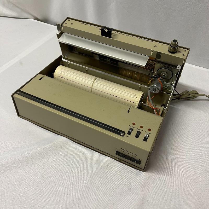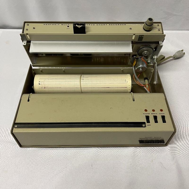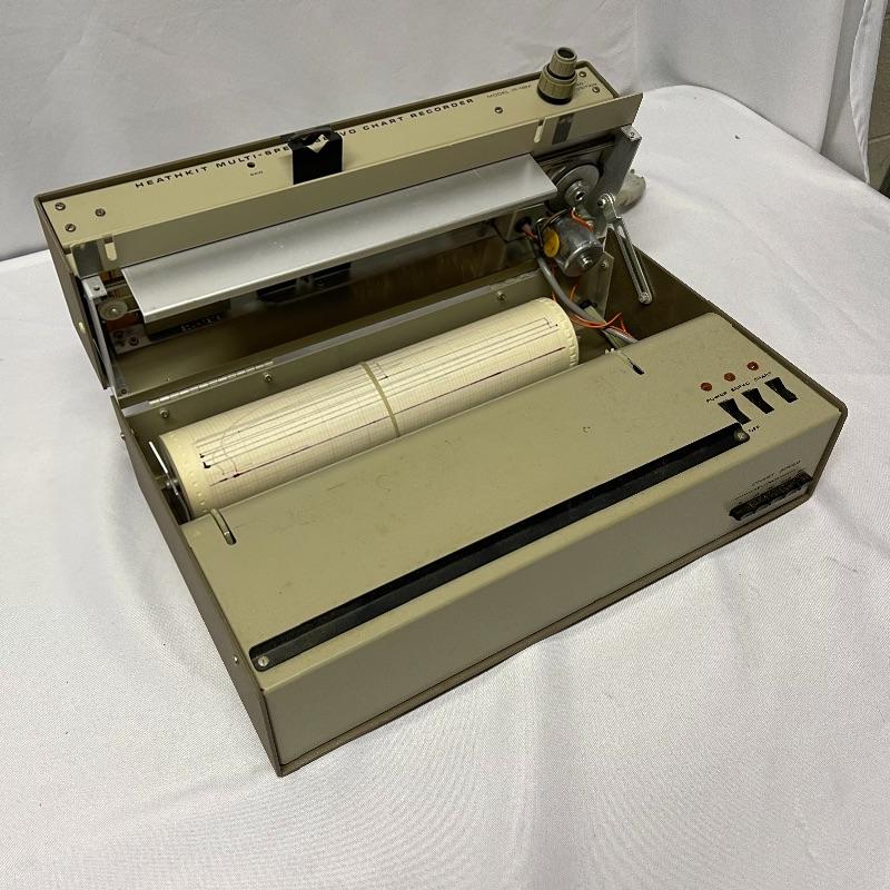 Heathkit Multi-Speed Servo Chart Recorder with a roll of paper inside. The model number is IR-18M. When plugged in, it powered on.