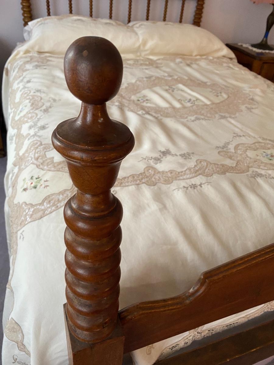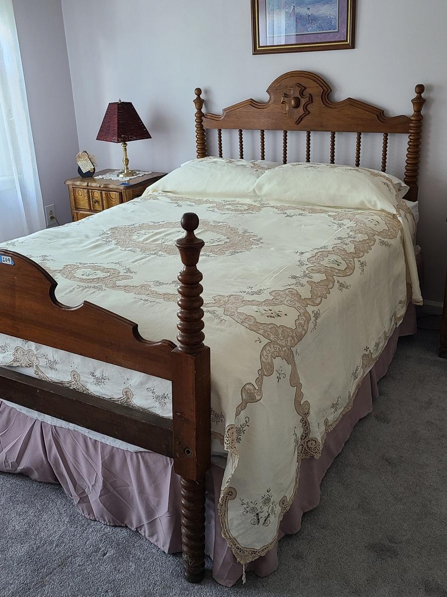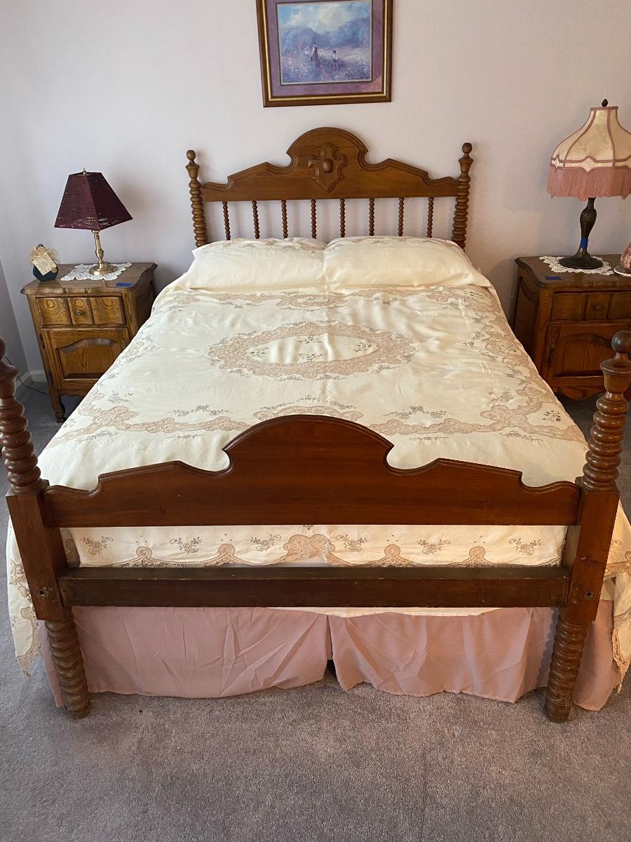 Lot 209: Antique Wood Spindle Leg Full Size Bed with Queen Mattresses (optional)