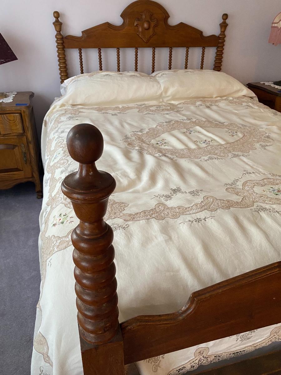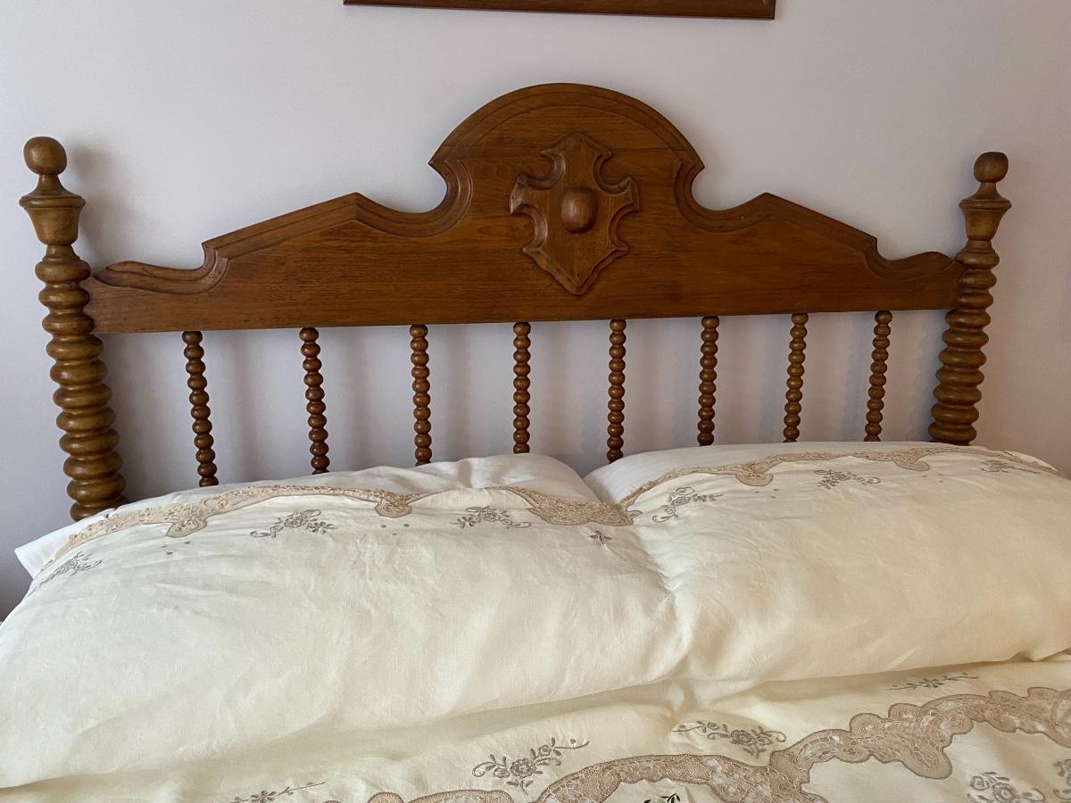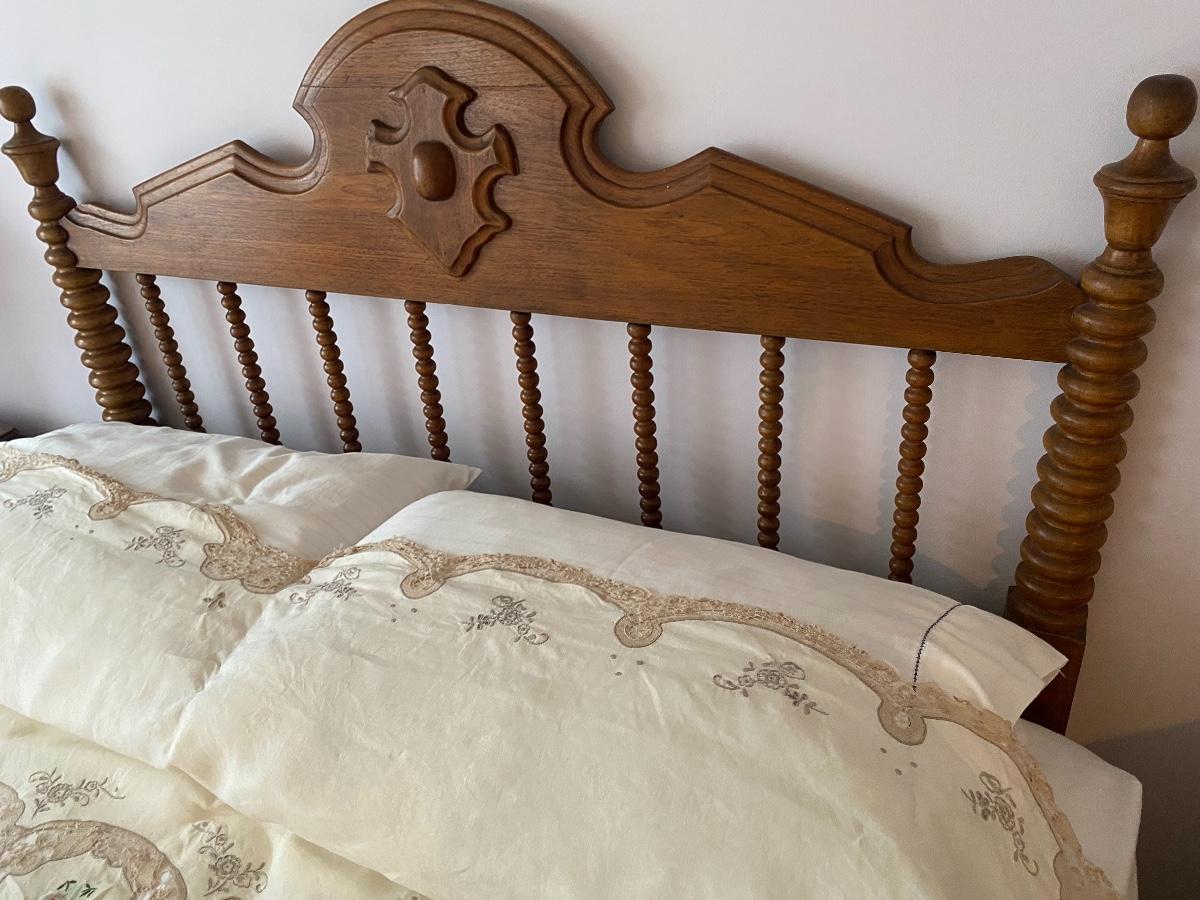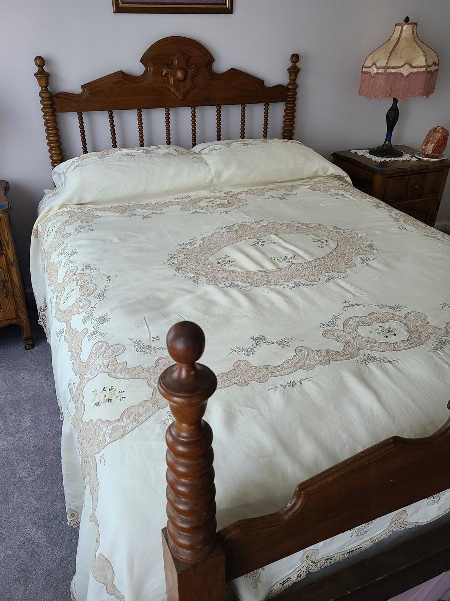 Lot 209: Antique Wood Spindle Leg Full Size Bed with Queen Mattresses (optional)