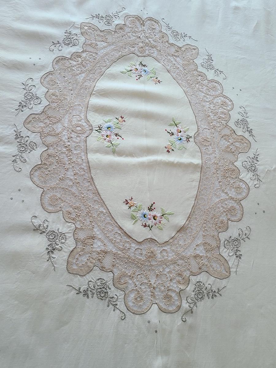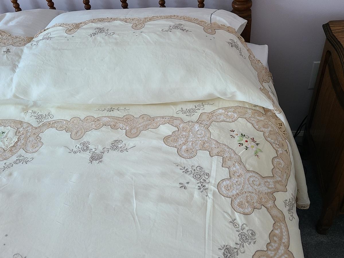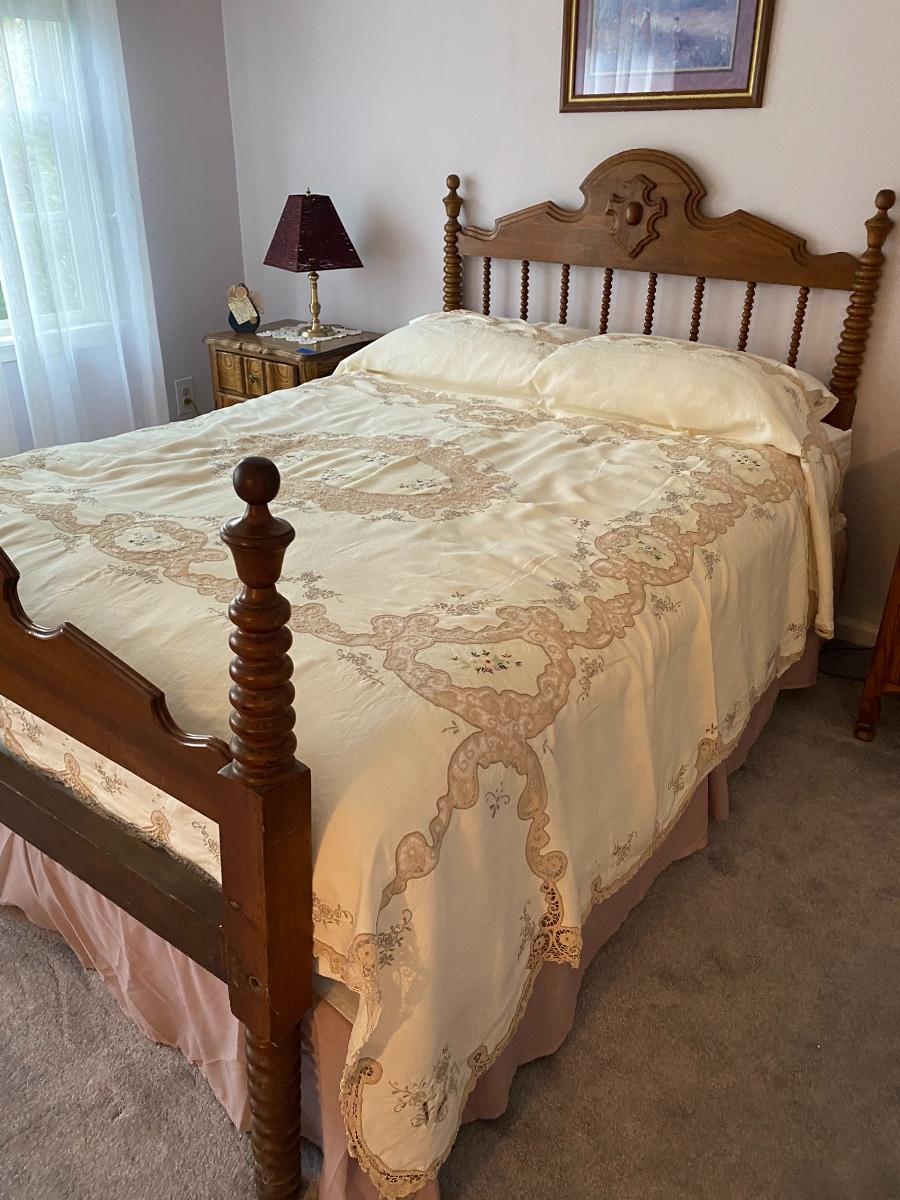 This lovely antique bed is gorgeous and comes with side rails, (not pictured), the headboard and full board, and bedding. The framing is full-size but has a queen size mattress and bedding. Pre-owned. Mattress/Bedspring is optional. Please see all pictures as they are the best representation of the items in the lot, the condition of the lot, and will show measurements if taken. If purchasing furniture you must be able to move yourself with your own help, and truck. This is located on the first floor.