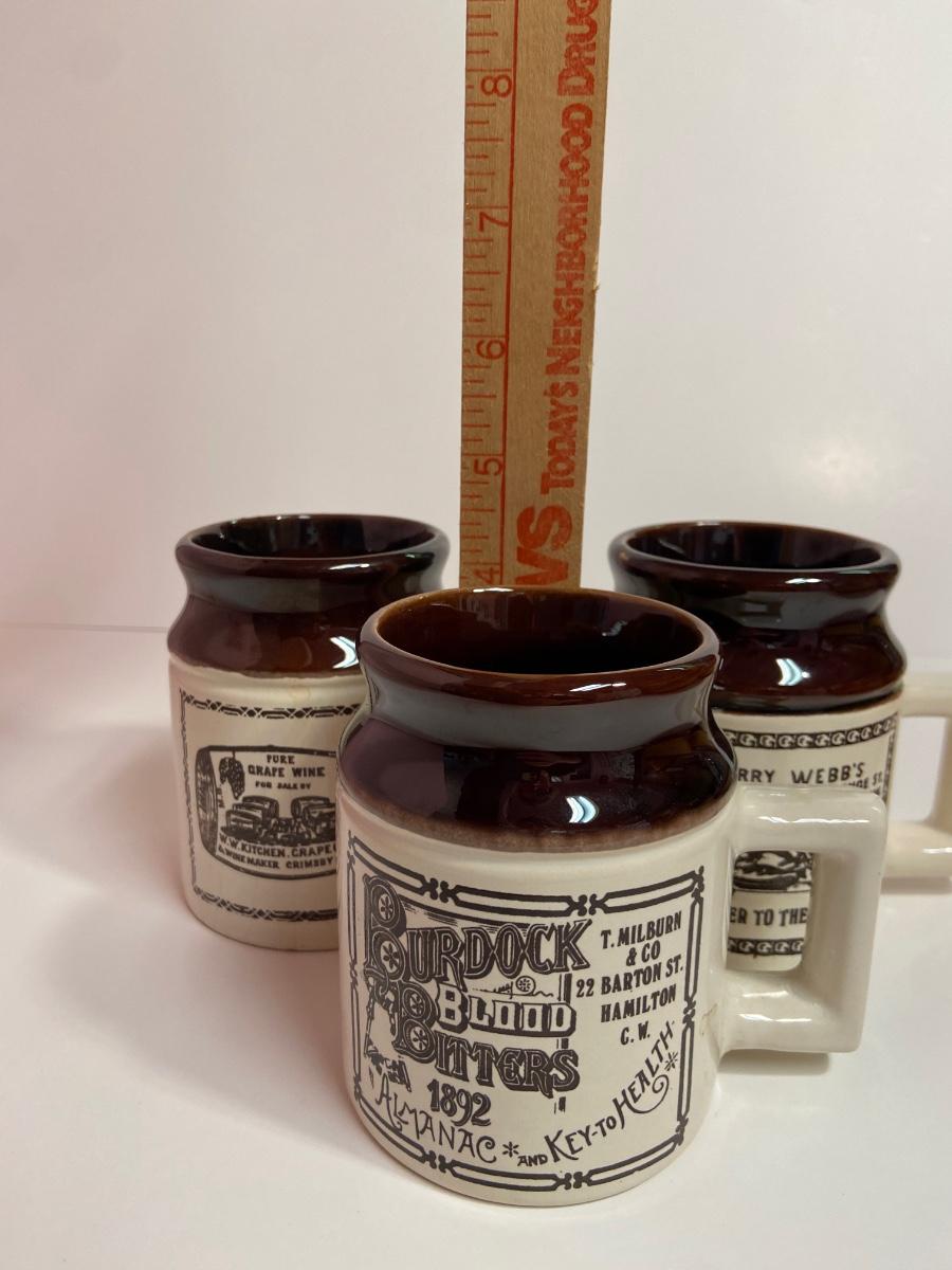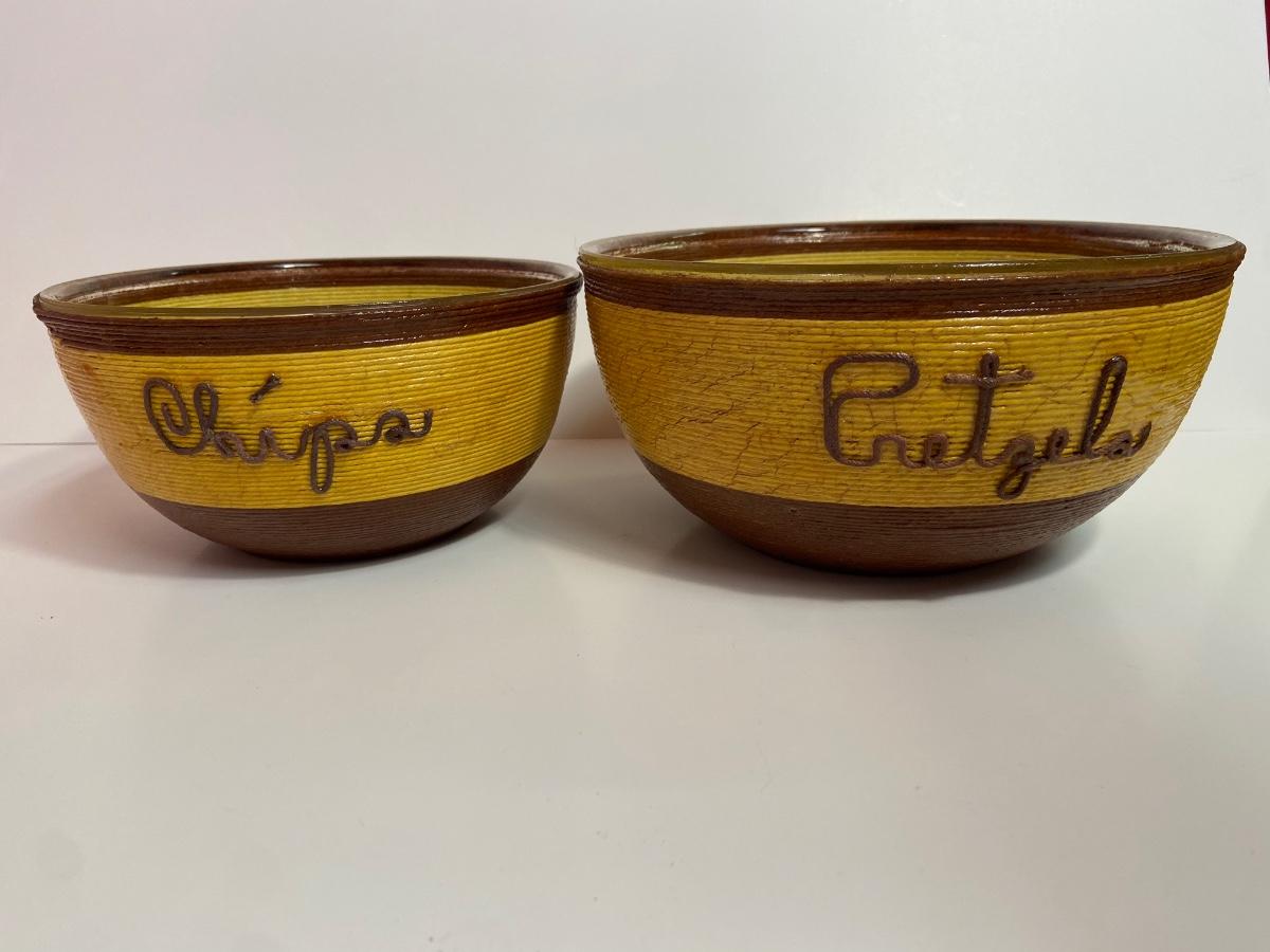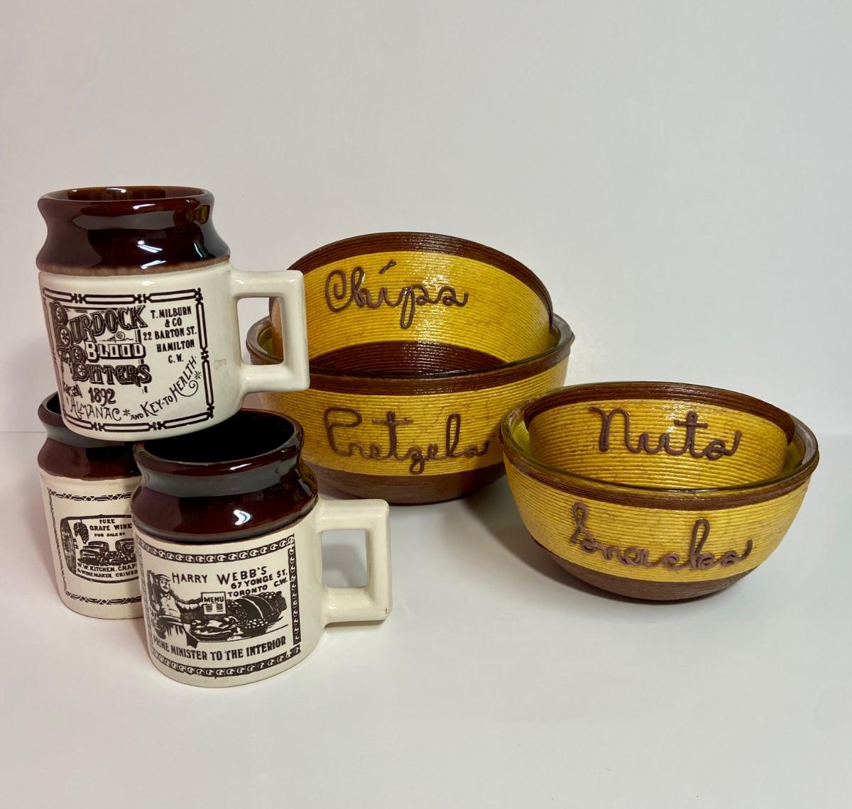 Lot 209; MCM Snack bowls & Abenakis Pottery  Advertising Crock Mugs