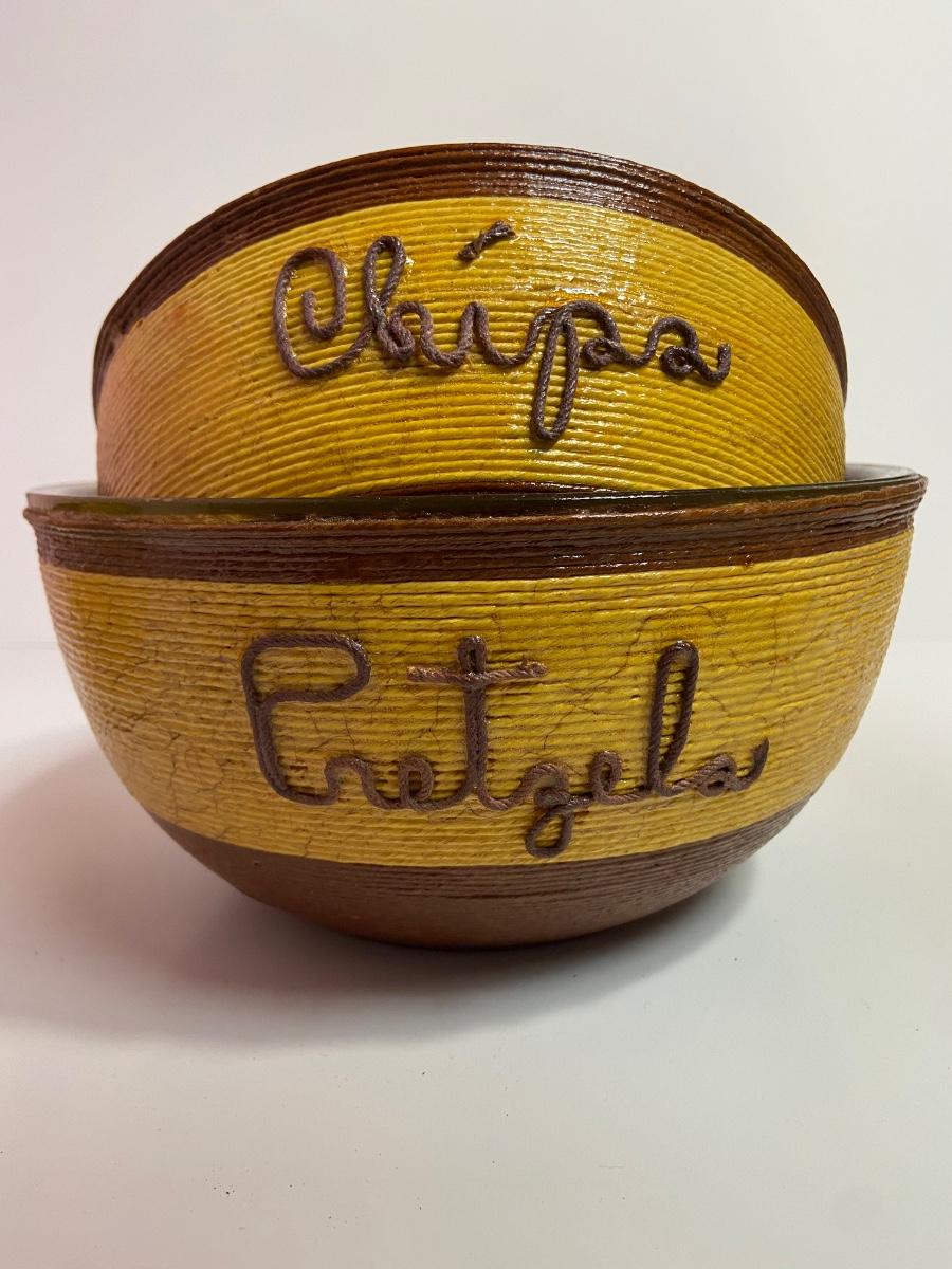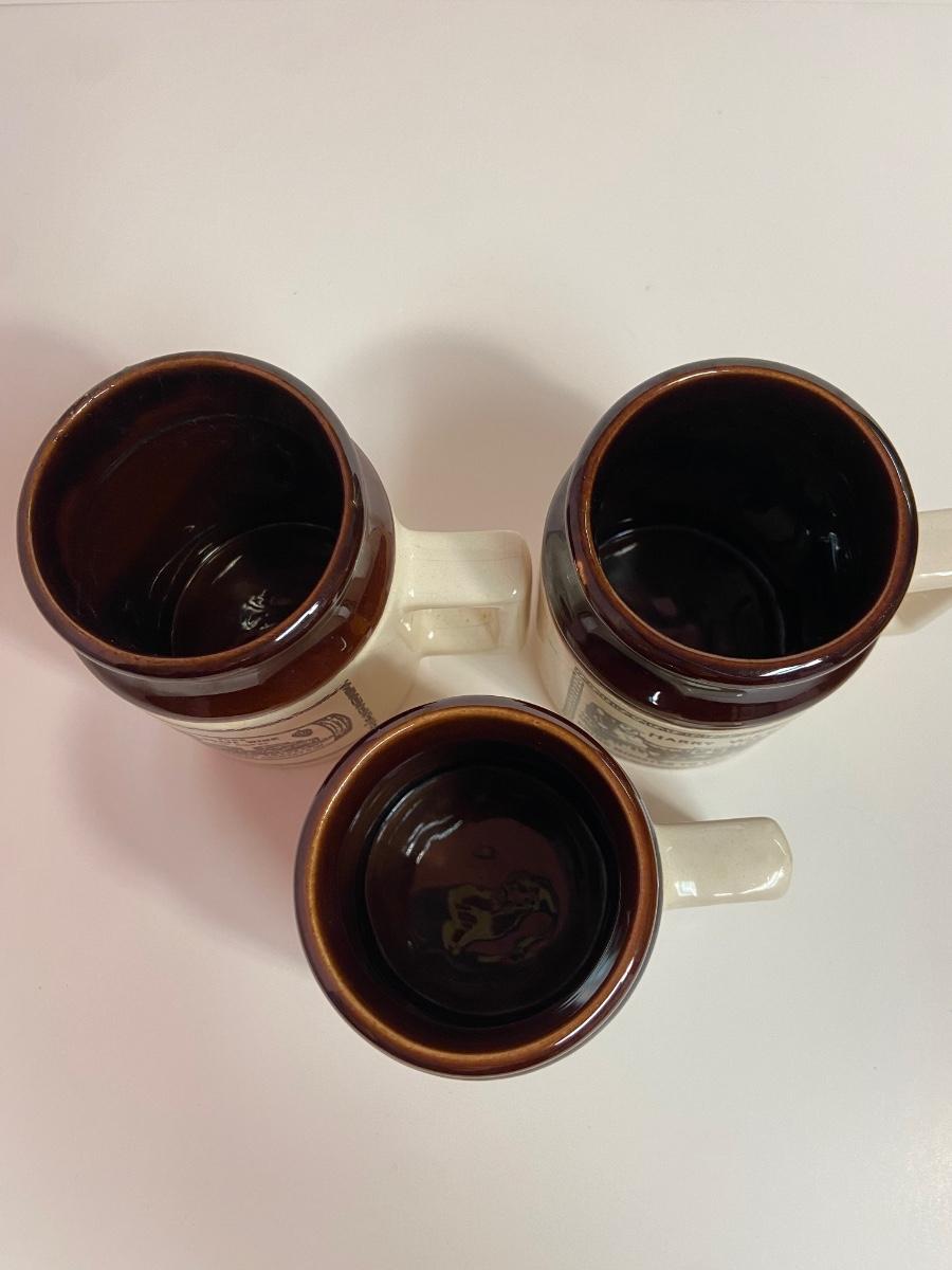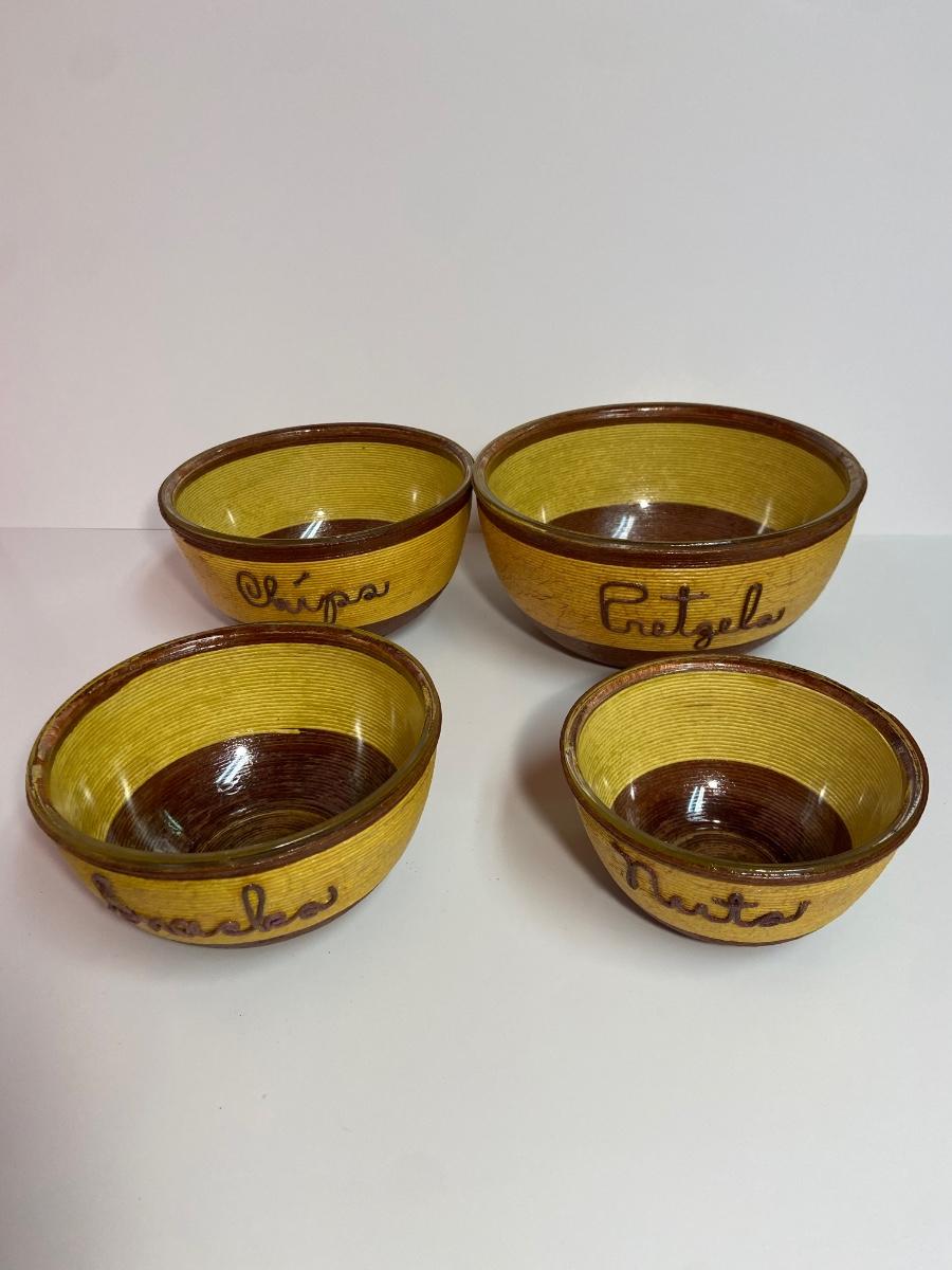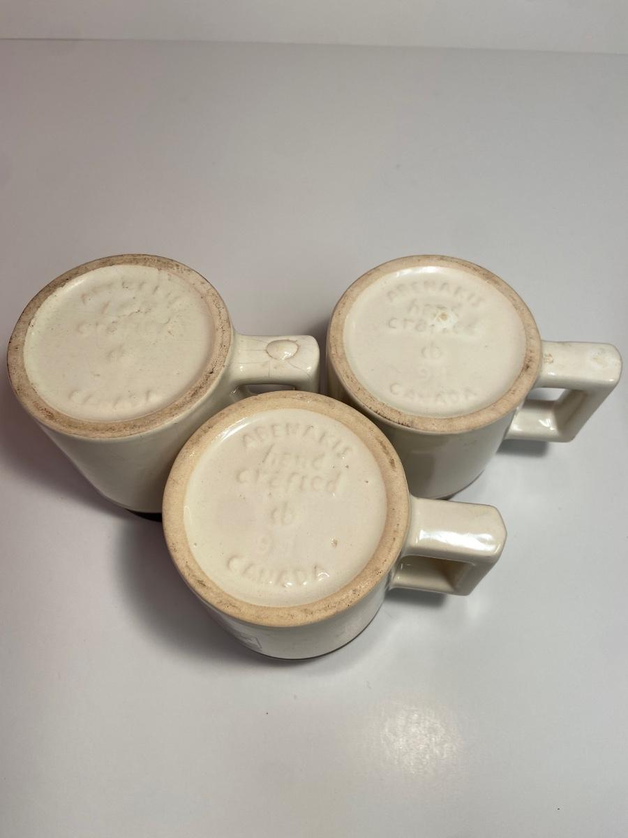Collection of vintage snack bowls and a set of 3 Abenakis Pottery advertising mugs.