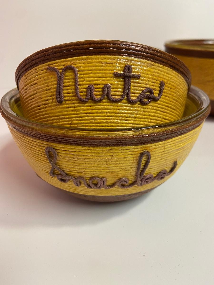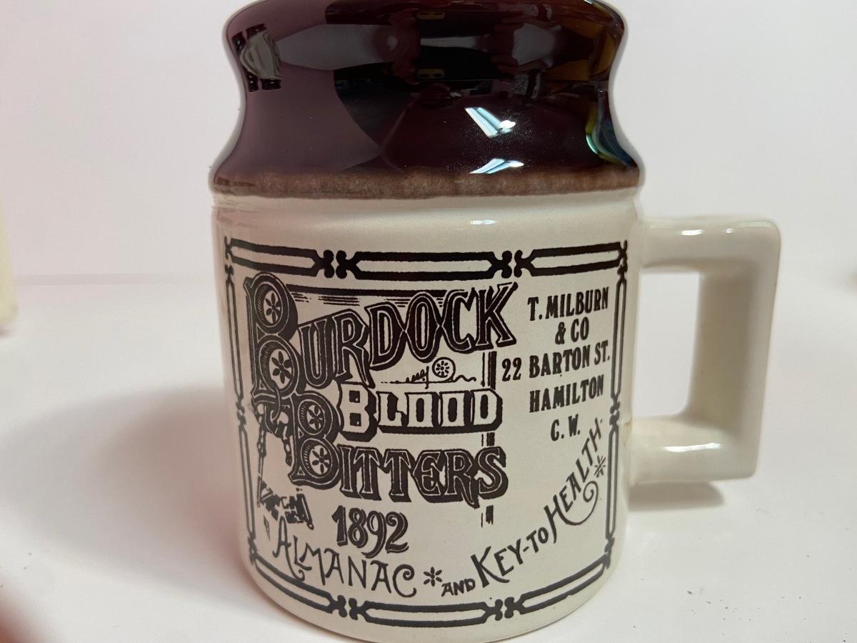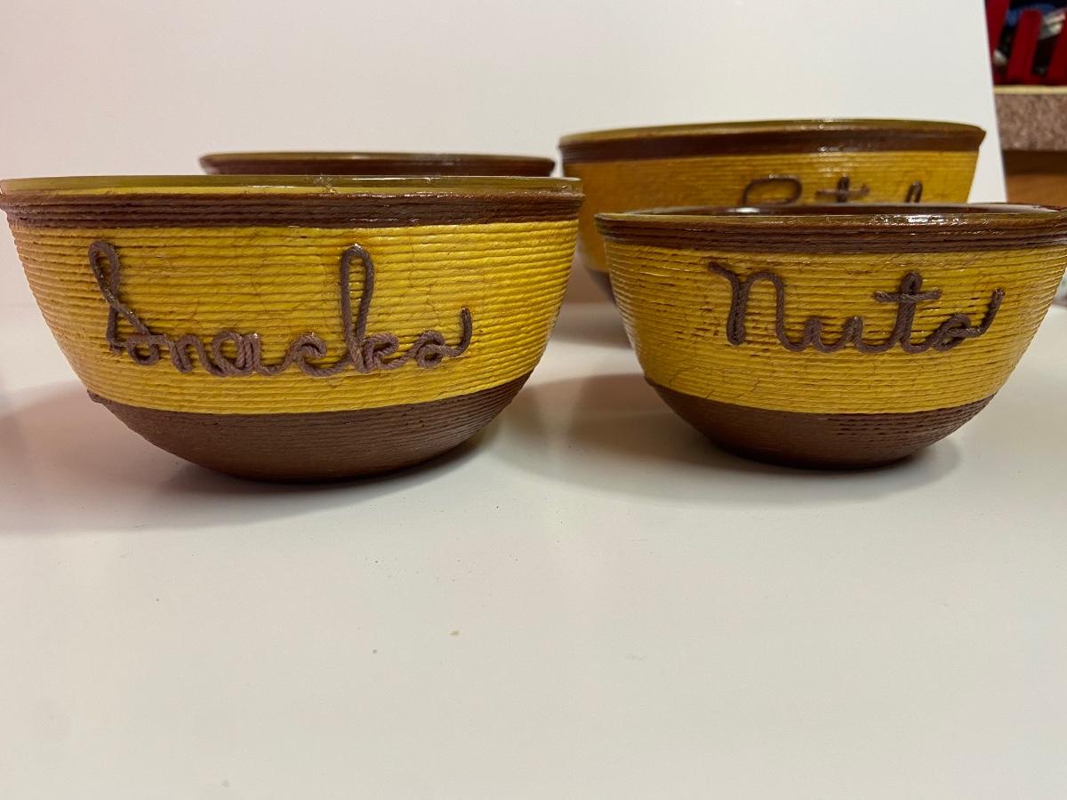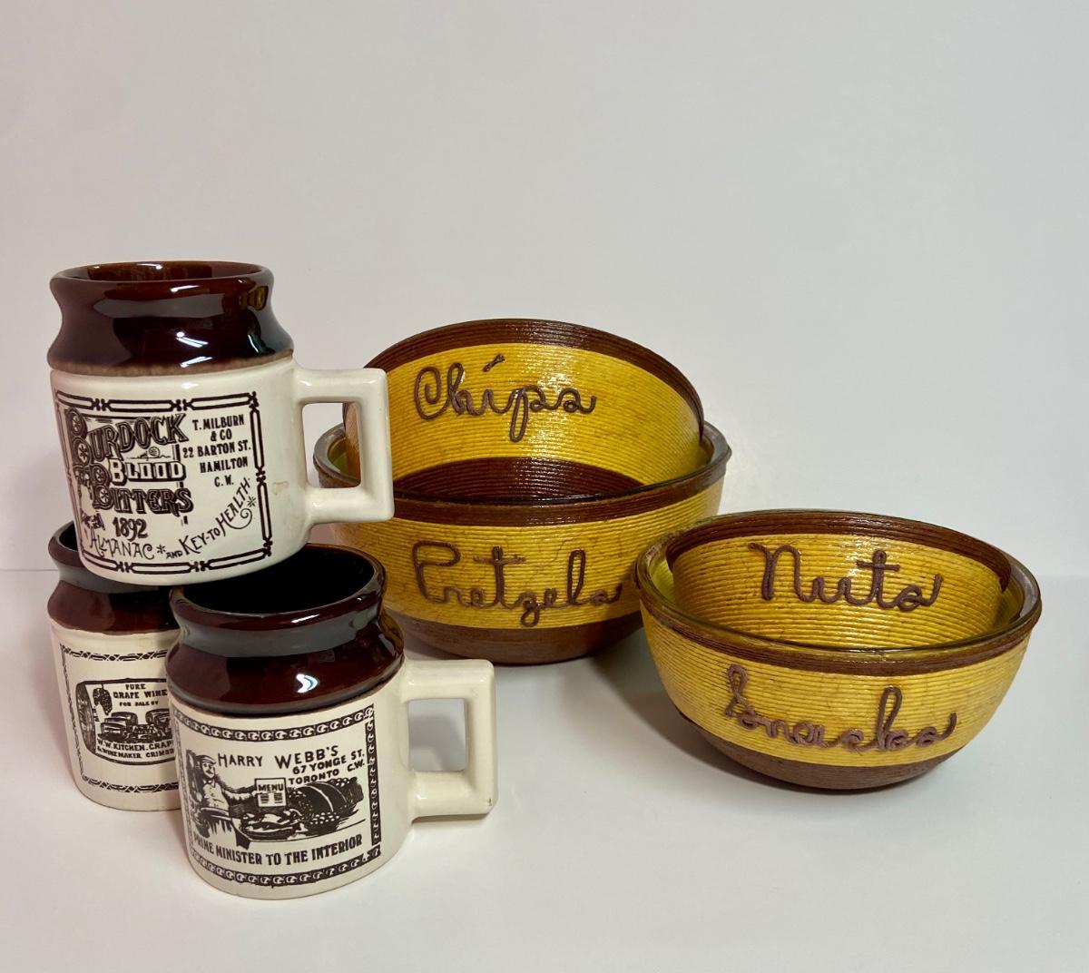 Lot 209; MCM Snack bowls & Abenakis Pottery Advertising Crock Mugs
