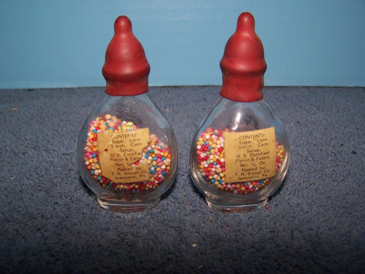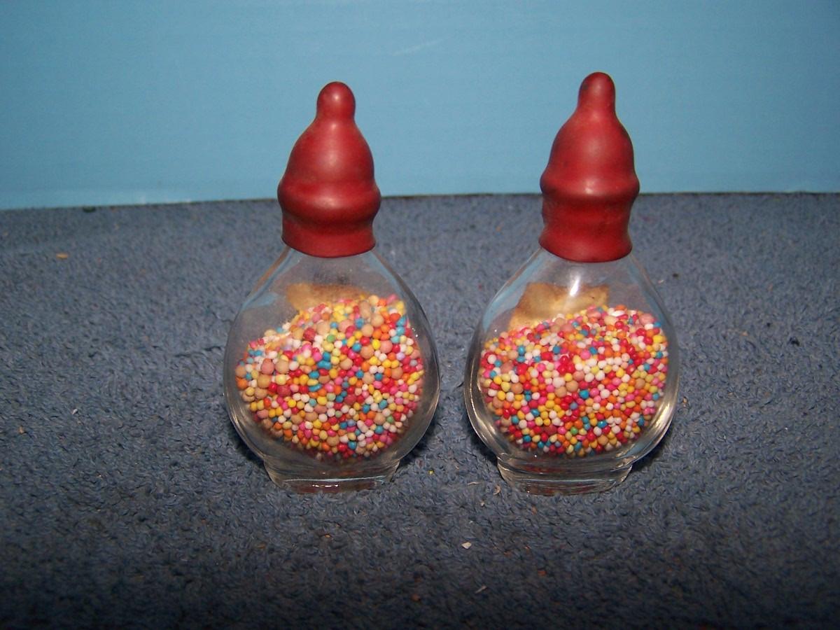 THESE ARE WONDERFUL VINTAGE GLASS BABY BOTTLE CANDY CONTAINERS!!! 3'' TALL.. ALL ORIGINAL.. SLIGHT WEAR..