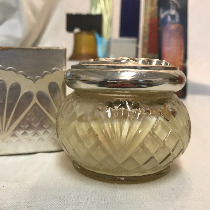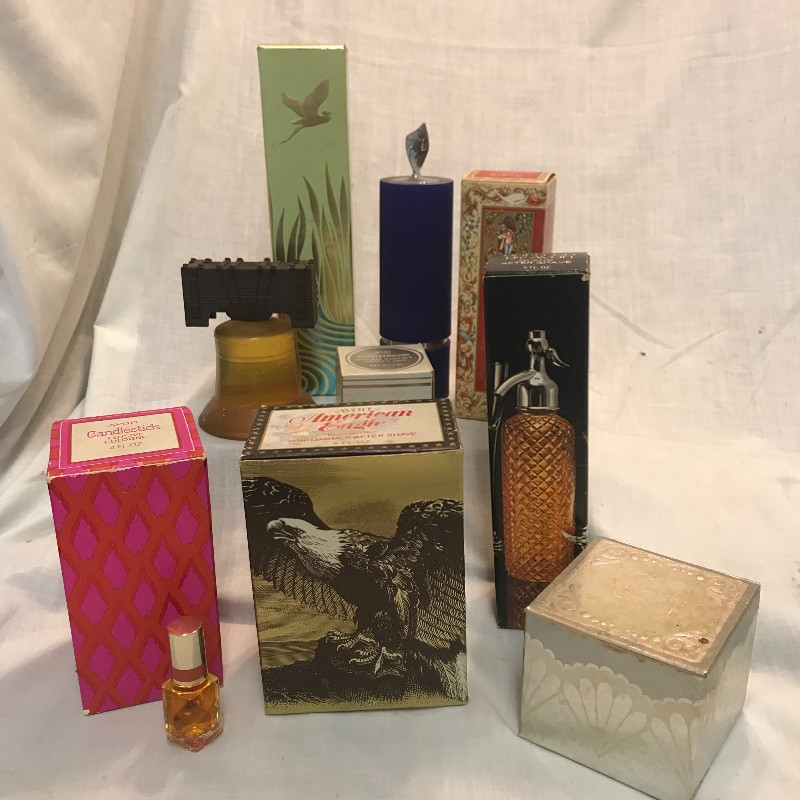 Fun collection of vintage perfumes and colognes. Most bottles have original boxes, although they show their age. Most scents also appear unused, but show some evaporation. Two vanity jars with cream appear to have dehydrated products inside. See images. Sterling Transitions cannot verify the contents of the bottles. Shipping available.