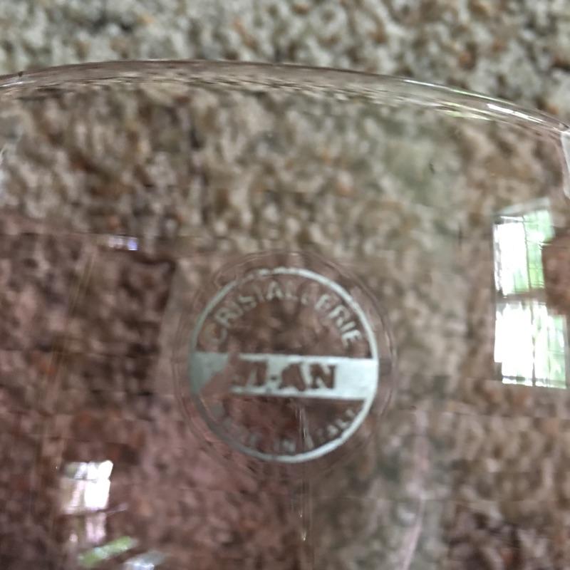 Variety of colored purple colored stemware including eight chalices that are more pink in color with green stems , three champagne,three cordial and four wine glasses. Chalice measures 6.5” tall.