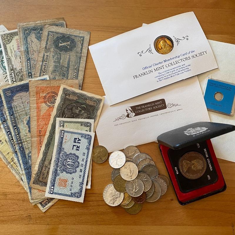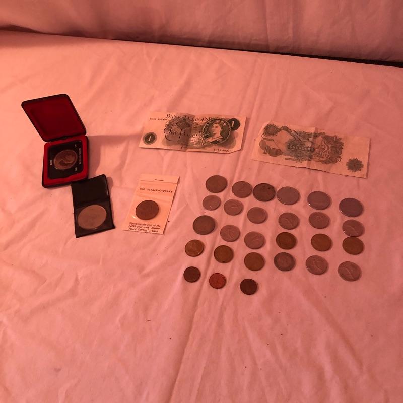 This lot includes fourteen paper notes and thirty two coins. Pictures include front and back of coins. Come and see this treasure during our preview. Shipping Available.