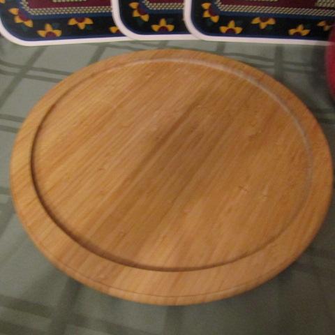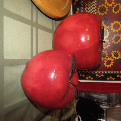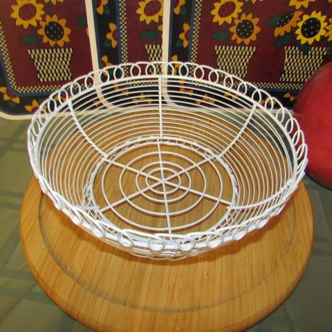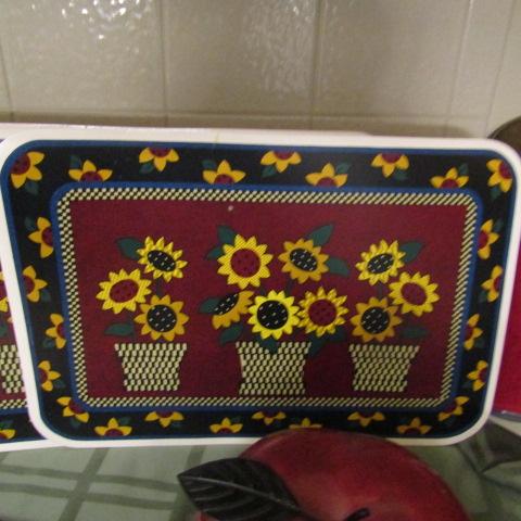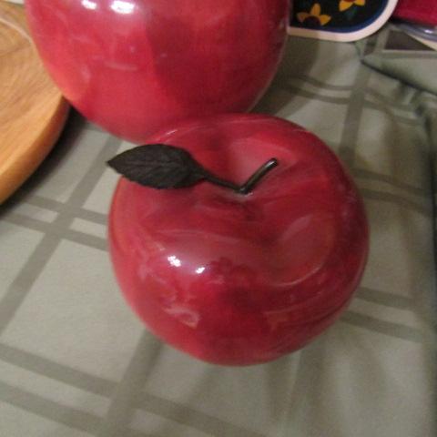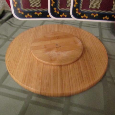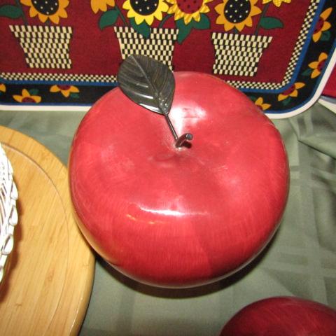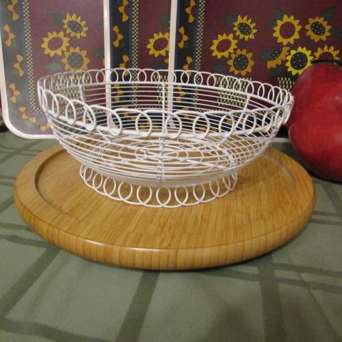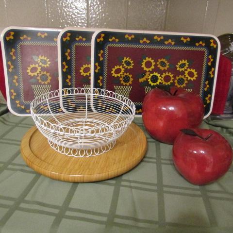 4 PLASTIC PLACEMATS, 2 CERAMIC APPLES WITH METAL STEM, METAL BASKET, WOODEN LAZY SUSAN