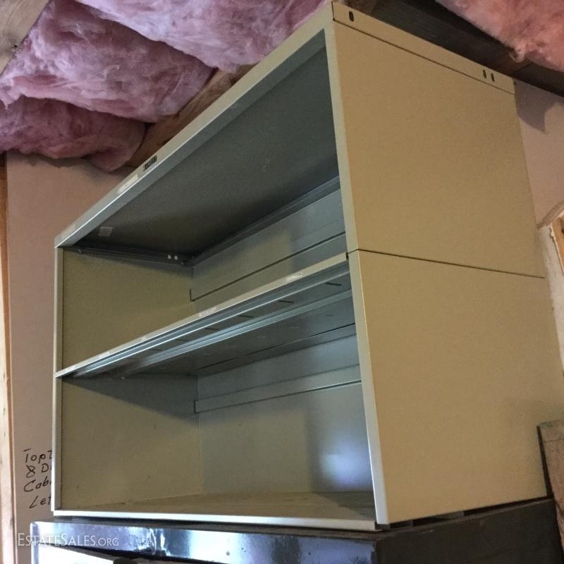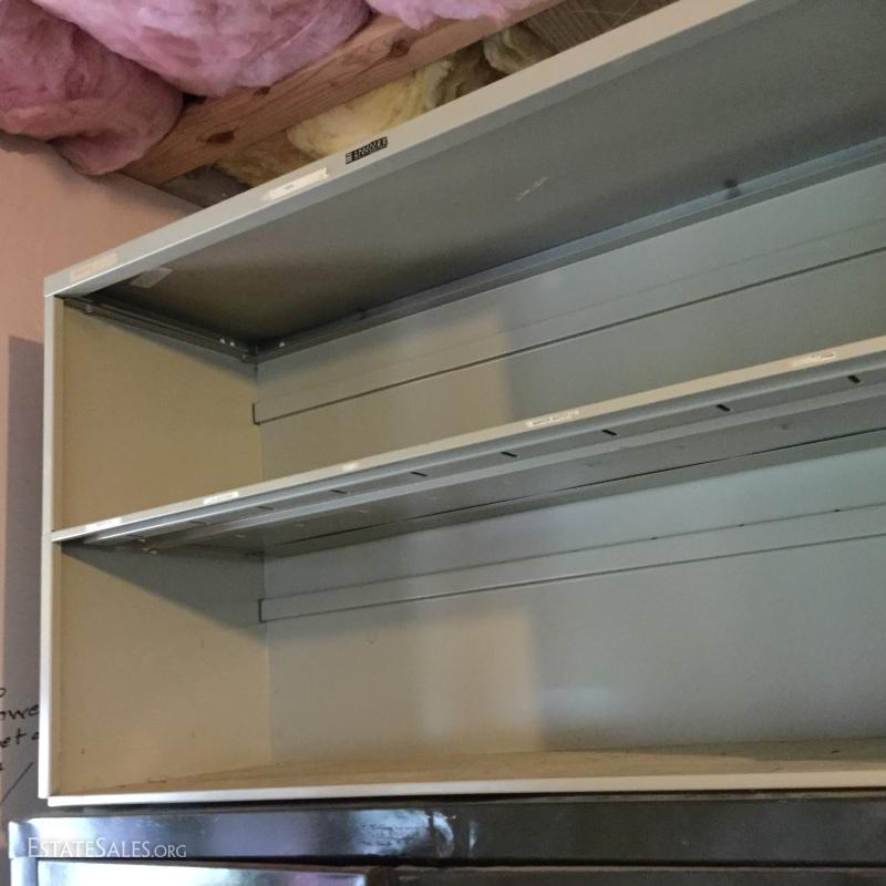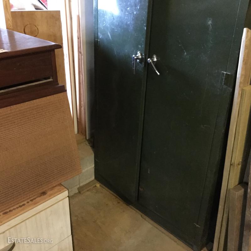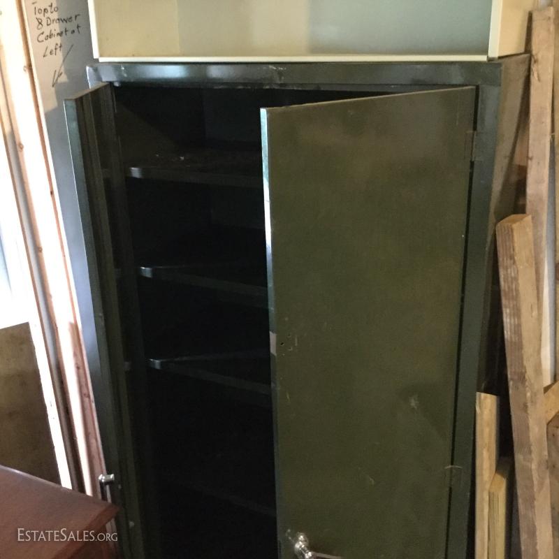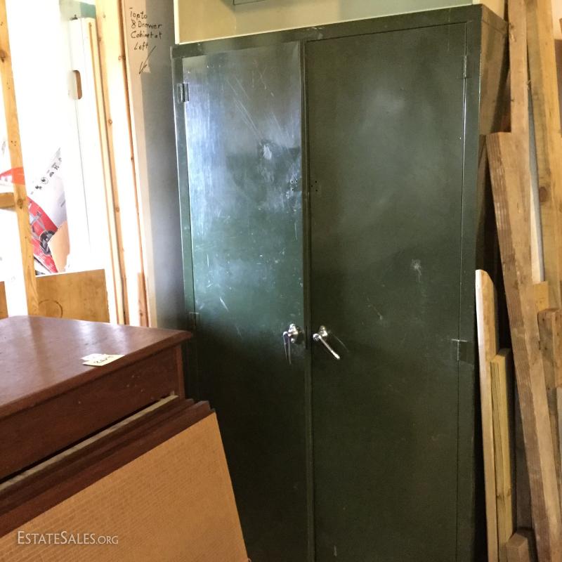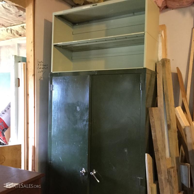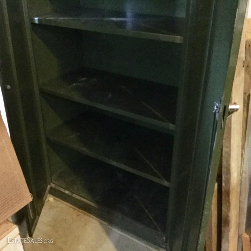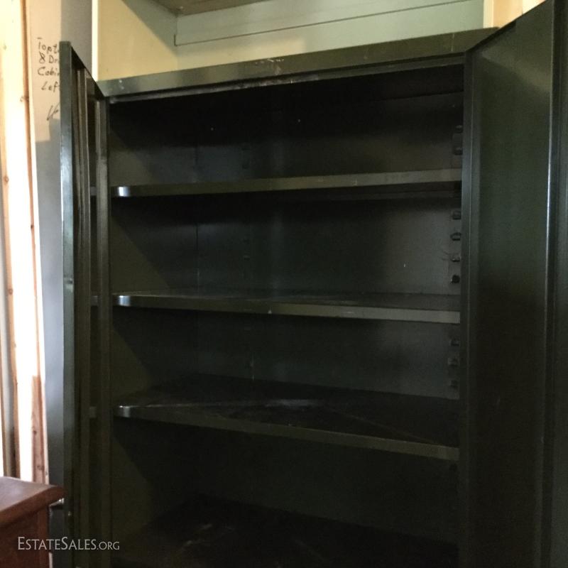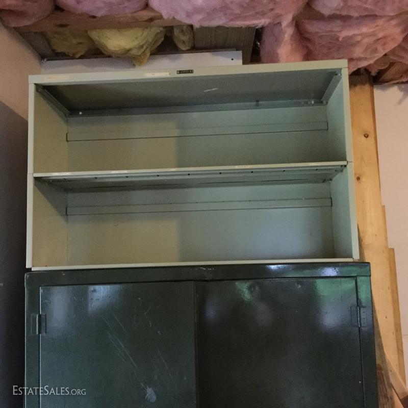 Large metal two-door cabinet with shelves inside, 36"l x 18"w x 70.5"h. Metal open shelf, 36" l x 13"w x 22"h.