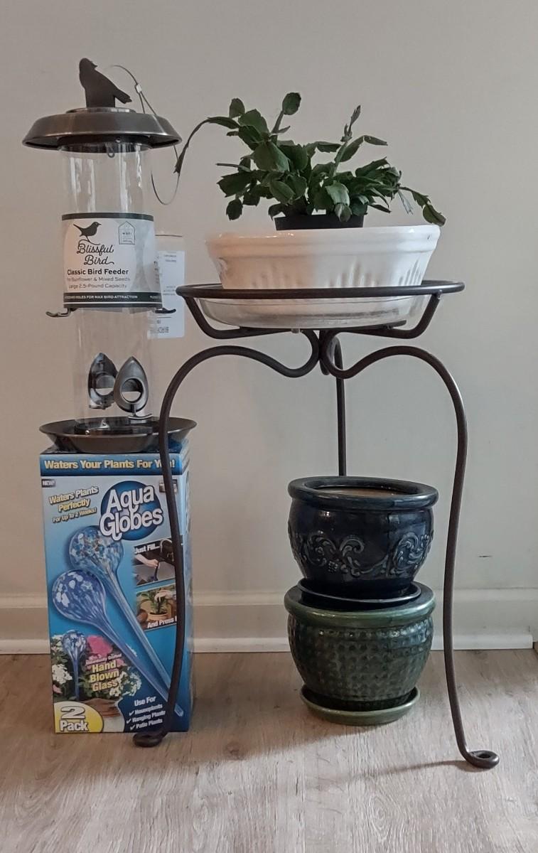 Lot 209: Plant Stand, New Bird Feeder, Christmas Cactus Plant & More