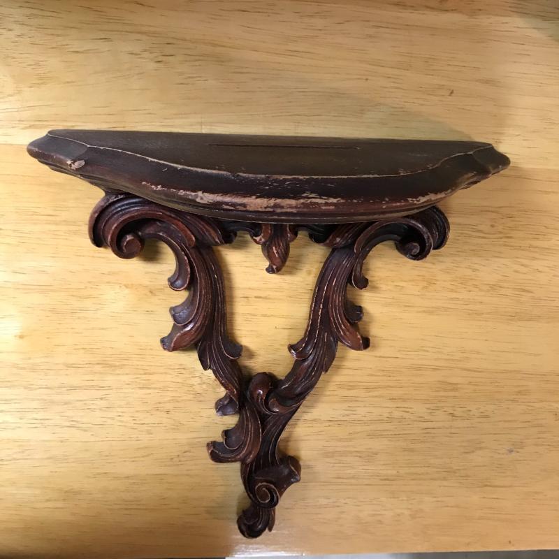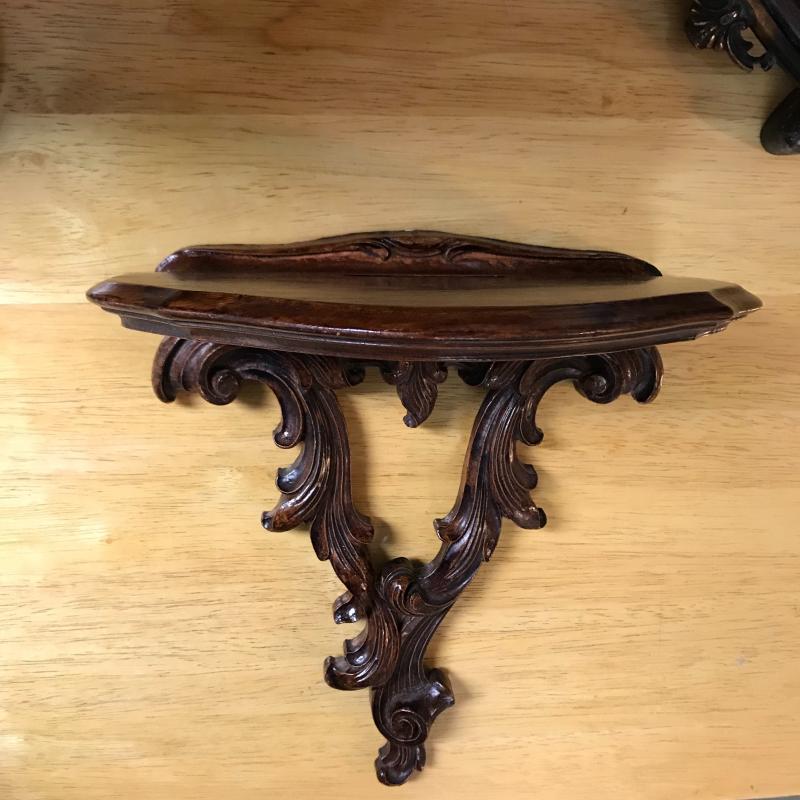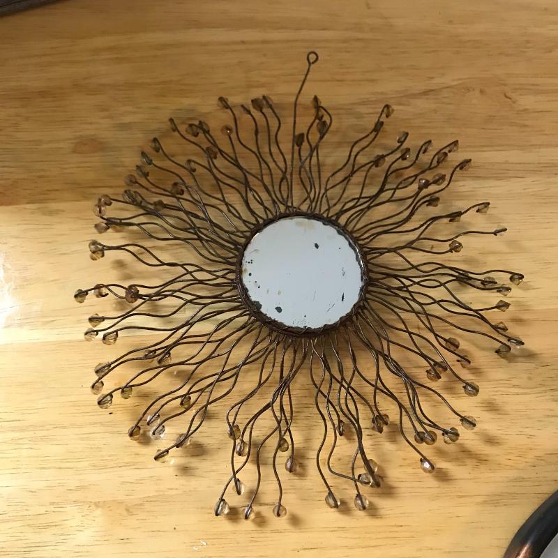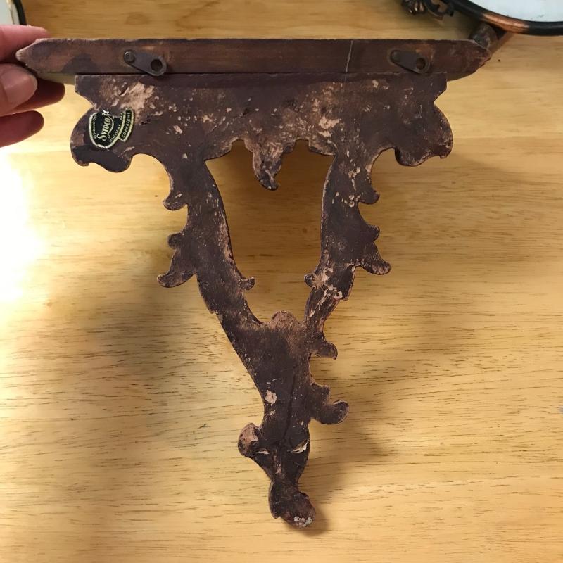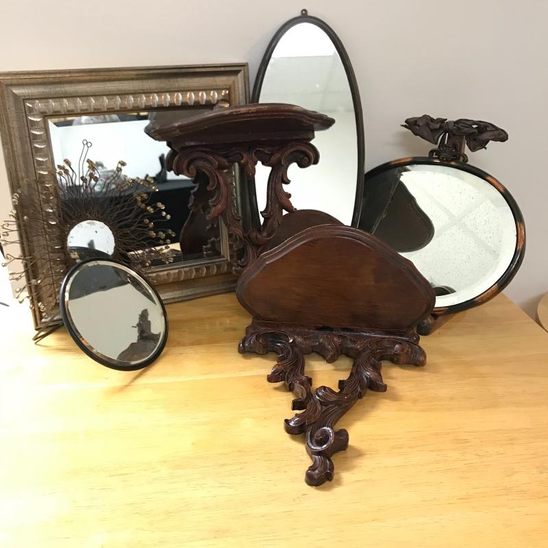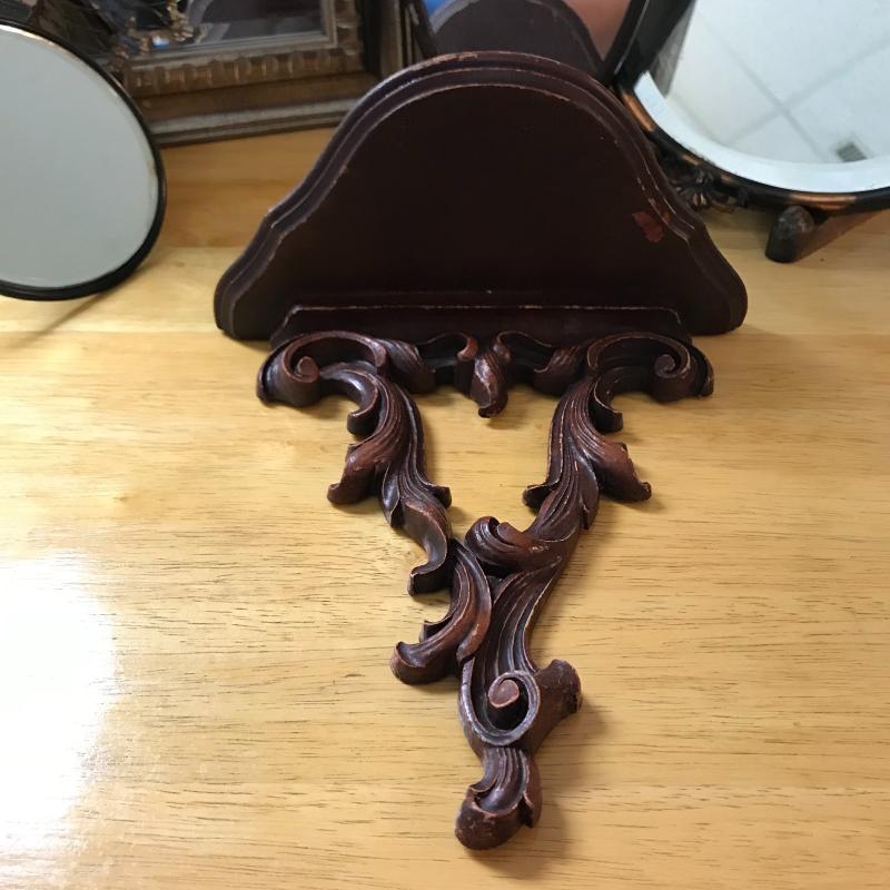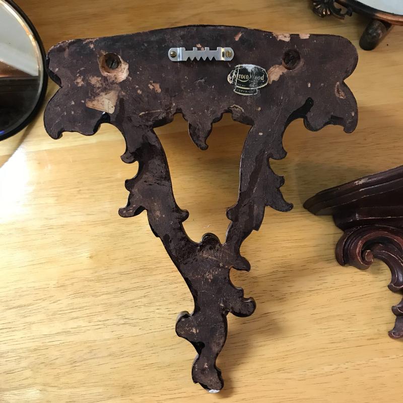 Two gorgeous small wooden wall shelves with slightly different designs along with five small mirrors. The silver painted wood framed mirror measures 11.5”x11.5”. The other mirrors appear to have metal frames and the smallest “sun” mirror has yellow/amber beads and is double sided. Some wear is noted in photos. Local pick up only.