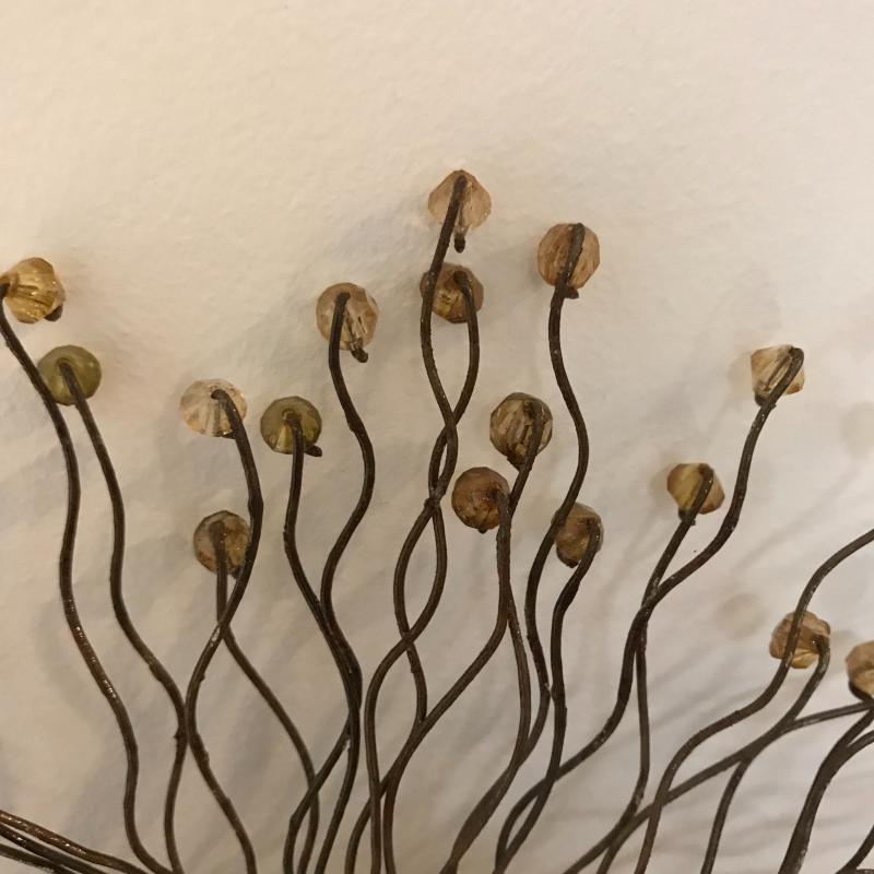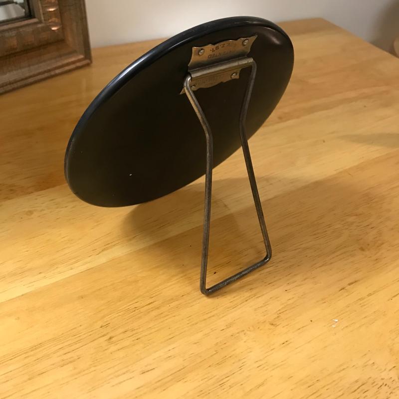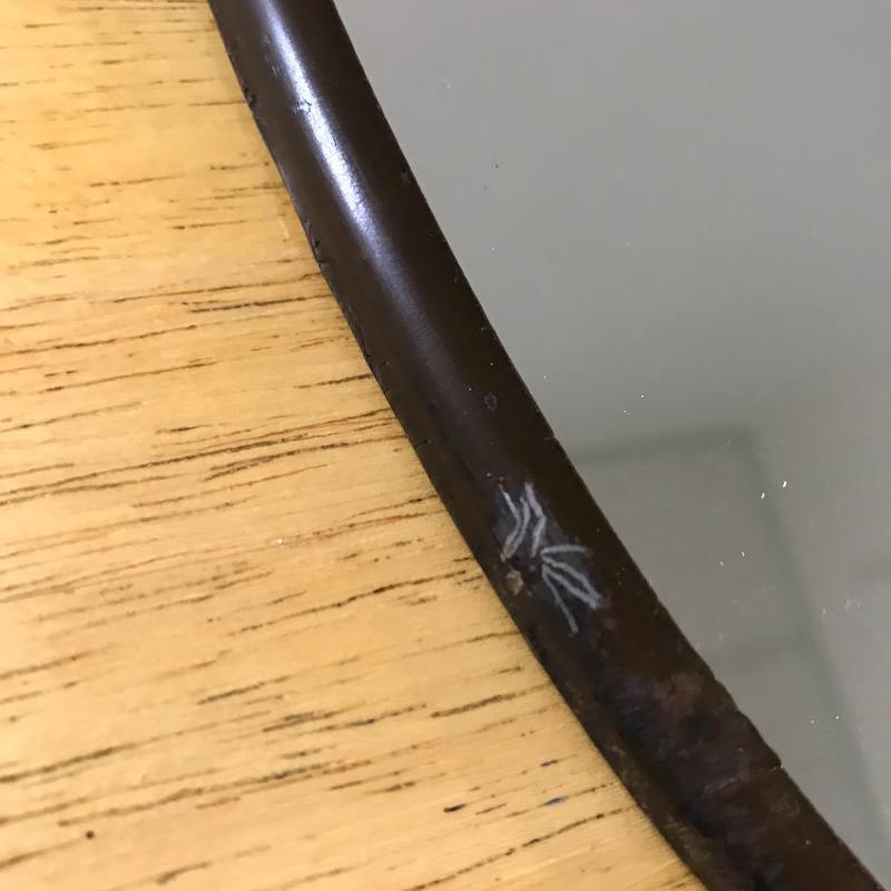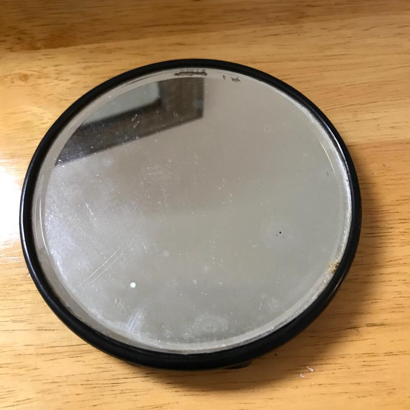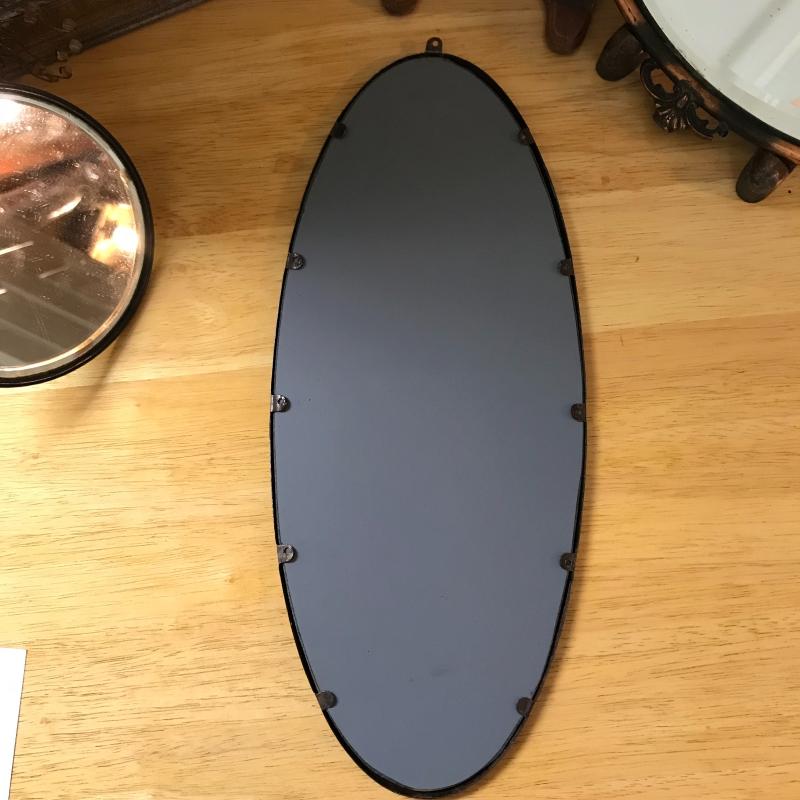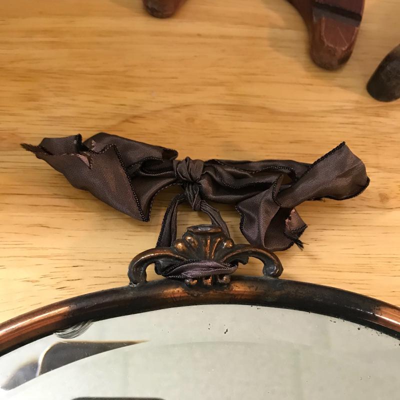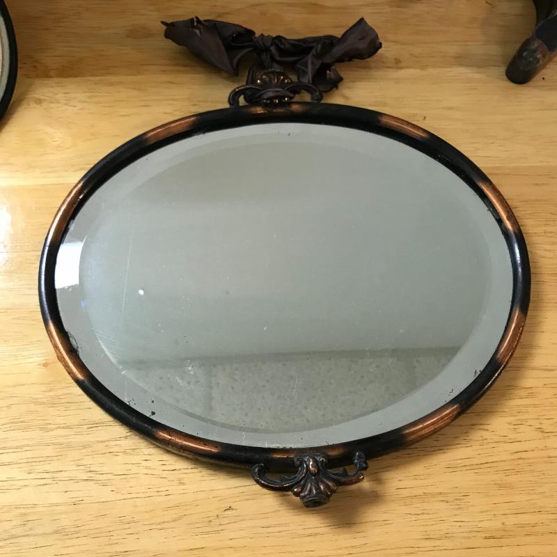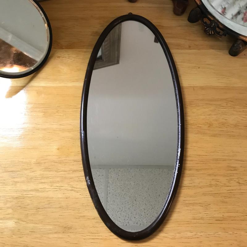 Two gorgeous small wooden wall shelves with slightly different designs along with five small mirrors. The silver painted wood framed mirror measures 11.5”x11.5”. The other mirrors appear to have metal frames and the smallest “sun” mirror has yellow/amber beads and is double sided. Some wear is noted in photos. Local pick up only.