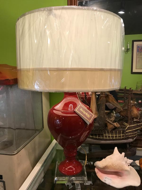 Brand new furniture store floor sample lamp by Sedgefield by Adams. Red ceramic pedestal urn form on lucite base. Inlcudes matching lucite finial. Two tone drum shade. New with tags. 19" D x 29" H