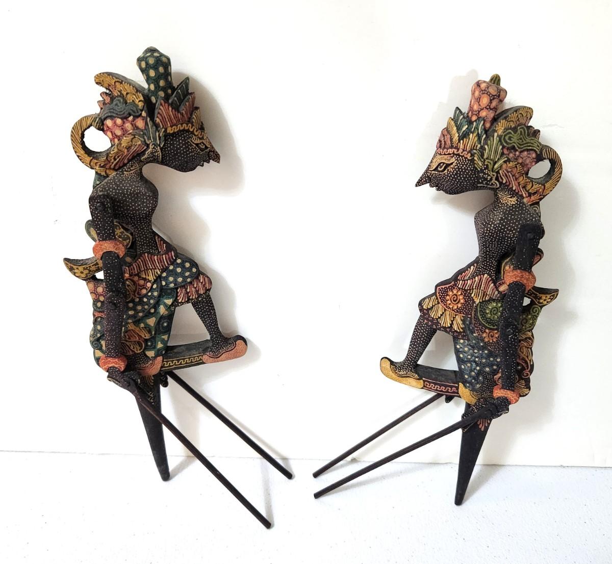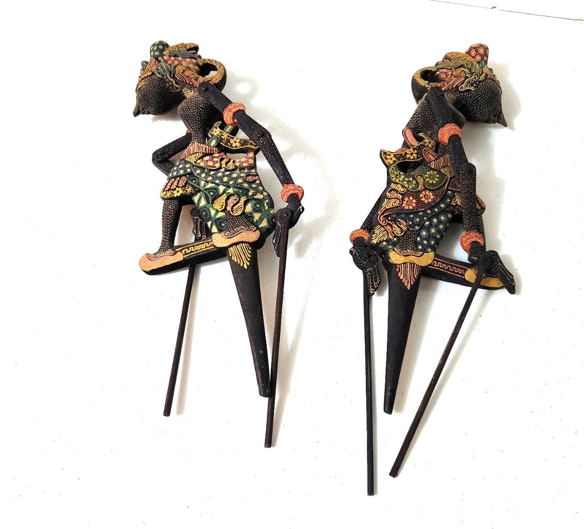 Beautifully painted pair of traditional Indonesian Rama & Sinta puppets - handmade, painted both sides - arms move by sticks attached. Painted using Batik techniques. Used to depict the epic struggle in which characters Ramba and Sinta survive a series of challenges that prove their unconditional love and purity, elevating marriage to a divine status. These puppets probably had some type of base at one time. 11" tall. These have some age to them.