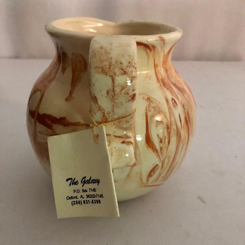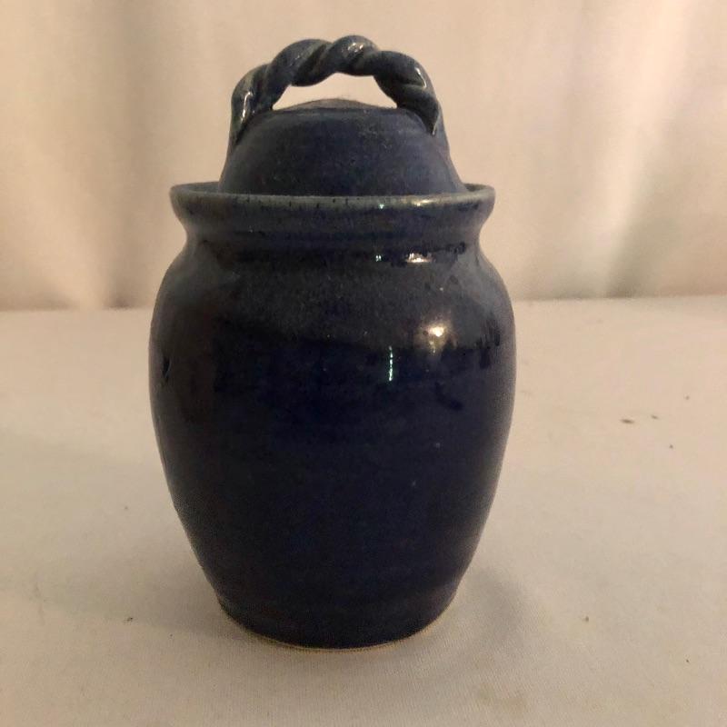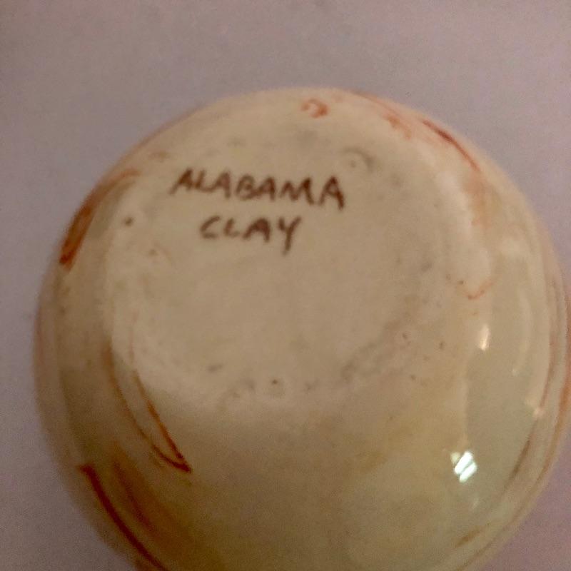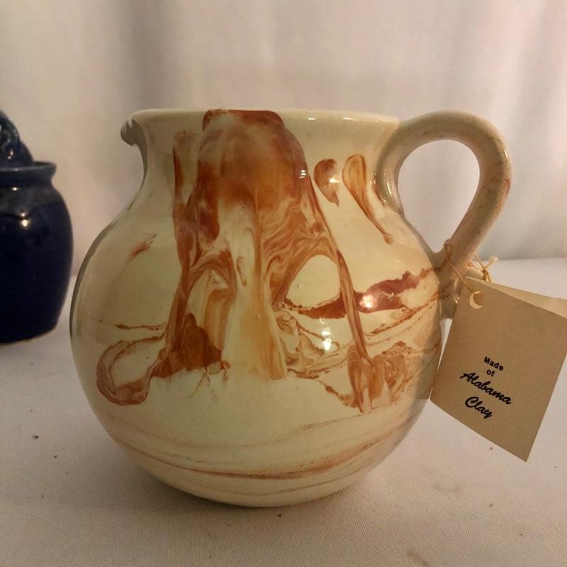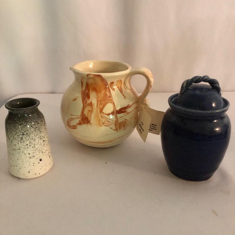 Three pieces of pottery here that includes a gorgeous jug made of Alabama clay that measures 6” tall. Also included is a small lidded blue honey or jam pot and a small vase. See images for more information.