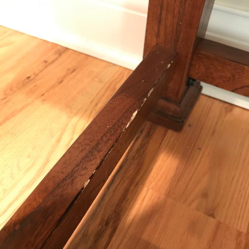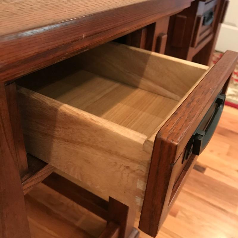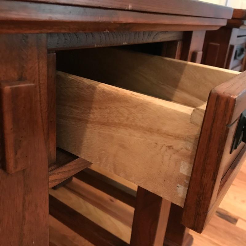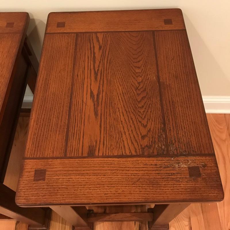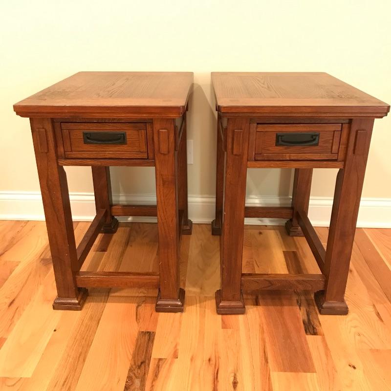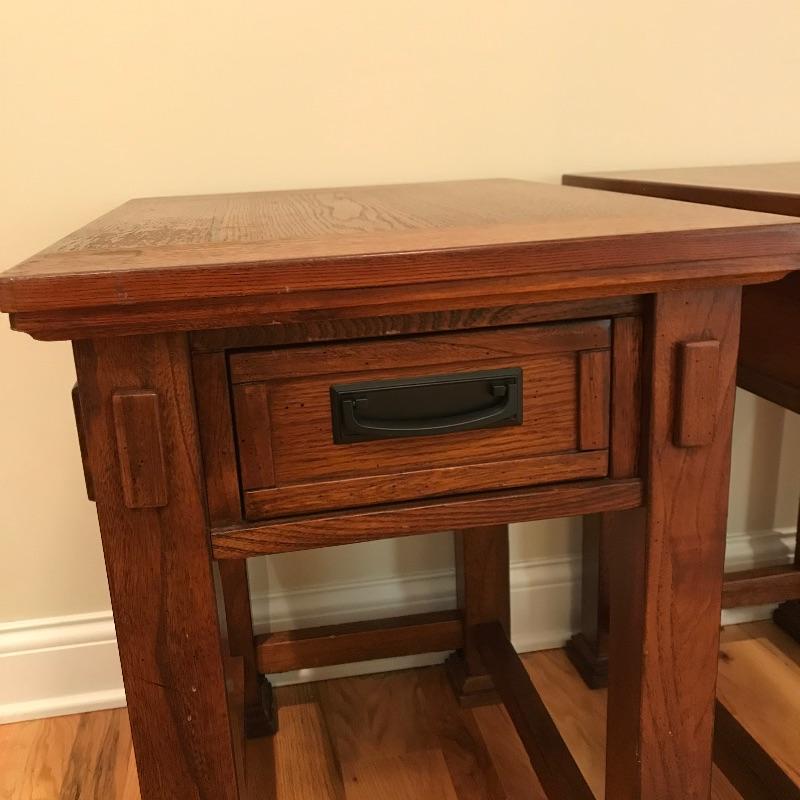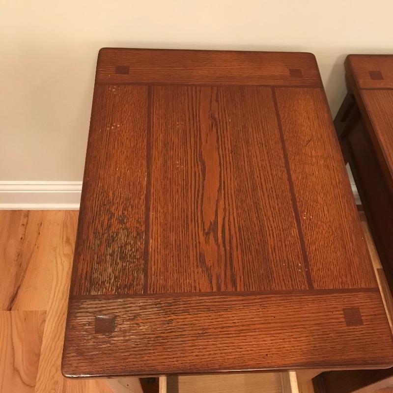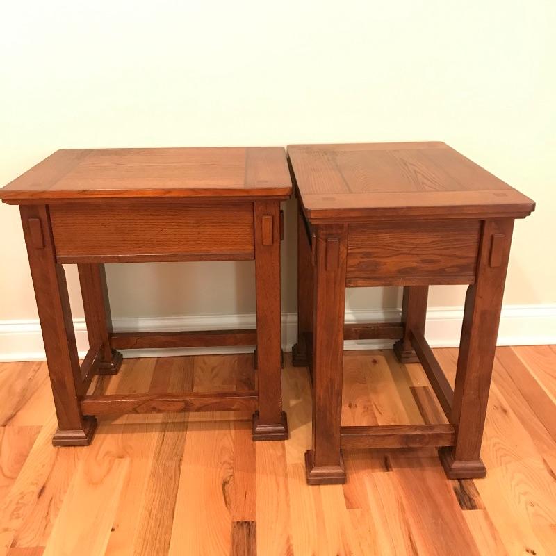Two solid wood side tables with a modern mission style feel. Both tables show wear on top, the table on the left has a raised blemish on the front inlay-like square. These tables have metal pulls and their drawers roll easily on wooden rails. They are lightweight and finished on all sides. Each measures 18” x 25” x 27”. See photos. No shipping.